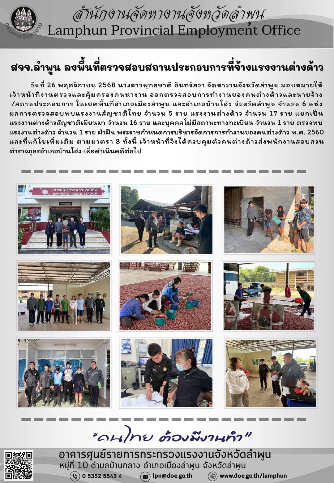 วันที่ 26 พฤศจิกายน 2568 นางสาวพุทธชาติ อินทร์สวา จัดหางานจังหวัดลำพูน มอบหมายให้เจ้าหน้าที่งานตรวจและคุ้มครองคนหางาน ออกตรวจสอบการทำงานของคนต่างด้าวและนายจ้าง /สถานประกอบการ ในเขตพื้นที่อำเภอเมืองลำพูน และอำเภอบ้านโฮ่ง จังหวัดลำพูน จำนวน 6 แห่ง ผลการตรวจสอบพบแรงงานสัญชาติไทย จำนวน 5 ราย แรงงานต่างด้าว จำนวน 17 ราย แยกเป็น แรงงานต่างด้าวสัญชาติเมียนมา จำนวน 16 ราย และบุคคลไม่มีสถานะทางทะเบียน จำนวน 1 ราย ตรวจพบแรงงานต่างด้าว จำนวน 1 ราย ฝ่าฝืน พระราชกำหนดการบริหารจัดการการทำงานของคนต่างด้าว พ.ศ. 2560 และที่แก้ไขเพิ่มเติม ตามมาตรา 8 ทั้งนี้ เจ้าหน้าที่จึงได้ควบคุมตัวคนต่างด้าวส่งพนักงานสอบสวนตำรวจภูธรอำเภอบ้านโฮ่ง เพื่อดำเนินคดีต่อไป