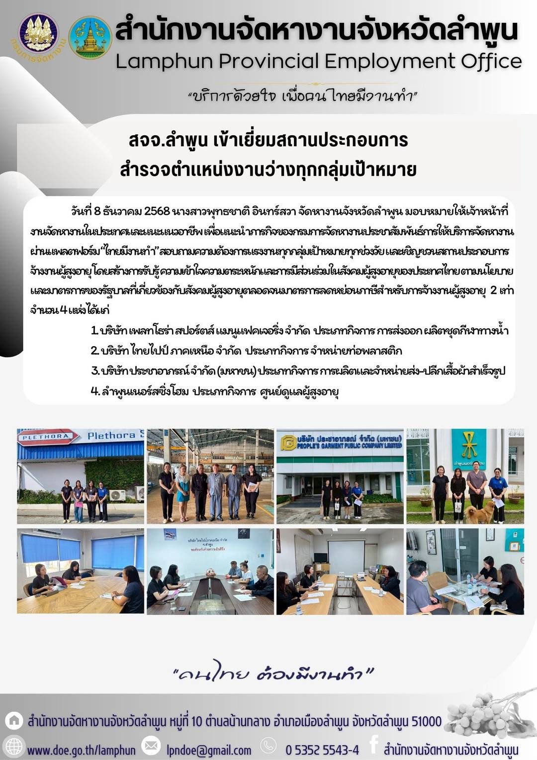วันที่ 8 ธันวาคม 2568 นางสาวพุทธชาติ อินทร์สวา จัดหางานจังหวัดลำพูน มอบหมายให้เจ้าหน้าที่งานจัดหางานในประเทศและแนะแนวอาชีพ เข้าเยี่ยมสถานประกอบการ/นายจ้าง เพื่อแนะนำภารกิจของกรมการจัดหางานประชาสัมพันธ์การให้บริการจัดหางานผ่านแพลตฟอร์ม“ไทยมีงานทำ”สอบถามความต้องการแรงงานทุกกลุ่มเป้าหมาย ทุกช่วงวัย และเชิญชวนสถานประกอบการจ้างงานผู้สูงอายุ โดยสร้างการรับรู้ความเข้าใจความตระหนักและการมีส่วนร่วมในสังคมผู้สูงอายุของประเทศไทย ตามนโยบายและมาตรการของรัฐบาลที่เกี่ยวข้องกับสังคมผู้สูงอายุ ตลอดจนมาตรการลดหย่อนภาษีสำหรับการจ้างงานผู้สูงอายุ 2 เท่า จำนวน 4 แห่ง ได้แก่