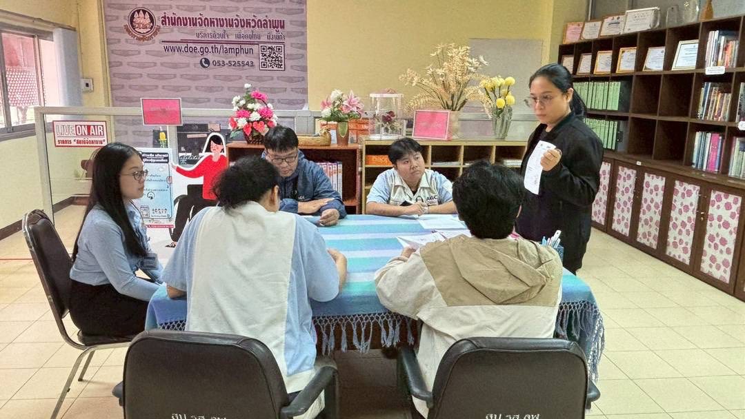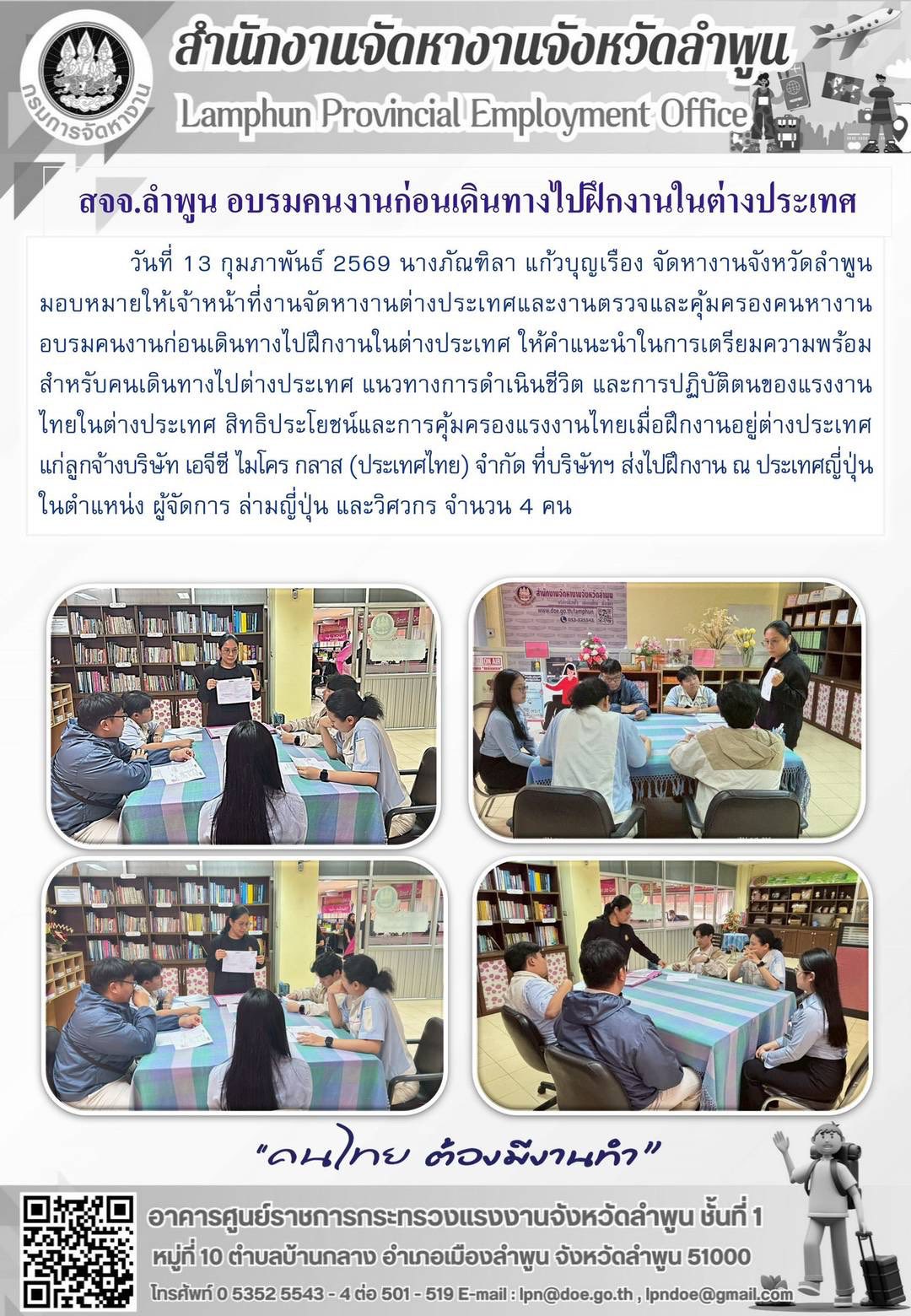 วันที่ 13 กุมภาพันธ์ 2569 นางภัณฑิลา แก้วบุญเรือง จัดหางานจังหวัดลำพูน มอบหมายให้เจ้าหน้าที่งานจัดหางานต่างประเทศและงานตรวจและคุ้มครองคนหางาน อบรมคนงานก่อนเดินทางไปฝึกงานในต่างประเทศ ให้คำแนะนำในการเตรียมความพร้อมสำหรับคนเดินทางไปต่างประเทศ แนวทางการดำเนินชีวิต และการปฏิบัติตนของแรงงานไทยในต่างประเทศ สิทธิประโยชน์และการคุ้มครองแรงงานไทยเมื่อฝึกงานอยู่ต่างประเทศ แก่ลูกจ้างบริษัท เอจีซี ไมโคร กลาส (ประเทศไทย) จำกัด ที่บริษัทฯ ส่งไปฝึกงาน ณ ประเทศญี่ปุ่น ในตำแหน่ง ผู้จัดการ ล่ามญี่ปุ่น และวิศวกร จำนวน 4 คน