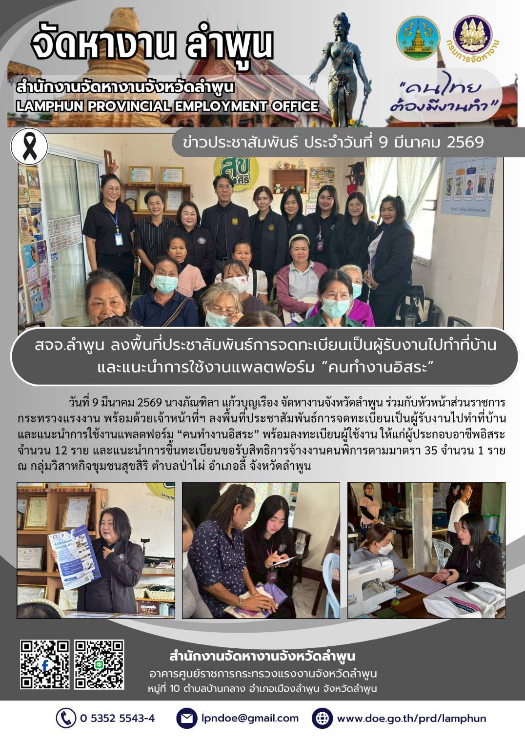 วันที่ 9 มีนาคม 2569 นางภัณฑิลา แก้วบุญเรือง จัดหางานจังหวัดลำพูน ร่วมกับหัวหน้าส่วนราชการกระทรวงแรงงาน และเจ้าหน้าที่ฯ ลงพื้นที่ประชาสัมพันธ์การจดทะเบียนเป็นผู้รับงานไปทำที่บ้าน และแนะนำการใช้งานแพลตฟอร์ม “คนทำงานอิสระ” พร้อมลงทะเบียนผู้ใช้งาน ให้แก่ผู้ประกอบอาชีพอิสระ จำนวน 12 ราย และแนะนำการขึ้นทะเบียนขอรับสิทธิการจ้างงานคนพิการตามมาตรา 35 จำนวน 1 ราย ณ กลุ่มวิสาหกิจชุมชน สุขสิริ ตำบลป่าไผ่ อำเภอลี้ จังหวัดลำพูน