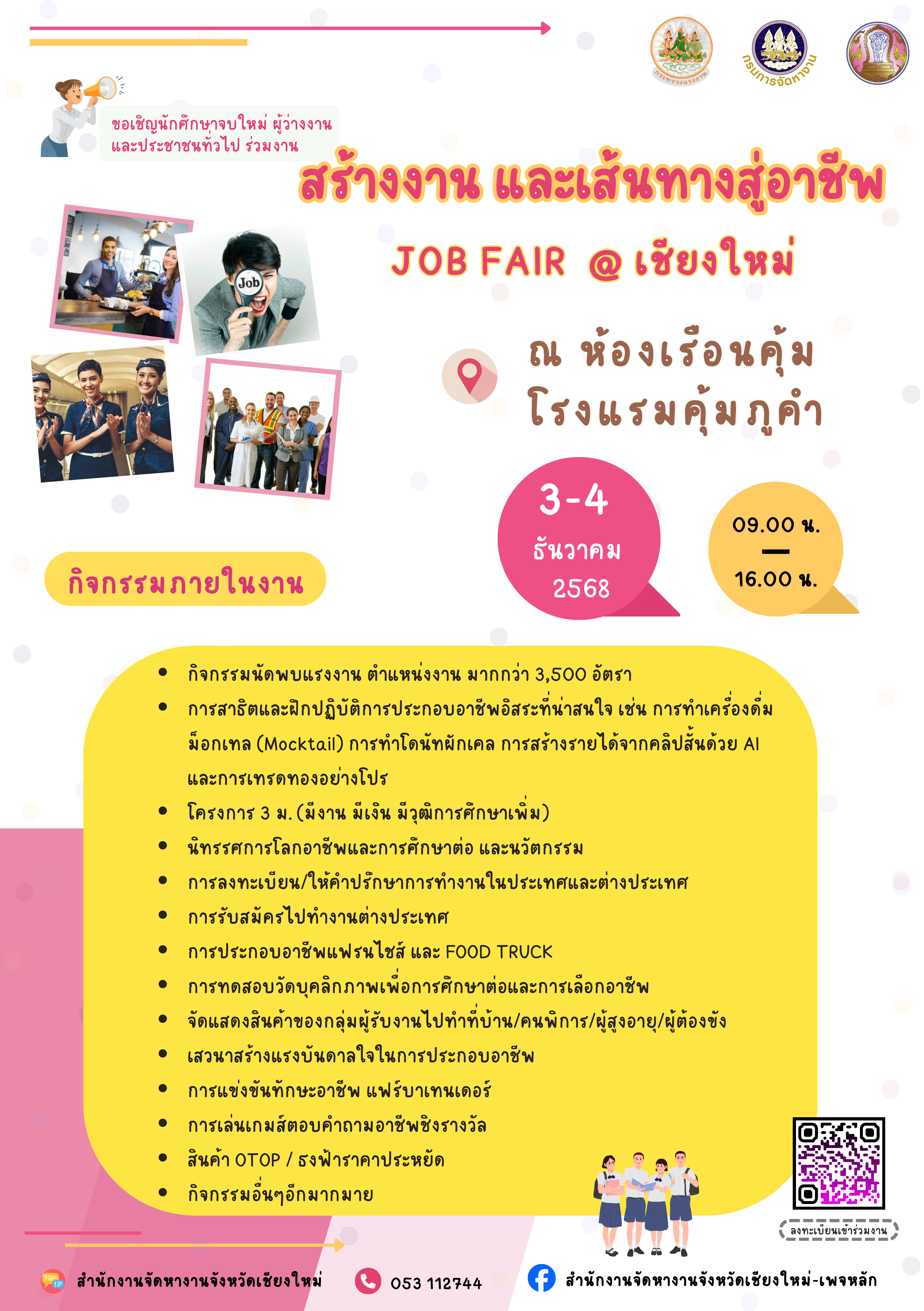 สำนักงานจัดหางานจังหวัดเชียงใหม่ ขอเชิญร่วมงาน สร้างงานและเส้นทางสู่อาชีพ Job Fair @ เชียงใหม่ ในวันที่ 3 - 4 ธันวาคม 2568 ณ โรงแรมคุ้มภูคำ อำเภอเมืองเชียงใหม่ จังหวัดเชียงใหม่