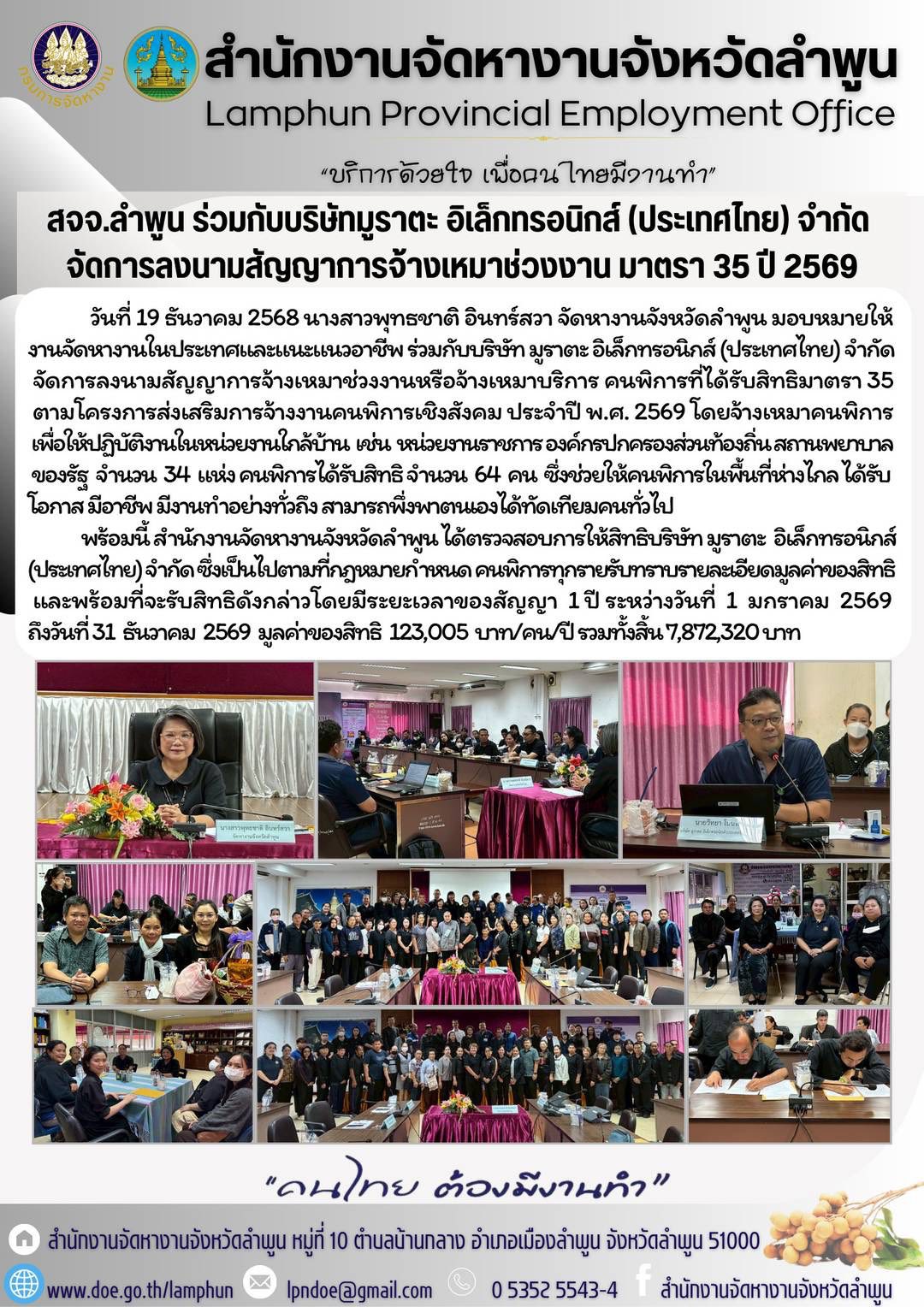 พร้อมนี้ สำนักงานจัดหางานจังหวัดลำพูน ได้ตรวจสอบการให้สิทธิบริษัท มูราตะ อิเล็กทรอนิกส์ (ประเทศไทย) จำกัด ซึ่งเป็นไปตามที่กฎหมายกำหนด คนพิการทุกรายรับทราบรายละเอียดมูลค่าของสิทธิ และพร้อมที่จะรับสิทธิดังกล่าว โดยมีระยะเวลาของสัญญา 1 ปี ระหว่างวันที่ 1 มกราคม 2569 - 31 ธันวาคม 2569 มูลค่าของสิทธิ 123,005 บาท/คน/ปี รวมทั้งสิ้น 7,872,320 บาท