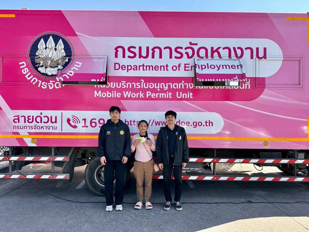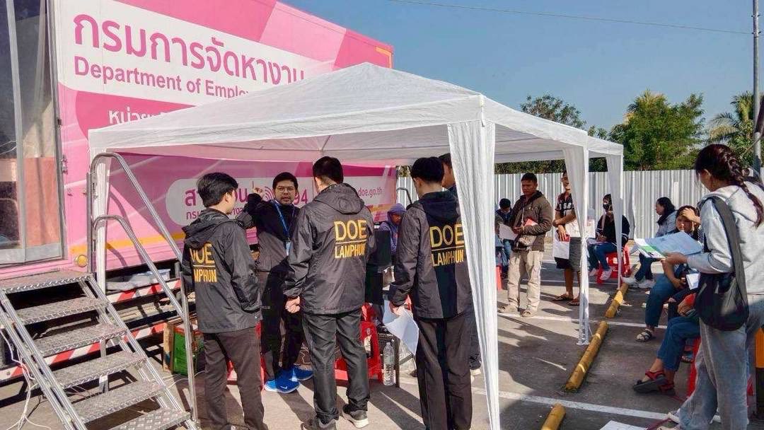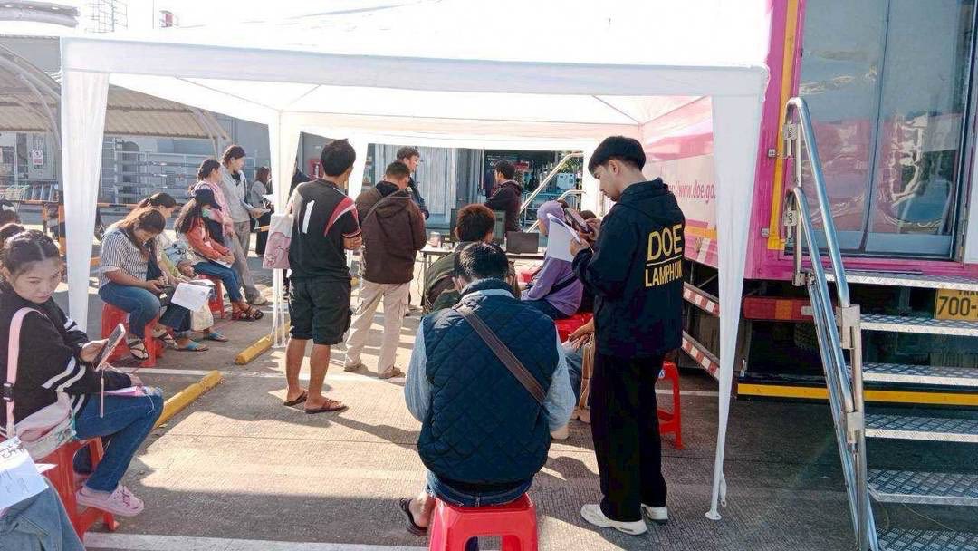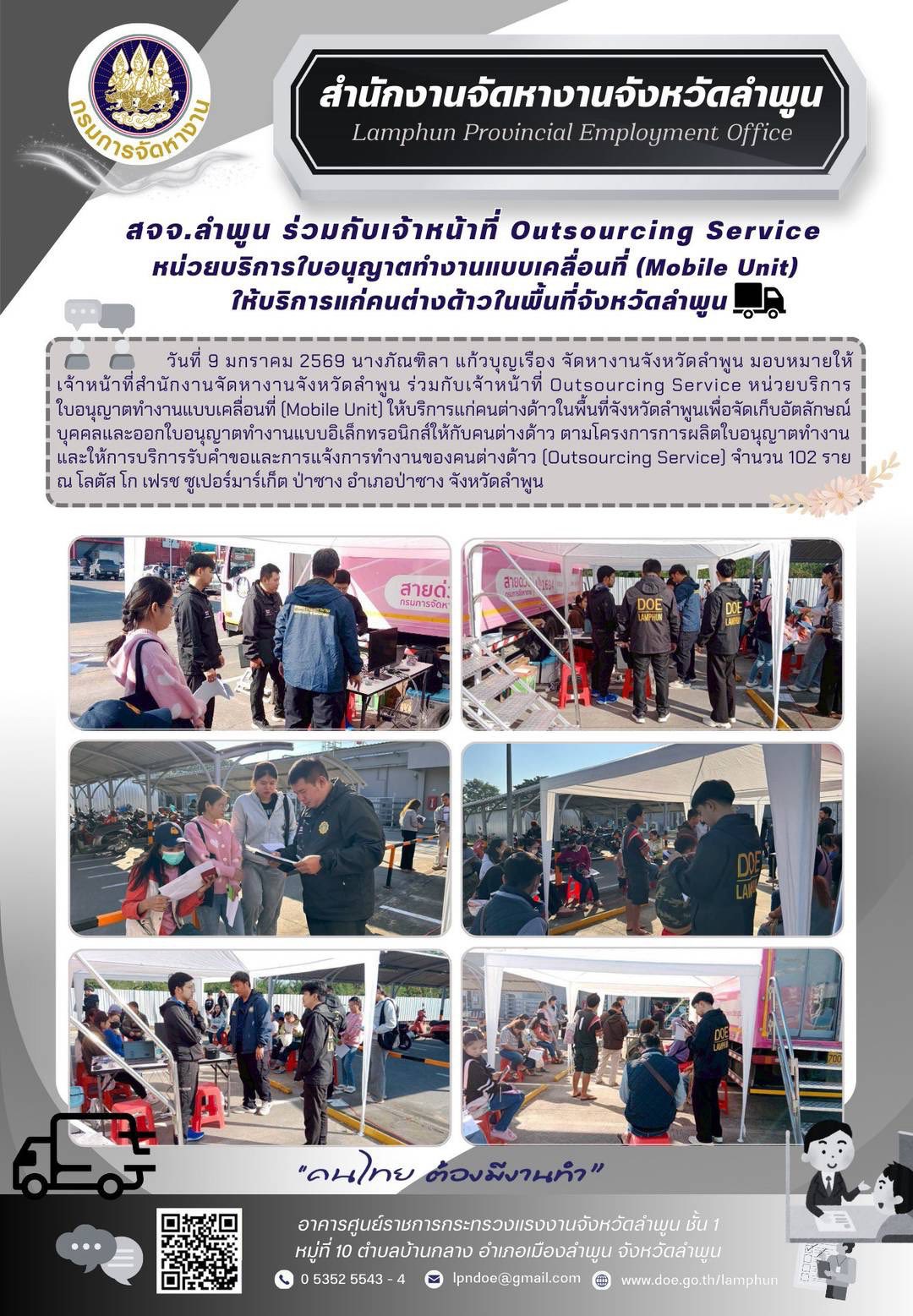 วันที่ 9 มกราคม 2569 นางภัณฑิลา แก้วบุญเรือง จัดหางานจังหวัดลำพูน มอบหมายให้เจ้าหน้าที่สำนักงานจัดหางานจังหวัดลำพูน ร่วมกับเจ้าหน้าที่ Outsourcing Service หน่วยบริการใบอนุญาตทำงานแบบเคลื่อนที่ (Mobile Unit) ให้บริการแก่คนต่างด้าวในพื้นที่จังหวัดลำพูนเพื่อจัดเก็บอัตลักษณ์บุคคลและออกใบอนุญาตทำงานแบบอิเล็กทรอนิกส์ให้กับคนต่างด้าว ตามโครงการการผลิตใบอนุญาตทำงานและให้การบริการรับคำขอและการแจ้งการทำงานของคนต่างด้าว (Outsourcing Service) จำนวน 102 ราย ณ โลตัส โก เฟรช ซูเปอร์มาร์เก็ต ป่าซาง อำเภอป่าซาง จังหวัดลำพูน