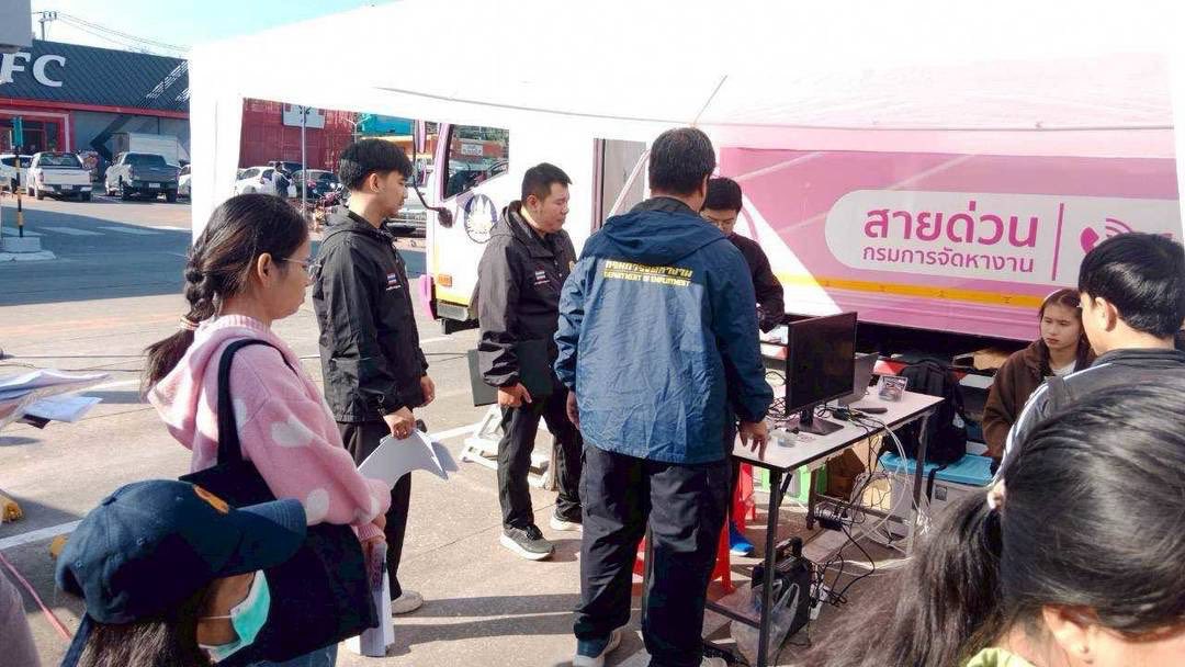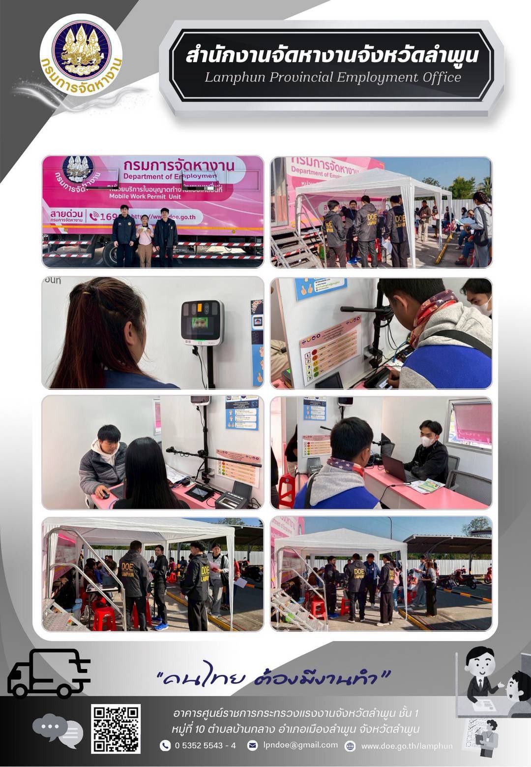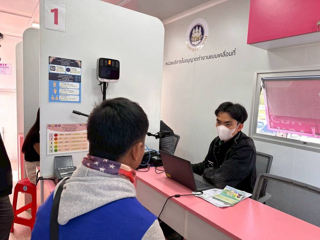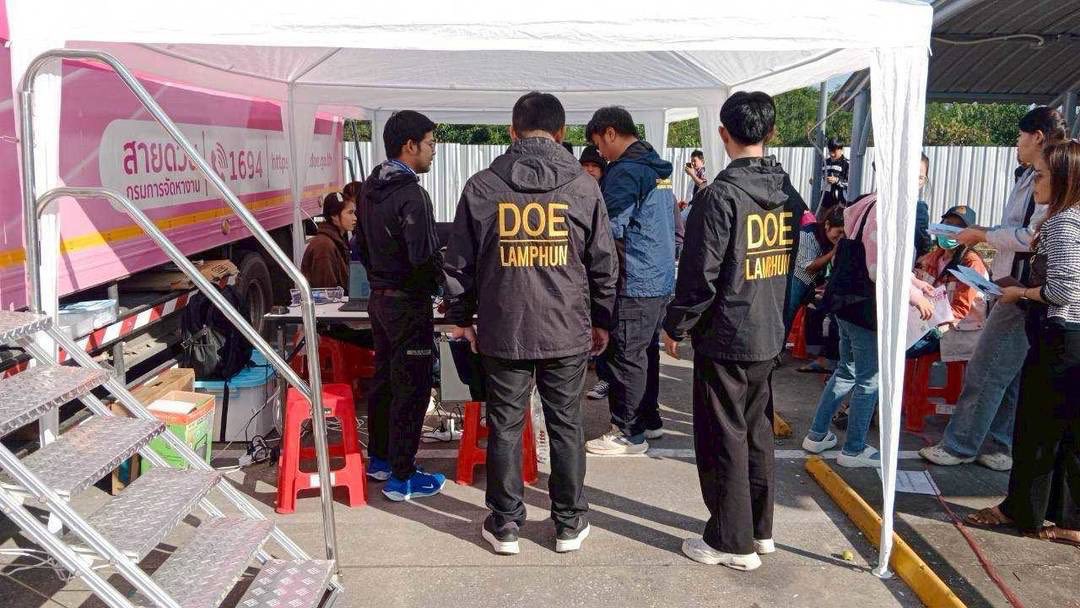 วันที่ 9 มกราคม 2569 นางภัณฑิลา แก้วบุญเรือง จัดหางานจังหวัดลำพูน มอบหมายให้เจ้าหน้าที่สำนักงานจัดหางานจังหวัดลำพูน ร่วมกับเจ้าหน้าที่ Outsourcing Service หน่วยบริการใบอนุญาตทำงานแบบเคลื่อนที่ (Mobile Unit) ให้บริการแก่คนต่างด้าวในพื้นที่จังหวัดลำพูนเพื่อจัดเก็บอัตลักษณ์บุคคลและออกใบอนุญาตทำงานแบบอิเล็กทรอนิกส์ให้กับคนต่างด้าว ตามโครงการการผลิตใบอนุญาตทำงานและให้การบริการรับคำขอและการแจ้งการทำงานของคนต่างด้าว (Outsourcing Service) จำนวน 102 ราย ณ โลตัส โก เฟรช ซูเปอร์มาร์เก็ต ป่าซาง อำเภอป่าซาง จังหวัดลำพูน