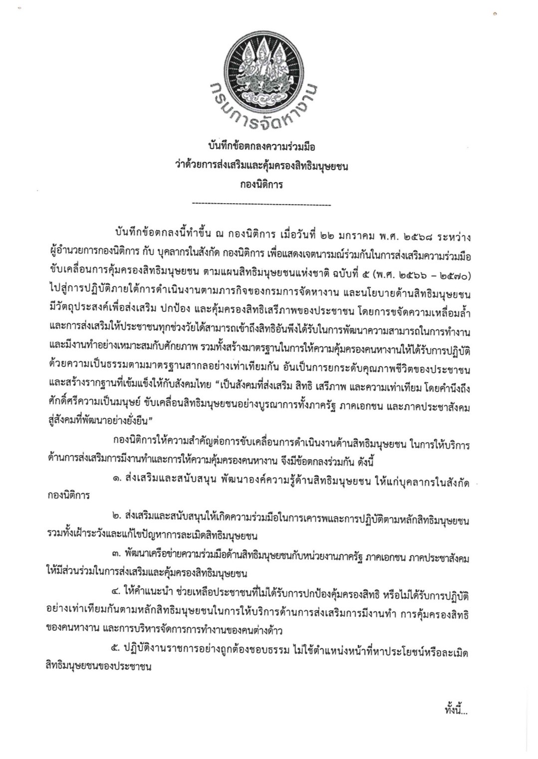 บันทึกข้อตกลงความร่วมมือว่าด้วยการส่งเสริมและคุ้มครองสิทธิมนุษยชน กองนิติการ
