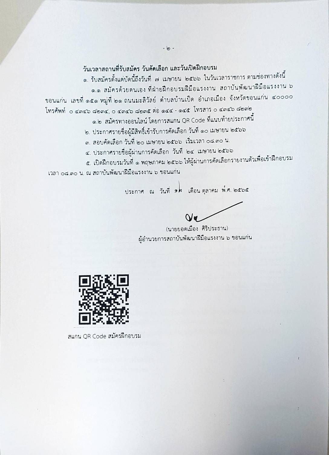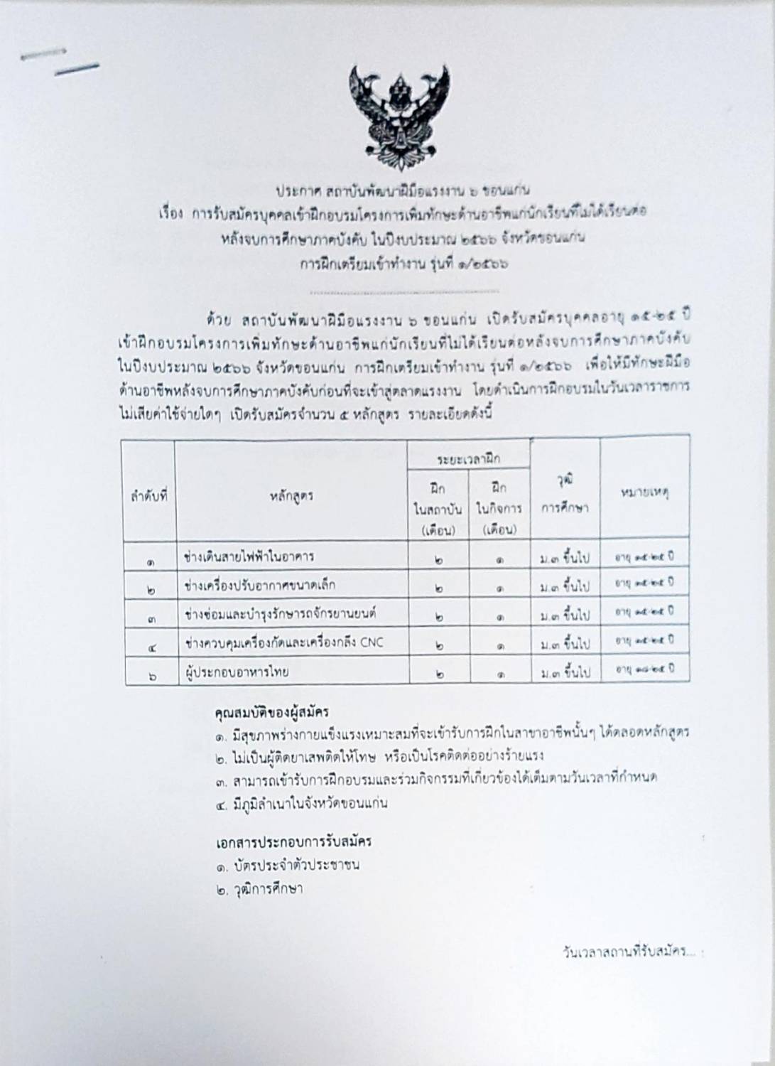 สถาบันพัฒนาฝีมือแรงงาน 6 ขอนแก่น รับสมัครนักเรียนที่ไม่ได้เรียนต่อหลังจบการศึกษาภาคบังคับ อายุตั้งแต่ 15-25 ปี เข้าฝึกอบรมโครงการเพิ่มทักษะด้านอาชีพแก่นักเรียนที่ไม่ได้เรียนต่อหลังจบการศึกษาภาคบังคับ จำนวน 5 หลักสูตร สมัครตั้งแต่บัดนี้ ถึงวันที่ 7 เมษายน 2566