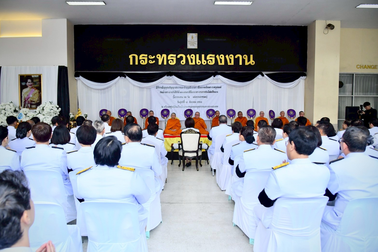 วันที่ 12 ธันวาคม 2568 เวลา 08.00 น. นายสมชาย มรกตศรีวรรณ อธิบดีกรมการจัดหางาน นายมงคล สงคราม รองอธิบดีกรมการจัดหางาน ร่วมพิธีบำเพ็ญกุศล และทำบุญตักบาตร เพื่อถวายเป็นพระราชกุศลแด่สมเด็จพระนางเจ้าสิริกิติ์ พระบรมราชินีนาถ พระบรมราชชนนีพันปีหลวง ในวาระครบ 50 วัน (ปัญญาสมวาร) แห่งการสวรรคต โดยมีนางสาวตรีนุช เทียนทอง รัฐมนตรีว่าการกระทรวงแรงงาน เป็นประธาน พร้อมด้วยพันตำรวจโท วรรณพงษ์ คชรักษ์ ปลัดกระทรวงแรงงาน พร้อมด้วยผู้บริหาร ข้าราชการ และเจ้าหน้าที่กระทรวงแรงงาน เข้าร่วมพิธี ณ บริเวณศูนย์ส่งเสริมพัฒนาการบุตรของบุคลากรกระทรวงแรงงาน และลานด้านหน้าศาลาพระพุทธสุทธิธรรมบพิตร