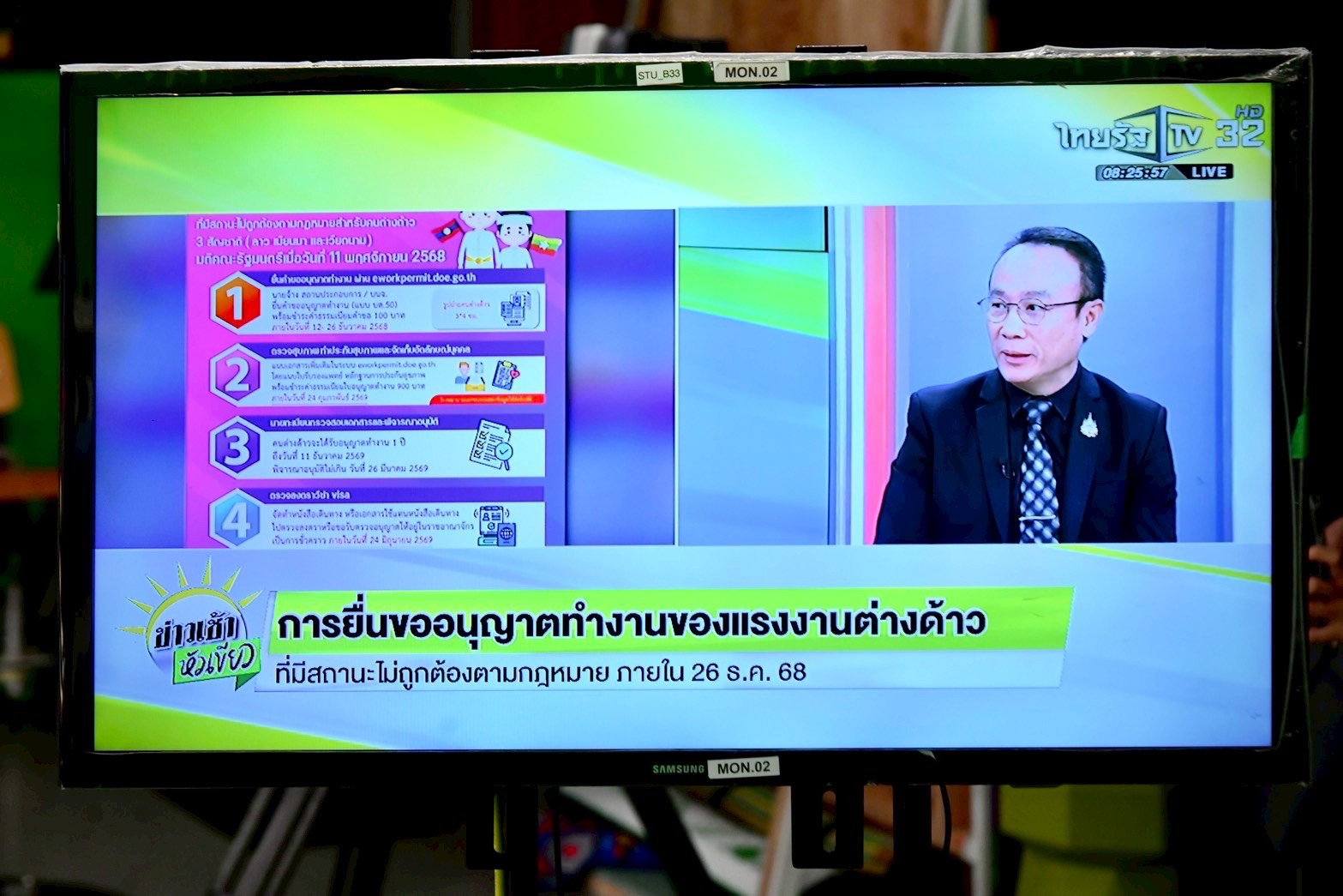 วันที่ 25 ธันวาคม 2568 เวลา 08.00 น. นายสมชาย มรกตศรีวรรณ อธิบดีกรมการจัดหางาน ให้สัมภาษณ์รายการ “ข่าวเช้าหัวเขียว” ทางไทยรัฐทีวี ช่อง 32 ประเด็น “การยื่นขออนุญาตทำงานของแรงงานต่างด้าว ที่มีสถานะไม่ถูกต้องตามกฎหมาย ภายใน 26 ธันวาคม 2568” ณ สถานีโทรทัศน์ไทยรัฐทีวี ถนนวิภาวดีรังสิต เขตจตุจักร กรุงเทพฯ