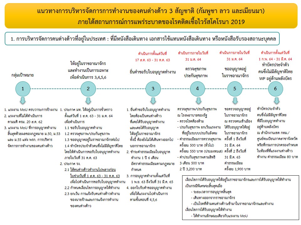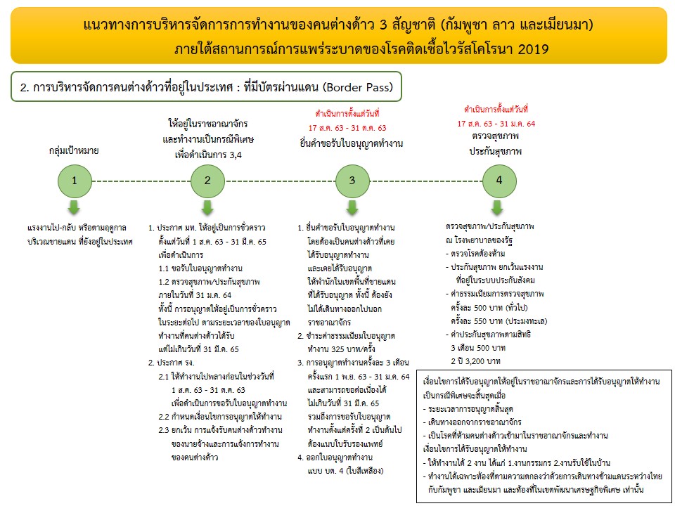 แรงงานต่างด้าวกลุ่มที่ 1 – 3 จะต้องยื่นขอรับใบอนุญาตทำงาน กับกรมการจัดหางาน ตั้งแต่วันที่ 17 สิงหาคม 2563 ถึงวันที่ 31 ตุลาคม 2563 และดำเนินการตามขั้นตอนอื่นๆ ที่เกี่ยวข้อง ได้แก่ การตรวจสุขภาพ/ซื้อประกันสุขภาพ การขอตรวจลงตราอนุญาตให้อยู่ในราชอาณาจักร (Visa) และการทำบัตรประจำตัวคนซึ่งไม่มีสัญชาติไทย (บัตรสีชมพู) จะได้รับอนุญาตให้ทำงานได้ถึงวันที่ 31 มีนาคม 2565 ส่วนแรงงานต่างด้าวที่เข้ามาทำงานโดยใช้บัตรผ่านแดน (Border Pass) จะต้องยื่นขอรับใบอนุญาตทำงาน กับกรมการจัดหางาน ตั้งแต่วันที่ 17 สิงหาคม 2563 ถึงวันที่ 31 ตุลาคม 2563 และตรวจสุขภาพ/ซื้อประกันสุขภาพ โดยใบอนุญาตทำงานมีอายุครั้งละ 3 เดือน แต่สามารถขอต่อเนื่องได้ไม่เกินวันที่ 31 มีนาคม 2565