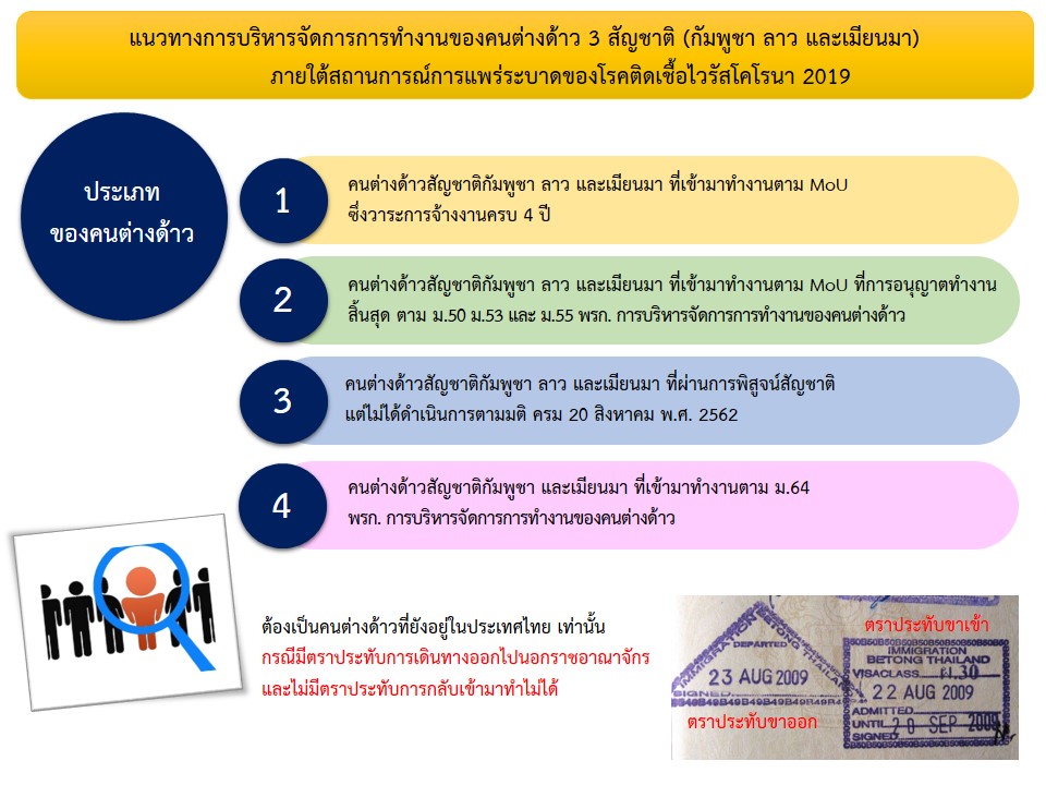 สำหรับกลุ่มแรงงานต่างด้าวสัญชาติกัมพูชา ลาว และเมียนมา ภายหลังสถานการณ์การแพร่ระบาดของโรคโควิด – 19 ให้แรงงานต่างด้าว 4 กลุ่ม ที่เคยมีใบอนุญาตทำงาน แต่การอนุญาตสิ้นสุด และไม่สามารถเดินทางกลับออกไปนอกราชอาณาจักร เนื่องจากมาตรการปิดจุดผ่านแดน เพื่อป้องกันการแพร่ระบาดของโรคโควิด – 19 ให้สามารถอยู่ในราชอาณาจักรได้เป็นการชั่วคราว และให้ทำงานได้เป็นกรณีพิเศษ