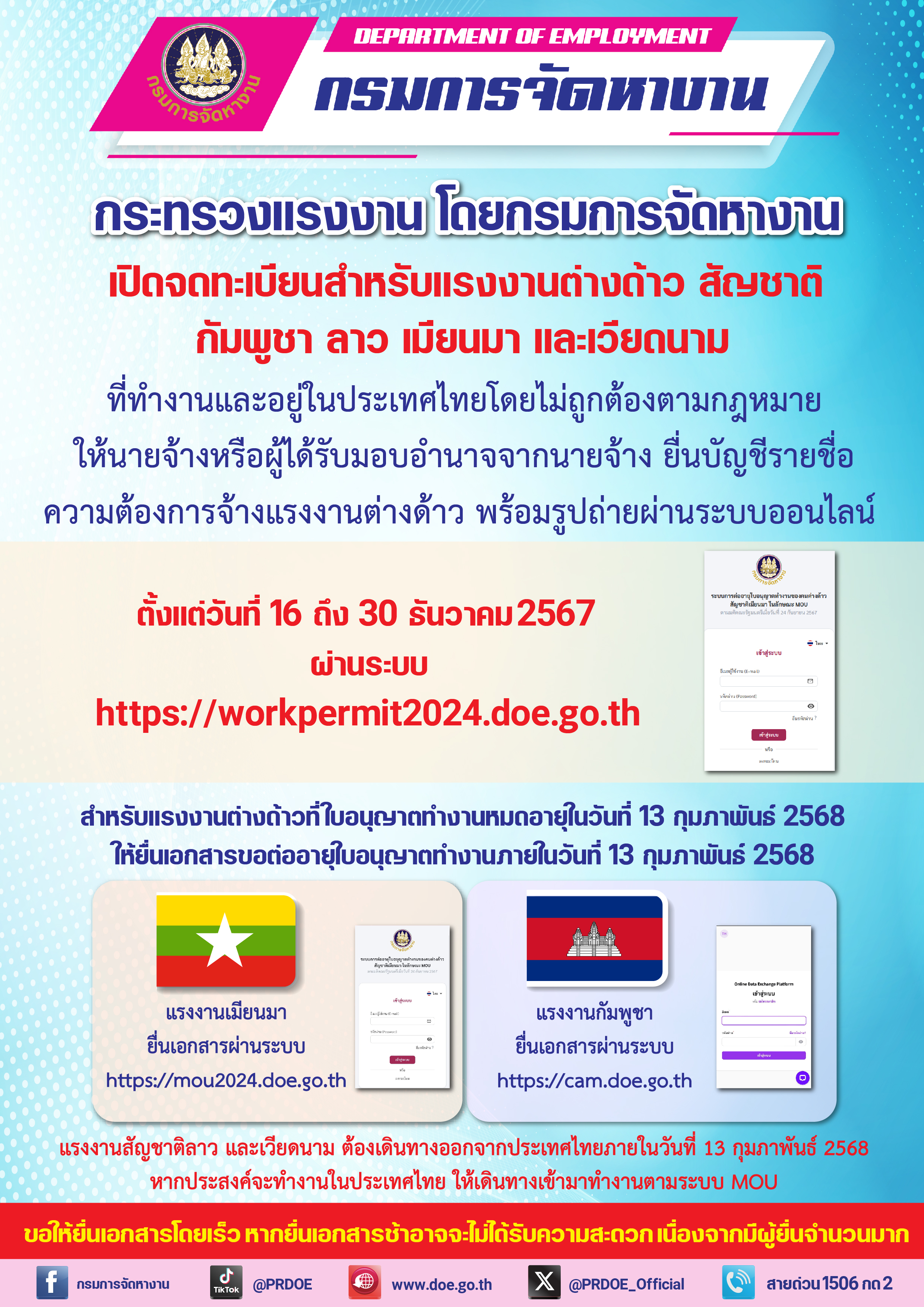 ### ที่ทำงานและอยู่ในประเทศไทยโดยไม่ถูกต้องตามกฎหมายให้นายจ้างหรือผู้ได้รับมอบอำนาจจากนายจ้าง ยื่นบัญชีรายชื่อความต้องการจ้างแรงงานต่างด้าว พร้อมรูปถ่ายผ่านระบบออนไลน์