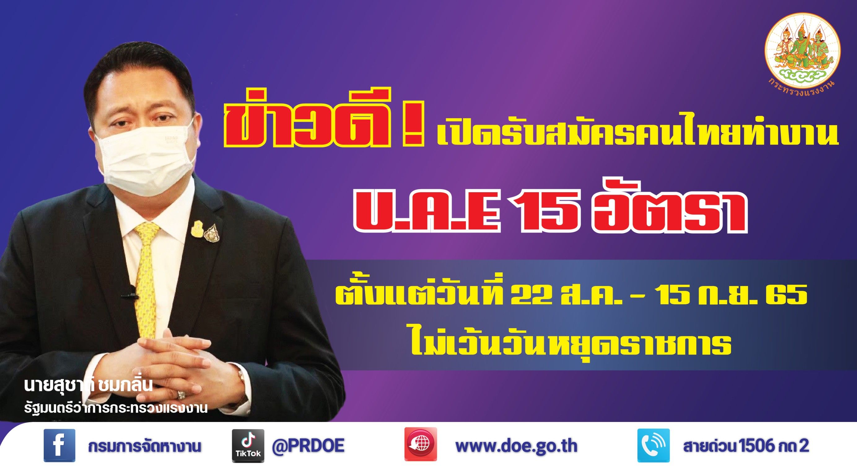กระทรวงแรงงาน โดยกรมการจัดหางาน เปิดรับสมัครคนหางานเพื่อไปทำงานประเทศสหรัฐอาหรับเอมิเรตส์ (U.A.E) จำนวน 15 อัตรา ระยะเวลาจ้างงาน 3 ปี ฟรีค่าโดยสารเครื่องบินไป-กลับ อาหาร 3 มื้อ สมัครได้ตั้งแต่วันที่ 22 ส.ค. - 15 ก.ย. 65 ไม่เว้นวันหยุดราชการ