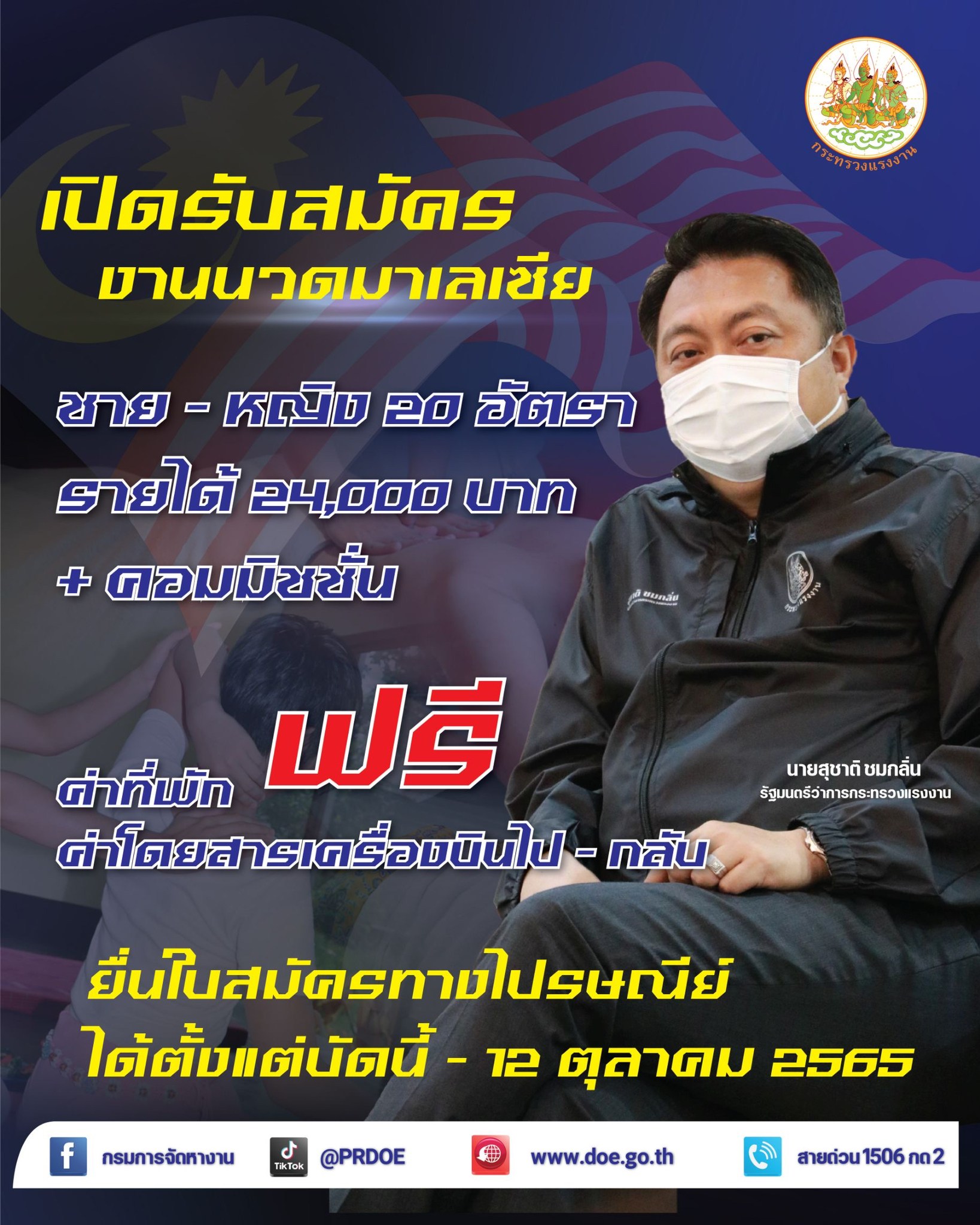 นายสุชาติ ชมกลิ่น รัฐมนตรีว่าการกระทรวงแรงงาน เปิดเผยว่า กระทรวงแรงงาน โดยกรมการจัดหางานเปิดรับสมัครคนหางานเพื่อไปทำงานกับนายจ้างบริษัท Energy Haven Sdn. Bhd. ประเทศมาเลเซีย ซึ่งประกอบกิจการร้านนวด จำนวน 20 อัตรา ตำแหน่งพนักงานนวด มีระยะเวลาจ้างงาน 2 ปี และสามารถเลือกต่ออายุได้อีก 2 ปี โดยนายจ้างจะจัดหาที่พัก อุปกรณ์ประกอบอาหาร จ่ายค่าโดยสารเครื่องบินไป-กลับ เมื่อทำงานครบสัญญาการจ้างงานทุก ๆ 2 ปี พร้อมประกันคุ้มครองการบาดเจ็บ สำหรับแรงงานต่างชาติขององค์การประกันสังคม (SOCSO) และประกันสุขภาพ (SPIKPA) ตามที่รัฐบาลประเทศมาเลเซียกำหนด ระหว่างระยะเวลาของสัญญาจ้าง ซึ่งผู้สนใจสามารถยื่นใบสมัครทางไปรษณีย์ลงทะเบียนด่วนพิเศษ (EMS) ได้ตั้งแต่วันที่ 12 กันยายน – 12 ตุลาคม 2565 โดยไม่เว้นวันหยุดราชการ