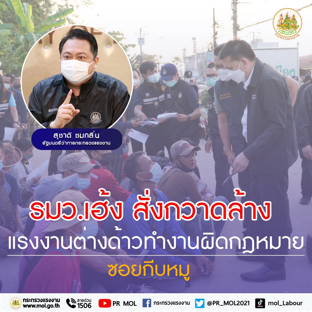 นายสุชาติฯ กล่าวว่า พล.อ. ประยุทธ์ จันทร์โอชา นายกรัฐมนตรี และพล.อ.ประวิตร วงษ์สุวรรณ รองนายกรัฐมนตรี ซึ่งกำกับดูแลกระทรวงแรงงาน ให้ความสำคัญกับการบริหารจัดการการทำงานของคนต่างด้าวสัญชาติกัมพูชา ลาว เมียนมา และเวียดนาม เพื่อรองรับการฟื้นฟูประเทศภายหลังการผ่อนคลายมาตรการป้องกันและควบคุมโรคติดเชื้อไวรัสโคโรนา 2019 อย่างยิ่ง เนื่องจากแรงงานต่างด้าวเป็นฟันเฟืองสำคัญในการขับเคลื่อนกิจการในประเทศไทย ซึ่งกระทรวงแรงงานได้มีการออกมติครม.ในวาระต่าง ๆ เพื่อป้องกันปัญหาขาดแคลนแรงงานต่างด้าวเรื่อยมา โดยล่าสุดได้มีมติเห็นชอบ เมื่อวันที่ 5 ก.ค. 65 ให้กลุ่มคนต่างด้าวสัญชาติกัมพูชา ลาว เมียนมา และเวียดนาม ที่ยังมี “สถานะไม่ถูกต้อง” แต่ประสงค์จะทำงานอย่างถูกต้อง ดำเนินการตามขั้นตอนที่กำหนด เพื่อสามารถอยู่และทำงานในประเทศไทยได้ไม่เกิน 13 ก.พ. 68 อย่างไรก็ตามการบริหารจัดการแรงงานต่างด้าวที่เข้ามาทำงานในประเทศไทย ต้องคำนึงถึงโอกาสในการประกอบอาชีพของคนไทย ความมั่นคงของชาติ ตลอดจนป้องกันการค้ามนุษย์ด้านแรงงานหรือบังคับใช้แรงงาน จึงเป็นที่มาของการลงพื้นที่ซอยกีบหมูในวันนี้