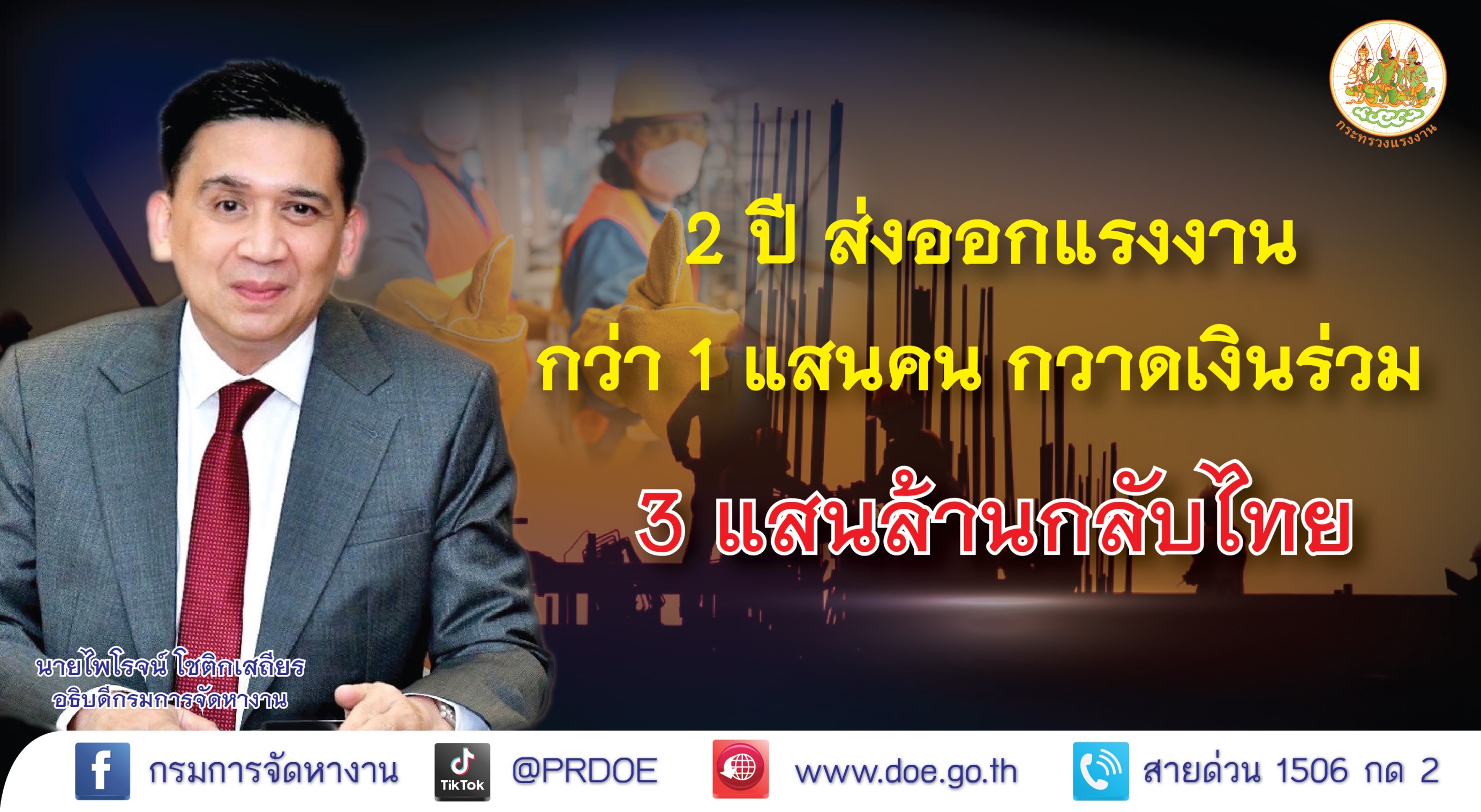นายไพโรจน์ โชติกเสถียร อธิบดีกรมการจัดหางาน เปิดเผยว่า หลังสถานการณ์การแพร่ระบาดของโรคโควิด คลี่คลาย กิจกรรมทางเศรษฐกิจทั่วโลกกลับมาสู่สภาพปกติ ตลาดแรงงานในต่างประเทศ มีความต้องการแรงงานเป็นจำนวนมาก ซึ่งแรงงานไทยโดยเฉพาะแรงงานประเภทฝีมือ และกึ่งฝีมือนับเป็นแรงงานคุณภาพที่นายจ้างในต่างประเทศต้องการตัว เนื่องจากแรงงานไทยมีทักษะฝีมือดี ขยัน มีน้ำใจ จนเป็นที่ยอมรับ โดยในปี 2565 และปี 2566 กรมการจัดหางานมีการอนุญาตให้แรงงานไทยเดินทางไปทำงานต่างประเทศ ทั้งสิ้น 113,186 คน แยกเป็นปี 2565 จำนวน 88,164 คน และปี 2566 (ณ เดือนมีนาคม)จำนวน 25,022 คน โดยประเทศที่แรงงานไทยเดินทางไปทำงานมากที่สุด 5 ลำดับแรก ได้แก่ ไต้หวัน สาธารณรัฐเกาหลี อิสราเอล ญี่ปุ่น และมาเลเซีย ตามลำดับ ซึ่งรายได้ที่แรงงานไทยในต่างประเทศส่งกลับบ้าน ผ่านระบบธนาคารแห่งประเทศไทย มีมูลค่าถึง 299,077 ล้านบาท