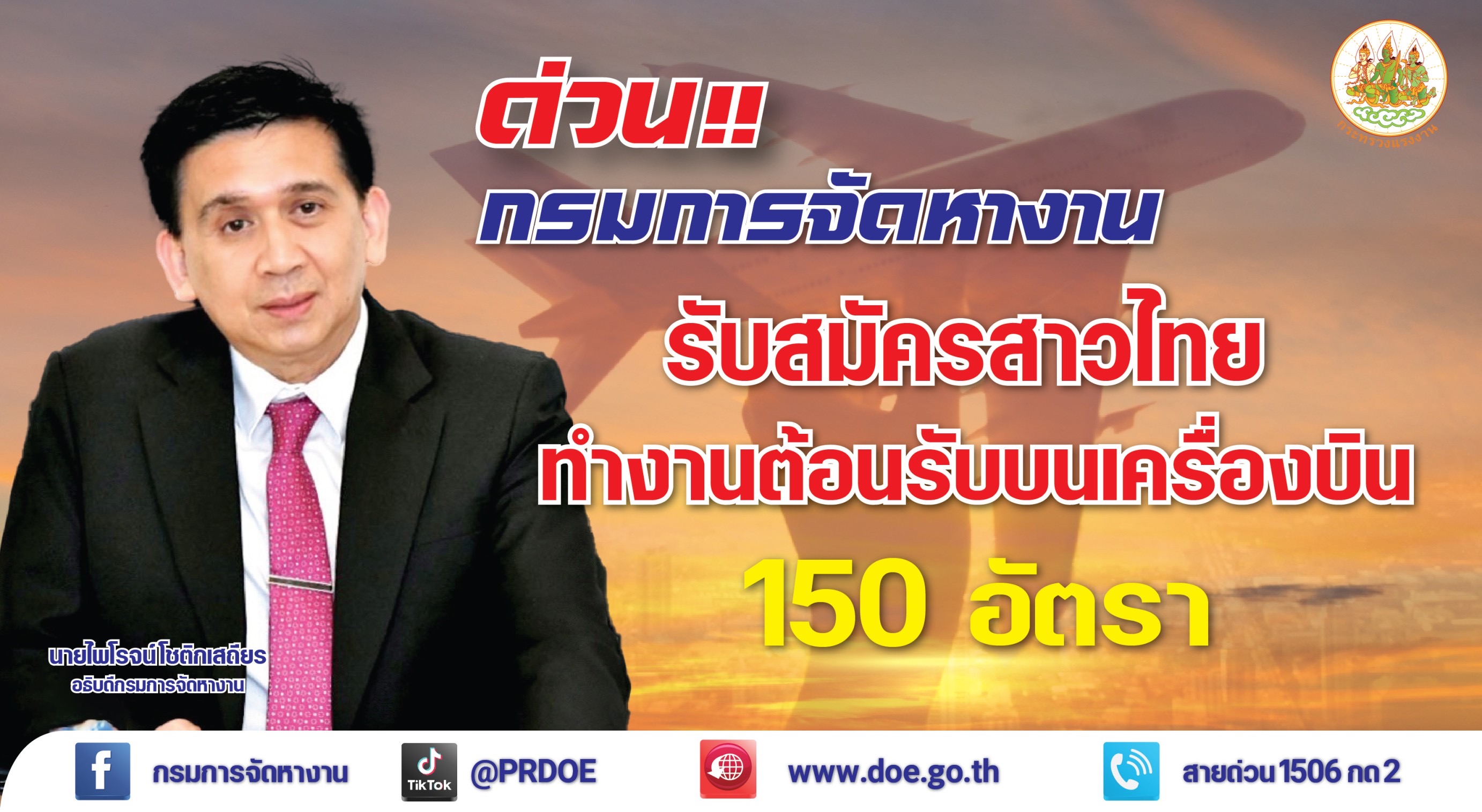 กรมการจัดหางาน กระทรวงแรงงาน เปิดรับสมัครพนักงานต้อนรับบนเครื่องบินเพื่อไปทำงานในประเทศสิงคโปร์ จำนวน 150 อัตรา เงินเดือน 36,956 บาท (ไม่รวมค่าล่วงเวลา) ฟรีค่าโดยสารเครื่องบินไป - กลับ อาหาร ที่พัก และสวัสดิการอื่นๆ ตามกฎหมายสิงคโปร์ รับสมัครตั้งแต่บัดนี้ถึง 31 กรกฎาคม 2566