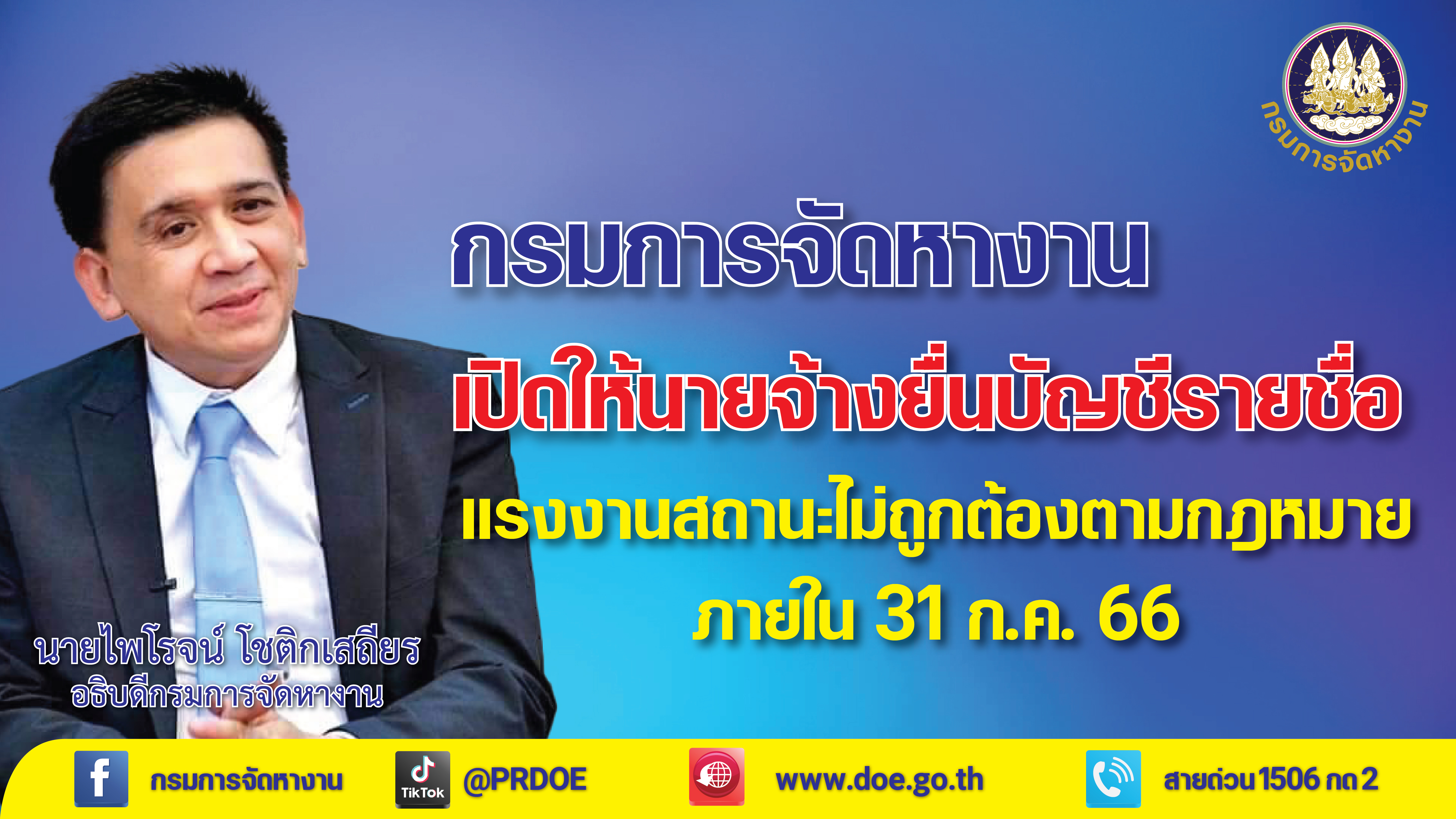 กรมการจัดหางานเปิดยื่นบัญชีรายชื่อความต้องการจ้างคนต่างด้าวที่มีสถานะไม่ถูกต้องตามกฎหมาย ตามมติครม.วันที่ 5 กรกฎาคม 2566 ผ่านช่องทางออนไลน์ และสำนักงาน ย้ำนายจ้างต้องดำเนินการ ภายใน 31 กรกฎาคม 2566
