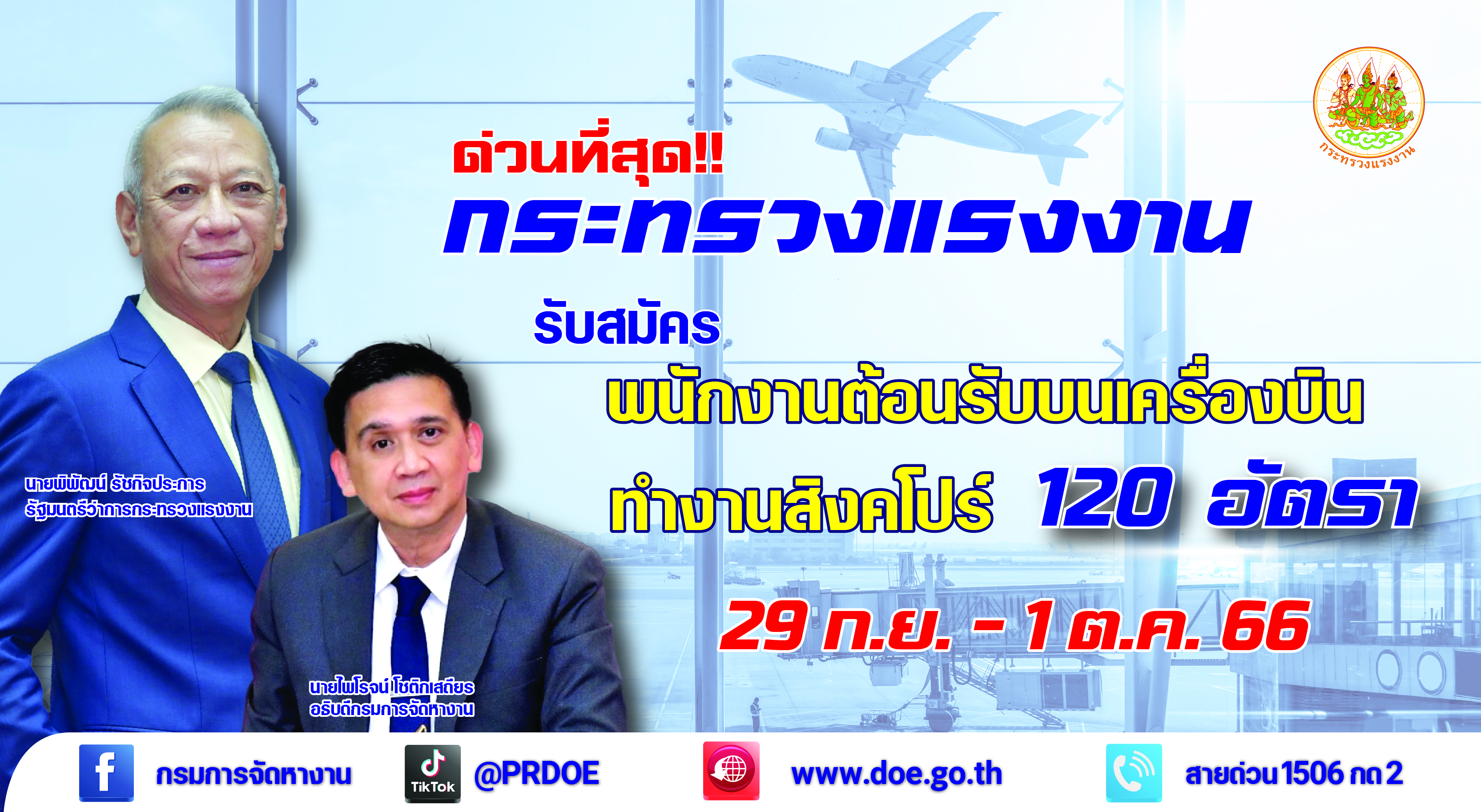 กรมการจัดหางาน กระทรวงแรงงาน เปิดรับสมัครพนักงานต้อนรับบนเครื่องบินเพื่อไปทำงานในประเทศสิงคโปร์ จำนวน 120 อัตรา เงินเดือน 30,126 บาท (ไม่รวมค่า OT) ฟรีค่าโดยสารเครื่องบินไป – กลับ รับสมัครตั้งแต่บัดนี้ถึง 1 ต.ค. 66