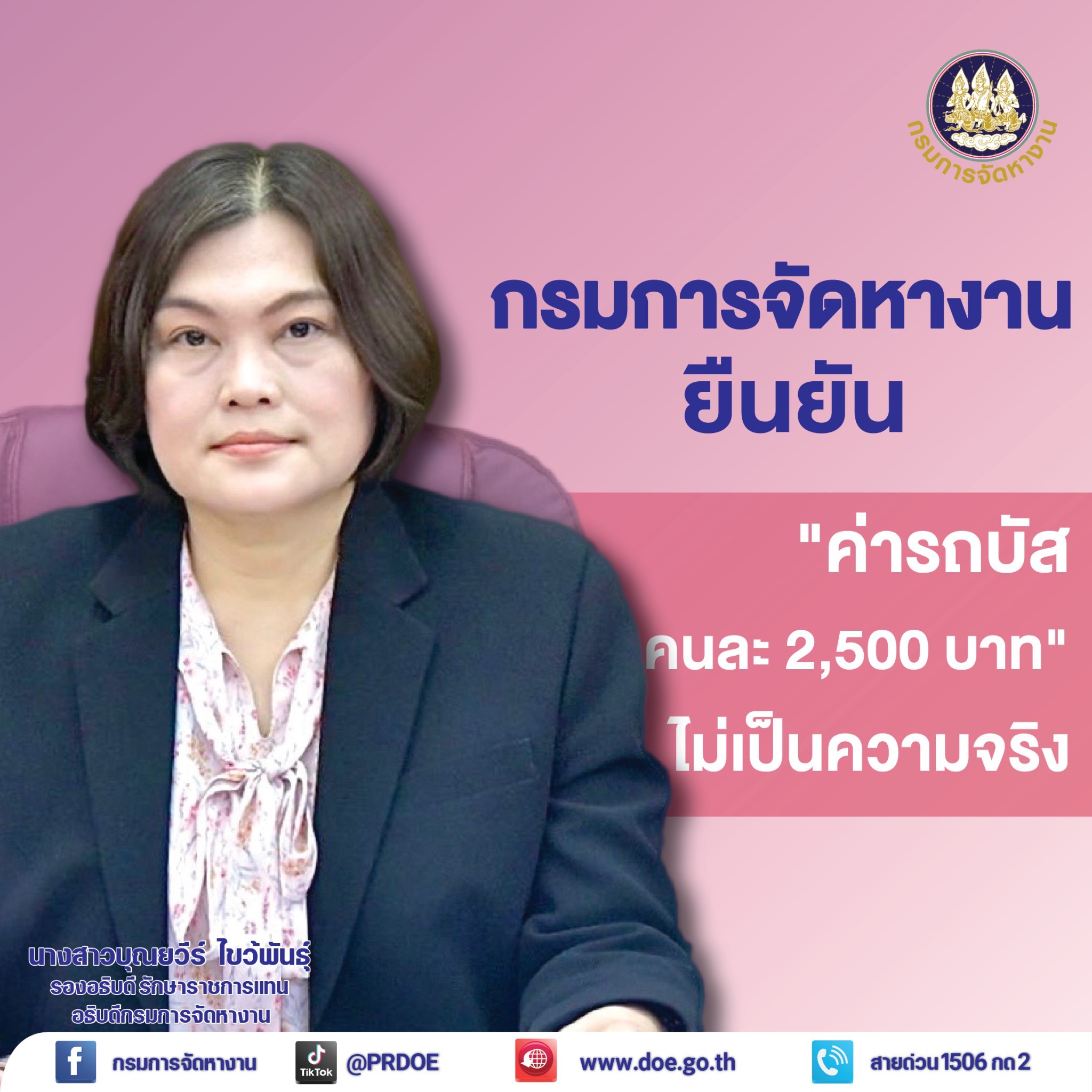 นางสาวบุณยวีร์ ไขว้พันธุ์ รองอธิบดี รักษาราชการแทนอธิบดีกรมการจัดหางาน เปิดเผยว่า จากกรณีสื่อออนไลน์ ให้ข้อมูล เรื่องค่าใช้จ่ายในการไปทำงานที่อิสราเอล ของกรมการจัดหางาน เก็บค่ารถไปสนามบินสุวรรณภูมิคนละ 2,500 บาท นั้น กรมการจัดหางานขอยืนยันว่าไม่เป็นความจริง โดยการเดินทางไปทำงานประเทศอิสราเอล ภายใต้โครงการ "ความร่วมมือไทย – อิสราเอลเพื่อการจัดหางาน” (TIC) มีการเก็บค่าใช้จ่ายเฉพาะที่จำเป็น ประมาณ 71,020 บาท (ขึ้นอยู่กับอัตราแลกเปลี่ยน) ดังนี้