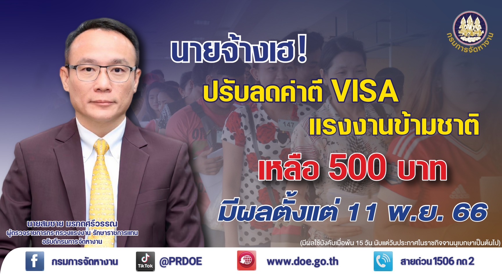 นายสมชาย มรกตศรีวรรณ ผู้ตรวจราชการกระทรวงแรงงาน รักษาราชการแทนอธิบดีกรมการจัดหางาน เปิดเผยว่า หลังจากคณะรัฐมนตรีมีมติเมื่อวันที่ 3 ตุลาคม 2566 เห็นชอบให้ปรับลดอัตราค่าธรรมเนียมการตรวจลงตรา ในอัตรา 500 บาทต่อครั้ง (ไม่เกิน 2 ปี) จากอัตราเดิมครั้งละ 2,000 บาท และค่าธรรมเนียมคำขออนุญาตอยู่ต่อในราชอาณาจักร ในอัตรา 500 บาทต่อครั้ง (ไม่เกิน 2 ปี) จากอัตราเดิมครั้งละ 1,900 บาท สำหรับแรงงานข้ามชาติที่เข้ามาทำงานในราชอาณาจักร ตามบันทึกความเข้าใจว่าด้วยความร่วมมือด้านการจ้างแรงงาน หรือได้รับอนุญาตให้เข้ามาอยู่ในราชอาณาจักรเป็นกรณีพิเศษ ล่าสุดได้มีการประกาศในราชกิจจานุเบกษา เมื่อวันที่ 27 ตุลาคม 2566 แล้ว โดยจะเริ่มมีผลบังคับใช้เมื่อพ้น 15 วัน นับแต่วันที่ประกาศ ซึ่งตรงกับวันที่ 11 พฤศจิกายน 2566 และให้กฎกระทรวงใช้บังคับได้ เป็นระยะเวลา 4 ปี โดยมุ่งหวังให้ผู้ประกอบการและนายจ้างที่จำเป็นต้องพึ่งพาแรงงาน 4 สัญชาติที่เข้ามาทำงานตาม MOU หรือกลุ่มแรงงานข้ามชาติที่เข้าสู่ระบบการทำงานตามมติครม.ในคราวต่างๆ มีแรงงานเพียงพอกับสภาพเศรษฐกิจ สามารถขับเคลื่อนธุรกิจทั้งภาคการผลิตสินค้า ภาคการบริการ และภาคการส่งออก รวมทั้งเป็นการสร้างความสัมพันธ์อันดีกับประเทศเพื่อนบ้าน ส่งเสริมให้แรงงานข้ามชาติเข้าสู่ระบบการทำงานถูกต้องตามกฎหมาย เพื่อรักษาความมั่นคงของประเทศ