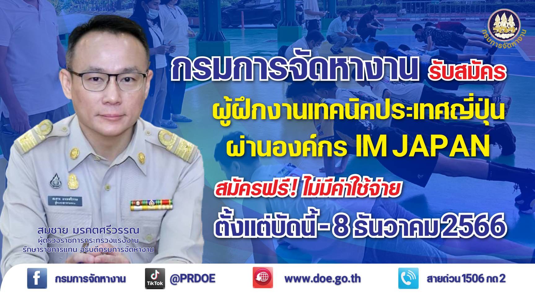 กรมการจัดหางาน รับสมัคร ผู้ฝึกงานเทคนิคในประเทศญี่ปุ่น ประเภทงานอุตสาหกรรมการผลิตและอุตสาหกรรมก่อสร้าง ผ่านองค์กร IM Japan ปี 2567 ครั้งที่ 1 สมัครทางออนไลน์ ฟรี! ไม่มีค่าใช้จ่าย ตั้งแต่บัดนี้ – 8 ธันวาคม 2566 ฝึกครบ 3 ปี แถมเงินกลับบ้าน 1.4 แสนบาท
