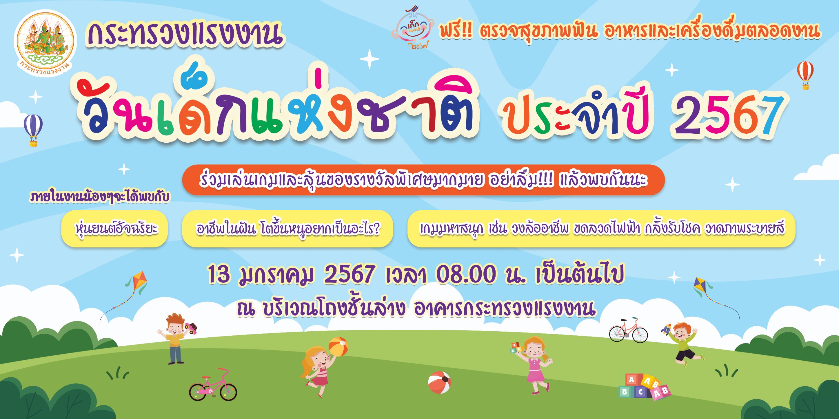 ที่สำคัญต่อการขับเคลื่อนการพัฒนาเศรษฐกิจและสังคมของประเทศในอนาคต ในปีนี้กระทรวงแรงงาน จึงได้ร่วมกับสมาคมแม่บ้านกระทรวงแรงงาน สถานประกอบการภาคเอกชน จัดกิจกรรมฉลองวันเด็กเเห่งชาติประจำปี 2567 ของกระทรวงแรงงานขึ้นในวันเสาร์ที่ 13 มกราคมนี้ เริ่มตั้งแต่เวลา 08.00 น.เป็นต้นไป ณ บริเวณโถงชั้นล่าง อาคารกระทรวงแรงงาน ดังคำขวัญวันเด็กแห่งชาติ ประจำปี 2567 ที่นายเศรษฐา ทวีสิน นายกรัฐมนตรี มอบไว้ว่า "มองโลกกว้าง คิดสร้างสรรค์ เคารพความแตกต่าง ร่วมกันสร้างประชาธิปไตย”เพื่อเปิดโอกาสให้เด็กๆและเยาวชน ได้สนุกสนานสร้างสรรค์ ตลอดจนเรียนรู้เรื่องราวต่าง ๆ ผ่านบูธกิจกรรมของหน่วยงานในสังกัดกระทรวงแรงงานและสถานประกอบการภาคเอกชนที่เข้าร่วมภายในบริเวณกระทรวงแรงงาน ซึ่งรัฐมนตรีว่าการกระทรวงแรงงาน จะให้เกียรติเป็นประธานในพิธีเปิดและมอบของขวัญให้กับน้องๆ เด็กๆ ที่มาร่วมกิจกรรมกับกระทรวงแรงงานในครั้งนี้ด้วยตนเอง