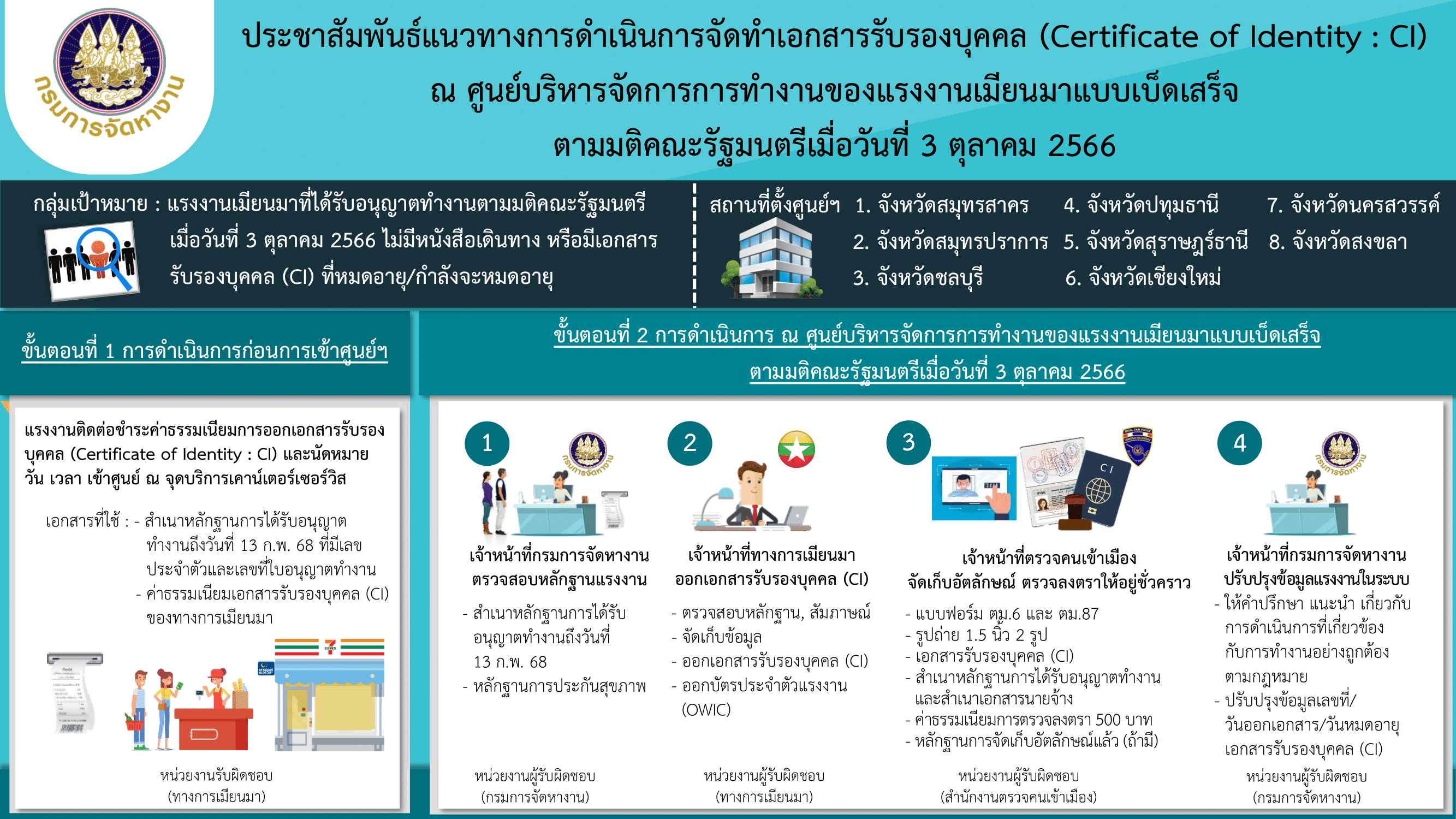 แนวทางการดำเนินการจัดทำเอกสารรับรองบุคคล (Certificate of Identity : CI) Certificate of Identity : CI) ณ ศูนย์บริหารจัดการการทำงานของแรงงานเมียนมาแบบเบ็ดเสร็จตามมติคณะรัฐมนตรีเมื่อวันที่ 3ตุลาคม 2566