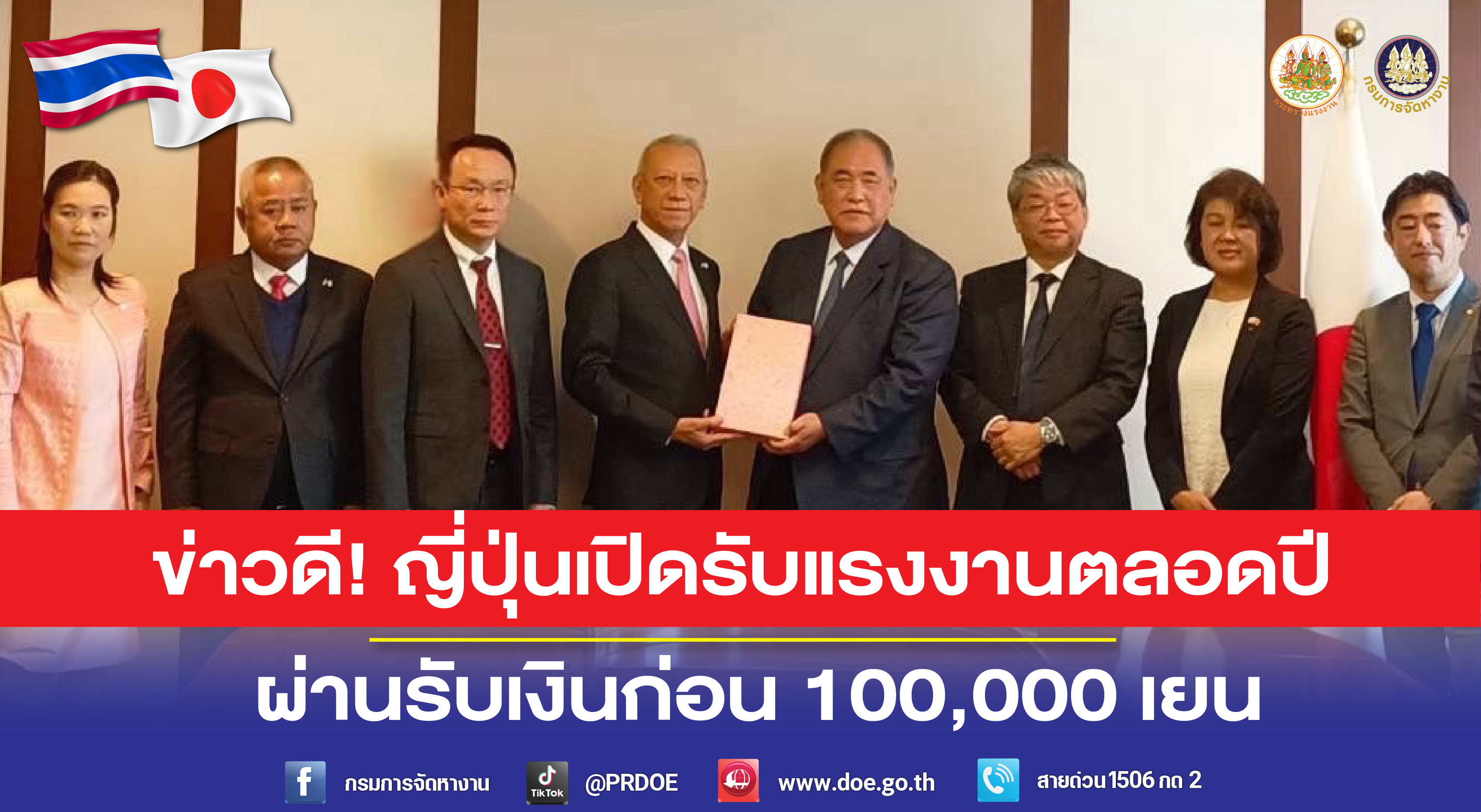 ธันวาคม 2567 โดยผู้ที่สนใจสามารถสมัครสอบได้ที่เว็บไซต์ toea.doe.go.th คุณสมบัติเบื้องต้นเปิดรับเพศชาย อายุ 18 - 30 ปี จบการศึกษาระดับมัธยมศึกษาปีที่ 6 ขึ้นไป ผู้ที่ผ่านการคัดเลือกฯ เดือนแรกจะได้รับเบี้ยเลี้ยง 80,000 เยน ค่าที่พัก ค่าน้ำ - ค่าไฟ ฟรี เดือนที่ 2 ถึงเดือนที่ 36 จะได้ค่าจ้างไม่น้อยกว่าอัตราค่าจ้างขั้นต่ำที่กฎหมายญี่ปุ่นกำหนด หรือประมาณ 41,000 บาทต่อเดือน ไม่รวมค่าทำงานล่วงเวลา เมื่อฝึกครบตามกำหนด จะได้รับประกาศนียบัตรรับรองการฝึกงาน และเงินสนับสนุนการประกอบอาชีพ จำนวน 600,000 เยน เพื่อเป็นค่าใช้จ่ายในการประกอบอาชีพเมื่อเดินทางกลับประเทศไทย รวมรายได้จากการทำงานตลอด 3 ปี ประมาณ 1.6 ล้านบาท