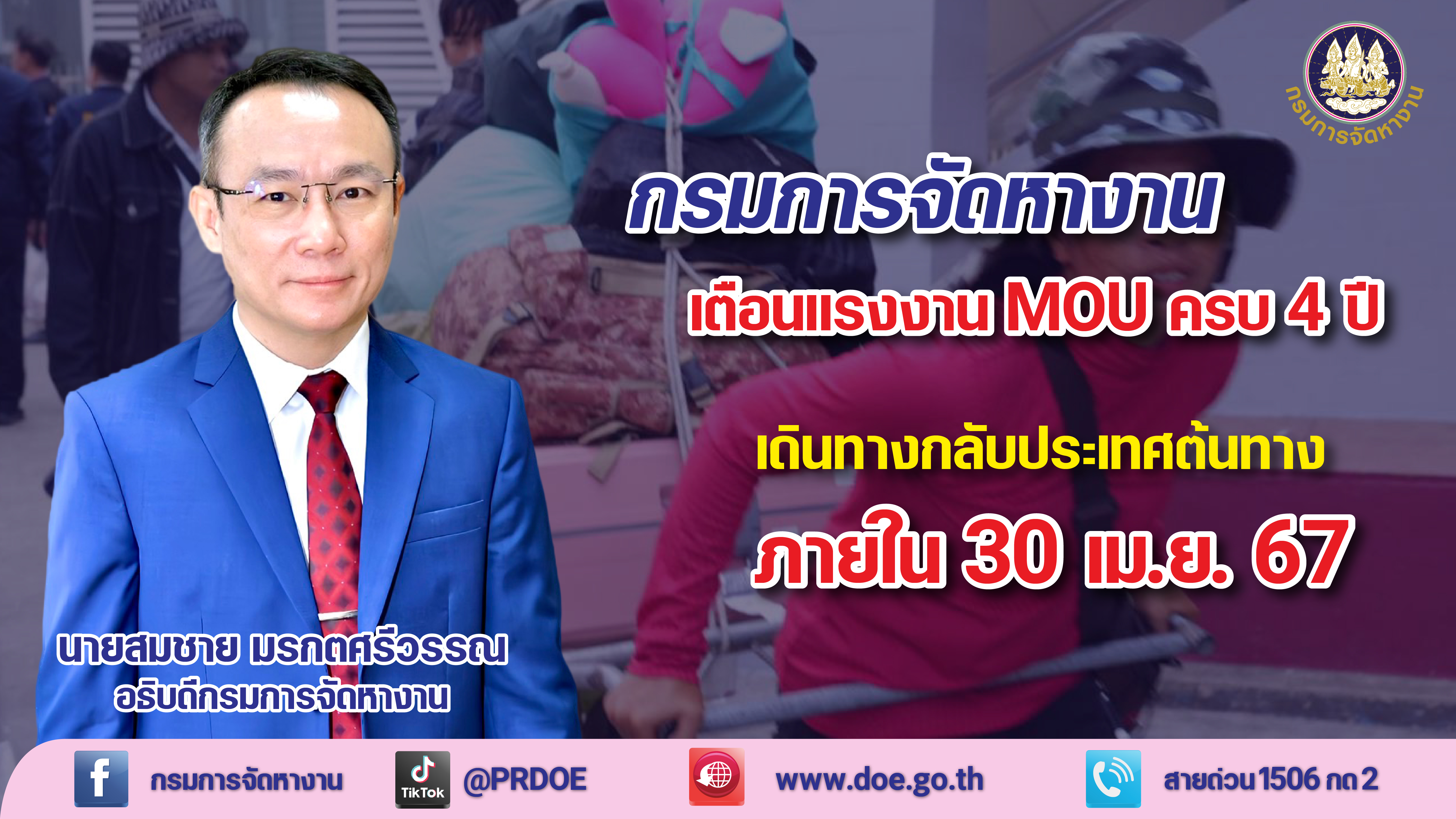 นายสมชาย มรกตศรีวรรณ อธิบดีกรมการจัดหางาน เปิดเผยว่า แรงงาน 3 สัญชาติ กัมพูชา ลาว และเมียนมา ที่เข้ามาทำงานตามบันทึกความเข้าใจว่าด้วยความร่วมมือด้านแรงงาน (MOU) จะได้รับอนุญาตทำงาน 2 ปี ต่ออายุได้อีกไม่เกิน 2 ปี และเมื่อครบกำหนดระยะเวลา 4 ปีแล้วต้องเดินทางกลับประเทศต้นทาง กรมการจัดหางานจึงขอประชาสัมพันธ์ให้พี่น้องแรงงาน 3 สัญชาติ ที่เข้ามาทำงานตามระบบ MOU ซึ่งวาระการจ้างงานครบ 4 ปี ระหว่างวันที่ 1 พฤศจิกายน 2563 - 31 ธันวาคม 2566เดินทางกลับประเทศต้นทางภายในวันที่ 30 เมษายน 2567 (มติครม. 3 ต.ค. 66 ในส่วน MOU ครบ 4 ปีขึ้นไป) รวมถึงแรงงานที่เข้ามาทำงานตาม MOU ซึ่งวาระการจ้างงานครบ 4 ปี ตั้งแต่วันที่ 1 มกราคม 2567 เป็นต้นไป ต้องเดินทางกลับประเทศต้นทาง ก่อนที่การอนุญาตให้อยู่ในราชอาณาจักรเป็นการชั่วคราวสิ้นสุด (วีซ่าหมดอายุ) หากอยู่เกินกำหนดอนุญาตให้อยู่ในราชอาณาจักร (over stay) จะมีความผิดตามกฎหมายคนเข้าเมือง โดยนายจ้าง/ผู้ประกอบการสามารถยื่นคำร้องขอนำคนต่างด้าวมาทำงานกับนายจ้างในประเทศ (นจ. 2) ได้ล่วงหน้า หากประสงค์จะนำแรงงานดังกล่าวกลับเข้ามาทำอีกครั้ง เพื่อลดระยะเวลาดำเนินการ ณ ประเทศ ต้นทาง