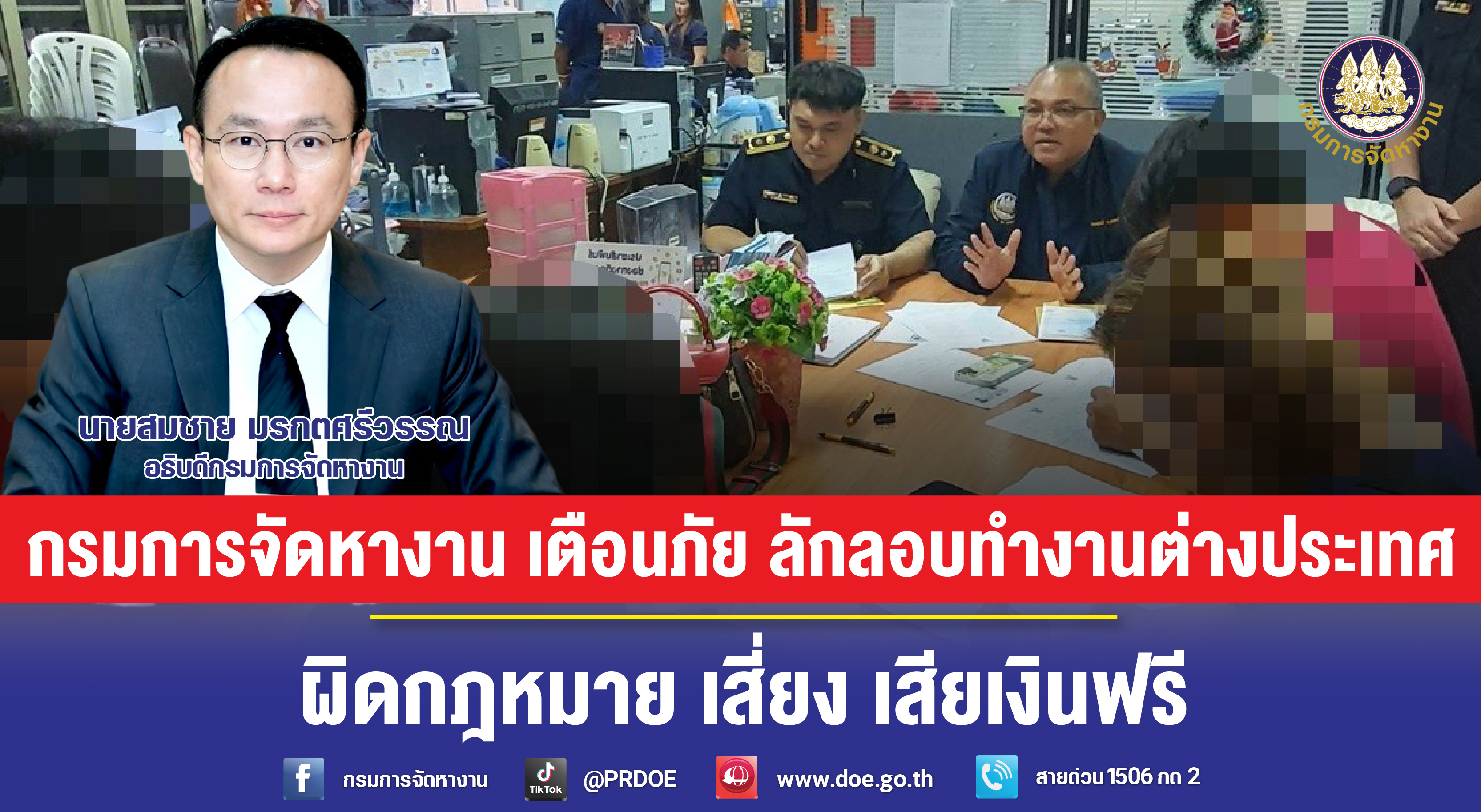 นายสมชาย มรกตศรีวรรณ อธิบดีกรมการจัดหางาน เปิดเผยว่า กรมการจัดหางานได้รับการร้องทุกข์จากกลุ่มคนหางาน จำนวน 5 ราย กรณีถูกกลุ่มสาย/นายหน้าจัดหางานเถื่อนใช้ช่องทางไลน์แอปพลิเคชัน ร่วมกันหลอกลวงว่า สามารถส่งไปทำงานที่ประเทศนิวซีแลนด์ ในตำแหน่งคนงานเกษตร พนักงานตกแต่งภายใน และพนักงานนวด ทำให้ผู้เสียหายสูญเงินคนละ 90,000 – 150,000 บาท รวมค่าเสียหายทั้งสิ้น 562,500 บาท โดยอ้างว่ามีนายจ้างคนไทยอยู่ที่ประเทศนิวซีแลนด์เป็นผู้ดูแล ให้เดินทางด้วยวีซ่าท่องเที่ยวก่อน หลังจากถึงประเทศนิวซีแลนด์แล้วจะเปลี่ยนเป็นวีซ่าทำงานให้ พร้อมเก็บค่าวีซ่าและค่าดำเนินการล่วงหน้า สุดท้ายเลื่อนกำหนดเดินทางออกไปเรื่อย ๆ และบ่ายเบี่ยงหากผู้เสียหายขอเงินคืน นอกจากนี้บางรายยังถูกหลอกให้เดินทางไปที่ฮ่องกงเพื่อเปลี่ยนเครื่องต่อไปยังประเทศนิวซีแลนด์ แต่เมื่อไปถึงกลับถูกทางการฮ่องกงปฏิเสธการเข้าเมือง และส่งตัวกลับประเทศไทย จึงรู้ตัวว่าถูกสาย/นายหน้าเถื่อนหลอกลวง และเข้าร้องทุกข์ต่อกรมการจัดหางาน ทั้งนี้ จากการตรวจสอบข้อเท็จจริง ปรากฏว่าวีซ่าที่สาย-นายหน้า เก็บค่าดำเนินการและส่งให้คนหางานเป็นวีซ่าปลอม ทั้งกลุ่มสาย-นายหน้าดังกล่าว ไม่ได้รับอนุญาตจัดหางานให้คนหางานเพื่อไปทำงานในต่างประเทศ และไม่ได้จดทะเบียนเป็นลูกจ้างของบริษัทหรือตัวแทนจัดหางานของผู้รับอนุญาตจัดหางานฯ แต่อย่างใด ซึ่งมีความผิดตาม พรบ. จัดหางานและคุ้มครองคนหางาน พ.ศ.2528 และที่แก้ไขเพิ่มเติม ข้อหา “หลอกลวงผู้อื่นว่าสามารถหางานหรือสามารถส่งไปฝึกงานในต่างประเทศได้ และโดยการหลอกลวงดังว่านั้น ได้ไปซึ่งเงินหรือทรัพย์สินหรือประโยชน์อื่นใดจากผู้ถูกหลอกลวง” ต้องระวางโทษจำคุกตั้งแต่ 3 -10 ปีหรือปรับตั้งแต่ 60,000 – 200,000 บาท หรือทั้งจำทั้งปรับ และส่งเรื่องถึงพนักงานสอบสวนสถานีตำรวจท้องที่เกิดเหตุ เพื่อดำเนินคดีในส่วนที่เกี่ยวข้องต่อไป