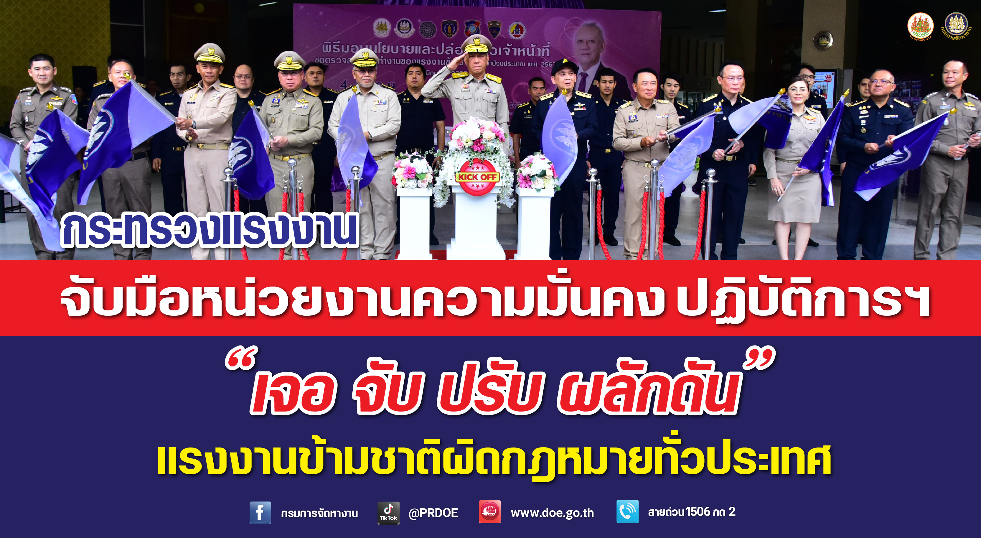 วันที่ 5 มิถุนายน 2567 นายพิพัฒน์ รัชกิจประการ รัฐมนตรีว่าการกระทรวงแรงงาน เป็นประธานในพิธีมอบนโยบายและปล่อยแถวเจ้าหน้าที่ด้านการตรวจสอบการทำงานของแรงงานข้ามชาติ ประจำปีงบประมาณ พ.ศ. 2567 ณ บริเวณองค์พระพุทธรูป อาคารกระทรวงแรงงาน โดยมีนายสมชาย มรกตศรีวรรณ อธิบดีกรมการจัดหางาน กล่าวรายงาน นายไพโรจน์ โชติกเสถียร ปลัดกระทรวงแรงงาน ผู้บริหารระดับสูงกระทรวงแรงงาน และผู้แทนจากสำนักงานตรวจ คนเข้าเมือง กองบัญชาการตำรวจท่องเที่ยว กองบังคับการปราบปรามการค้ามนุษย์ และกองอำนวยการรักษาความมั่นคงภายในกรุงเทพมหานคร ร่วมเป็นเกียรติในพิธี