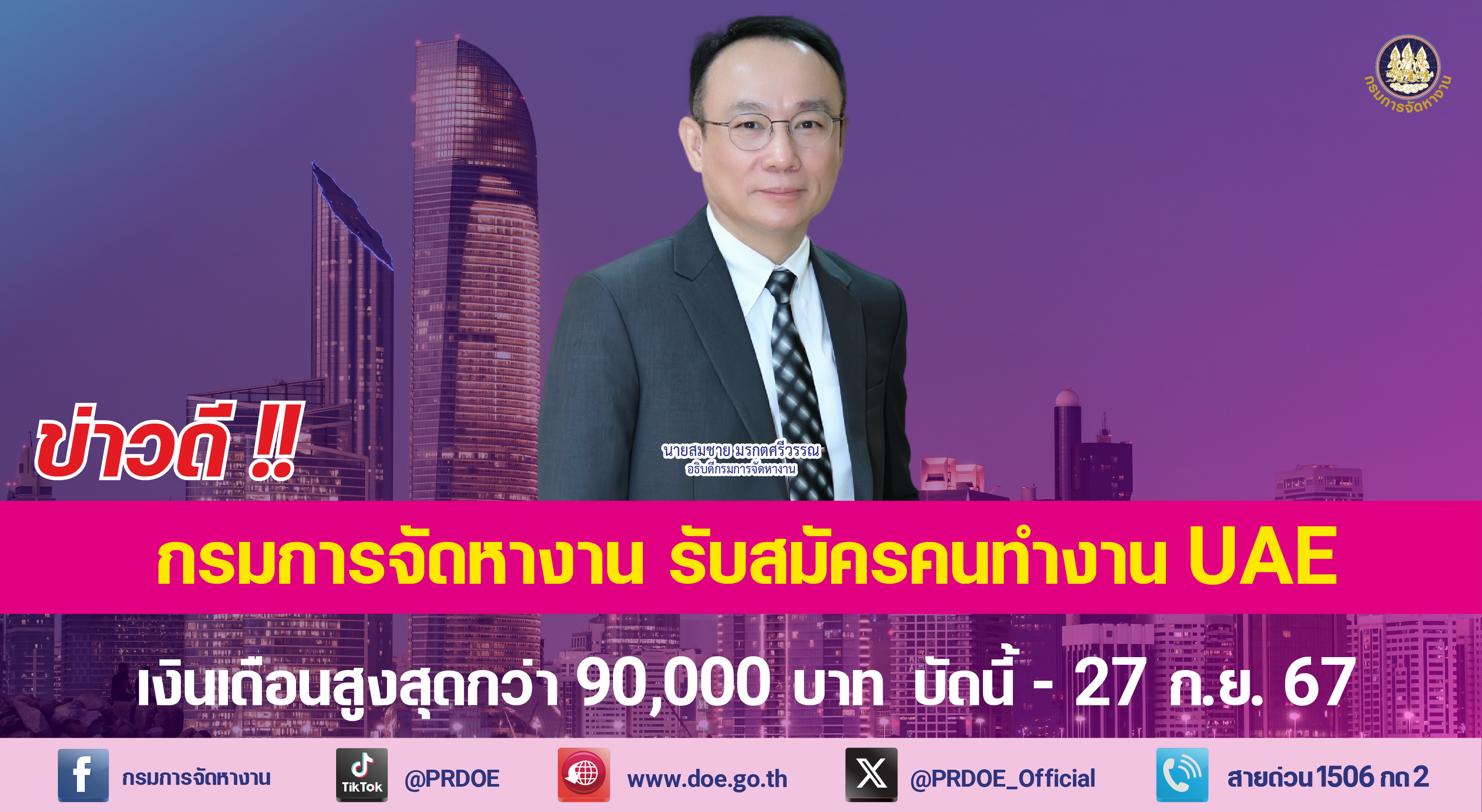 กรมการจัดหางาน รับสมัครคนหางานไปทำงานในสหรัฐอาหรับเอมิเรตส์ (UAE) จำนวน 6 ตำแหน่ง 17 อัตรา เงินเดือน สูงสุด 91,800 บาท มีโอที ฟรีที่พัก อาหาร 3 มื้อ ตั๋วเครื่องบินไป - กลับ สมัครออนไลน์ตั้งแต่บัดนี้ถึง 27 กันยายน 2567 ไม่เว้นวันหยุดราชการ