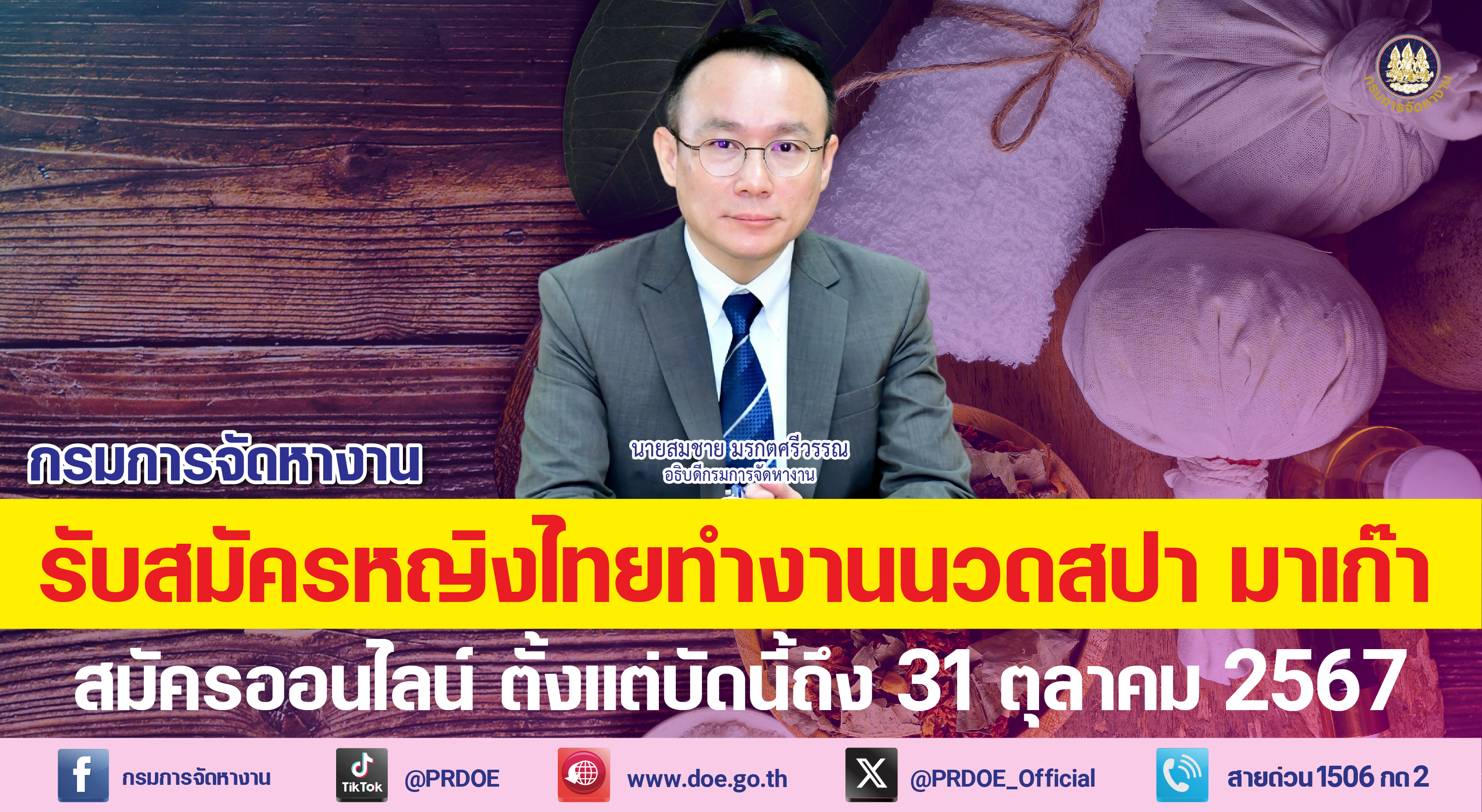 นายสมชาย มรกตศรีวรรณ อธิบดีกรมการจัดหางาน เปิดเผยว่า กรมการจัดหางาน เปิดรับสมัครคนไทยไปทำงานในเขตบริหารพิเศษมาเก๊า กับนายจ้างบริษัท MGM Grand Paradise Limited ซึ่งประกอบกิจการสถานคาสิโน ร้านอาหาร และโรงแรม ตำแหน่งพนักงานนวดสปา จำนวน 4 อัตรา ค่าจ้าง 13,600 เหรียญมาเก๊าต่อเดือน หรือประมาณ 56,862 บาท (อัตราแลกเปลี่ยน ณ วันที่ 9 ตุลาคม 2567 : 1 เหรียญมาเก๊า เท่ากับ 4.181 บาท) โดยนายจ้างจะจ่ายค่าโดยสารเครื่องบินไป - กลับ เมื่อทำงานสิ้นสุดสัญญาจ้าง ช่วยจ่ายค่าที่พักเดือนละ 500 เหรียญมาเก๊า จัดอาหารให้ในช่วงเวลาทำงาน มีค่าล่วงเวลา และสวัสดิการตามกฎหมายแรงงานมาเก๊า ผู้สนใจสามารถยื่นใบสมัครได้ที่เว็บไซต์ toea.doe.go.th โดยลงทะเบียนระบบอิเล็กทรอนิกส์การบริหารแรงงานไทยไปต่างประเทศ กรอกข้อมูลเพื่อลงทะเบียนคนหางาน และดำเนินการสมัครไปทำงาน เลือกหัวข้อ “สมัครไปทำงานโดยรัฐจัดส่ง” และเลือกรายการ “รับสมัครคนหางานเพื่อไปทำงานในเขตบริหารพิเศษมาเก๊ากับนายจ้างบริษัท MGM Grand Paradise Limited (ครั้งที่ 4/2567)” สมัครได้ตั้งแต่วันที่ 22 - 31 ตุลาคม 2567 ตลอด 24 ชั่วโมง โดยไม่เว้นวันหยุดราชการ