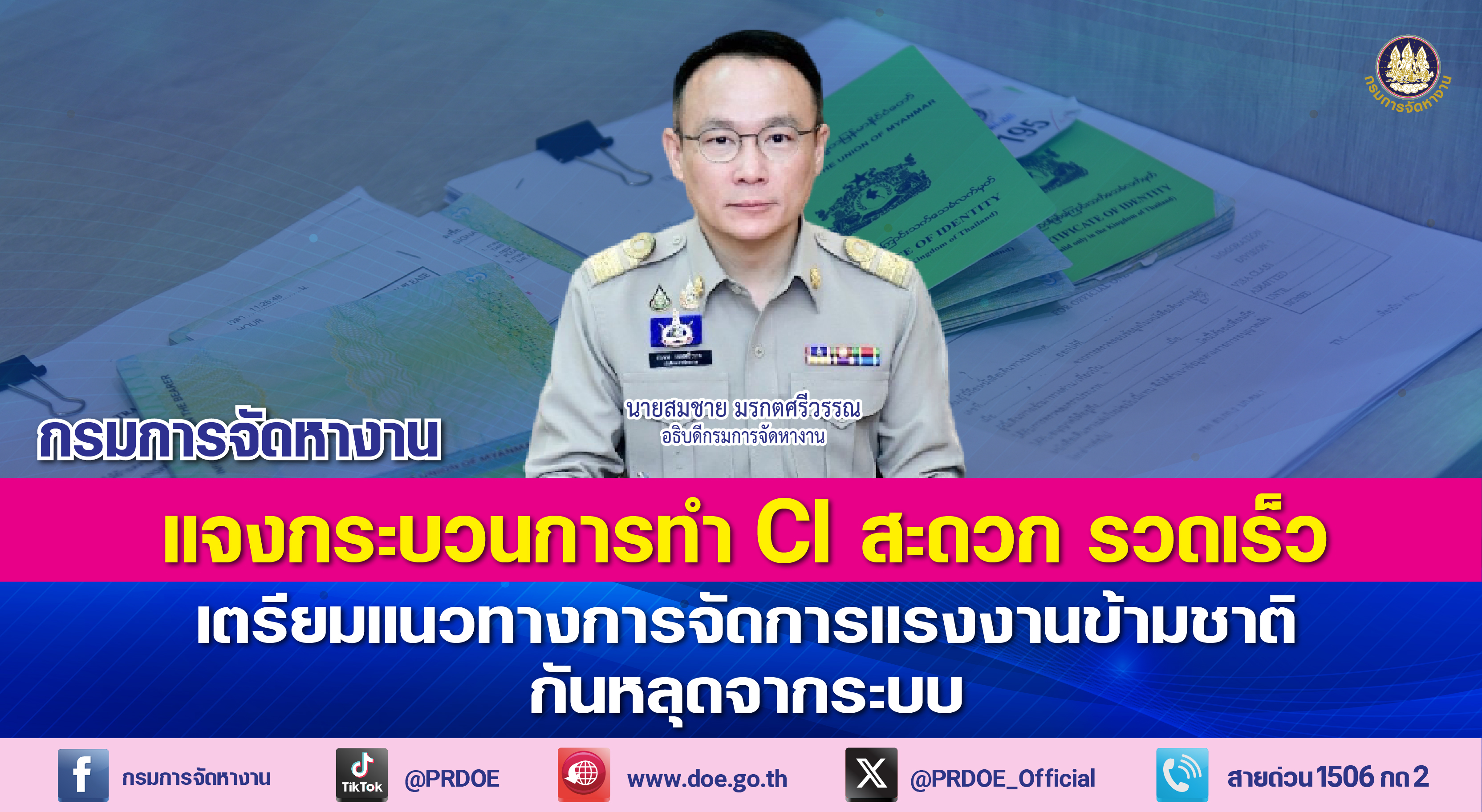อธิบดีกรมการจัดหางาน แจงขั้นตอนการทำเอกสารรับรองบุคคล (Certificate of Identity: CI) ชำระค่าธรรมเนียมที่เคาน์เตอร์เซอร์วิส นัดหมายวัน เวลาเข้าศูนย์ CI บริการรวดเร็ว สะดวก กำกับดูแล ตรวจสอบใกล้ชิด ย้ำมติ ครม. ล่าสุด ช่วยแรงงานข้ามชาติไม่หลุดจากระบบ