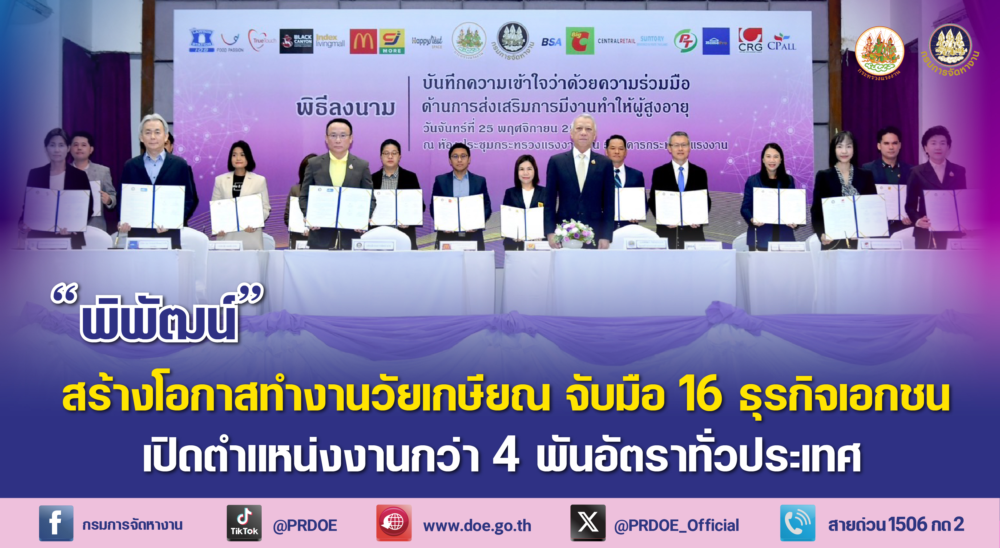 นายพิพัฒน์ รัชกิจประการ รัฐมนตรีว่าการกระทรวงแรงงาน กล่าวว่า จากการที่ประเทศไทยก้าวเข้าสู่ “สังคมผู้สูงอายุอย่างสมบูรณ์”ทำให้ต้องมีการขับเคลื่อนการส่งเสริมการมีงานทำสำหรับผู้สูงอายุให้เป็นรูปธรรมมากยิ่งขึ้น ดังนั้นเพื่อส่งเสริมและสนับสนุนให้ผู้สูงอายุได้มีงานทำในอาชีพที่เหมาะสมกับวัยและประสบการณ์ สามารถสร้างหลักประกันที่มั่นคงด้านรายได้ สร้างคุณค่าและความภาคภูมิใจให้แก่ผู้สูงอายุ ตลอดจนเป็นการเพิ่มบทบาทและคุณค่าของผู้สูงอายุด้วยการมีส่วนร่วมในเชิงเศรษฐกิจ ลดภาระค่าใช้จ่ายของรัฐในด้านสวัสดิการสำหรับผู้สูงอายุ กระทรวงแรงงานโดยกรมการจัดหางาน จึงได้จัดทำบันทึกความเข้าใจว่าด้วยความร่วมมือด้านการส่งเสริมการมีงานทำให้ผู้สูงอายุ ระหว่าง กรมการจัดหางาน และสถานประกอบการชั้นนำจำนวน 16 แห่ง พร้อมเตรียมตำแหน่งงานทั่วประเทศ รองรับการทำงานของผู้สูงอายุ กว่า 4 พันอัตรา ซึ่งเป็นงานที่ผู้สูงอายุสามารถทำได้ เป็นงานที่ไม่หนัก และไม่เป็นอันตราย อาทิ ตำแหน่งพนักงานประจำร้าน ตำแหน่งบาริสต้า ตำแหน่งพนักงานบริการ เป็นต้น เพื่อช่วยลดการขาดแคลนแรงงาน ในบางภาคส่วน ช่วยเสริมสร้างความแข็งแกร่งให้กับตลาดแรงงานไทยในอนาคต และยังช่วยให้ผู้สูงอายุสามารถมีส่วนร่วมในการพัฒนาสังคมและเศรษฐกิจได้อย่างเต็มที่ รวมทั้งส่งเสริมให้ทุกคนสามารถมีคุณภาพชีวิตที่ดีและยั่งยืนในวัยเกษียณ