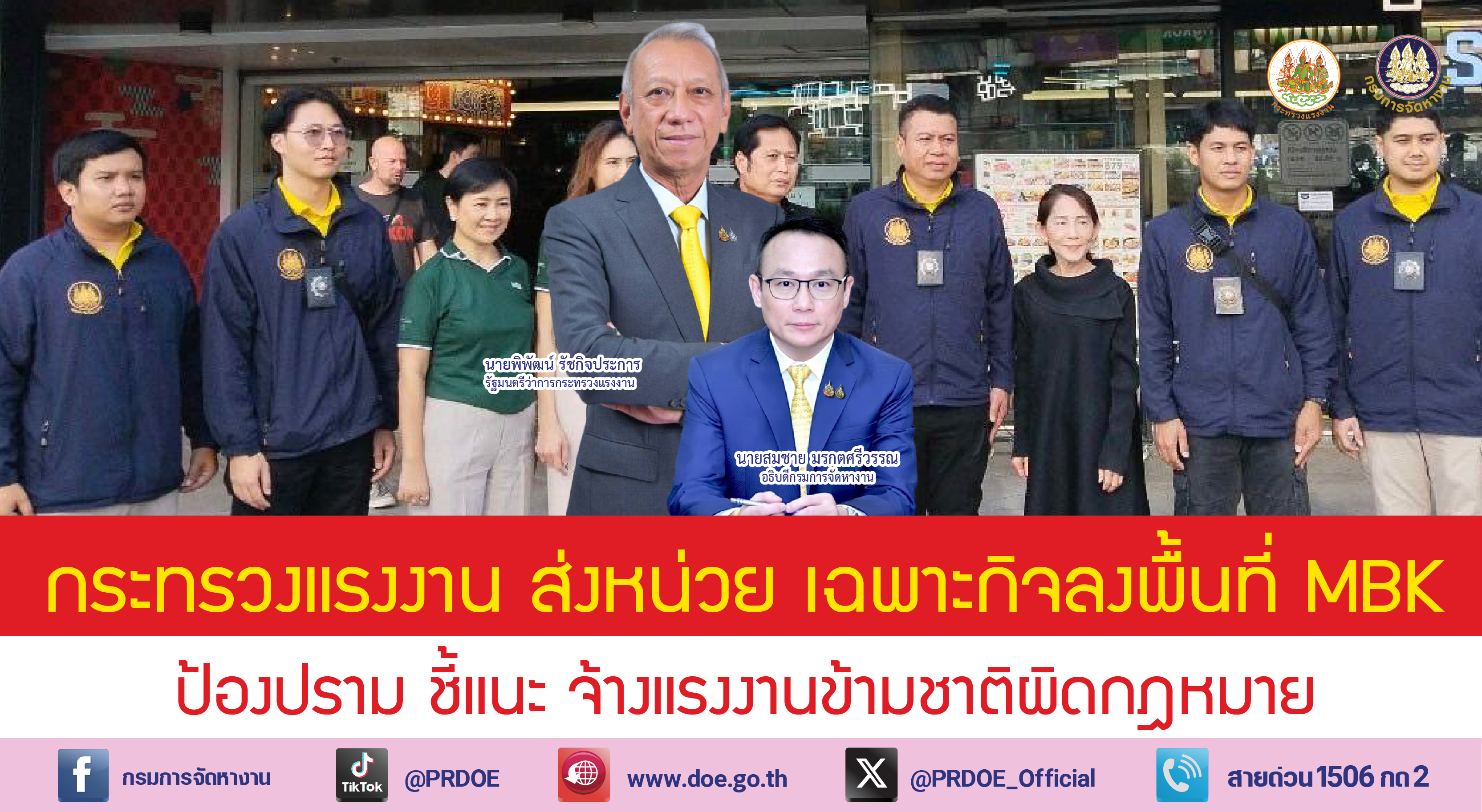 ด้านนายสมชาย มรกตศรีวรรณ อธิบดีกรมการจัดหางาน กล่าวว่า กรมการจัดหางาน รับข้อสั่งการของรัฐมนตรีว่าการกระทรวงแรงงาน ส่งเจ้าหน้าที่ชุดเฉพาะกิจลงพื้นที่อย่างต่อเนื่อง ล่าสุดในวันนี้ 25 พฤศจิกายน 2567 ได้มอบหมายเจ้าหน้าที่กองทะเบียนจัดหางานกลางและคุ้มครองคนหางาน ลงพื้นที่ศูนย์การค้าเอ็มบีเค เซ็นเตอร์ เขตปทุมวัน กรุงเทพมหานคร เพื่อแนะนำการจ้างแรงงานข้ามชาติที่ถูกต้อง การยื่นคำขอเปลี่ยนแปลงรายการในใบอนุญาตทำงาน สิทธิและประเภทงานที่สามารถทำได้ ตลอดจนประชาสัมพันธ์การดำเนินการต่ออายุใบอนุญาตทำงานให้แรงงานข้ามชาติ ทั้งนี้ เพื่อให้นายจ้างและแรงงานข้ามชาติสามารถปฏิบัติได้ถูกต้องตามกฎหมาย จากการลงพื้นที่ของเจ้าหน้าที่ได้แจกแผ่นพับประชาสัมพันธ์ การขอใบอนุญาตทำงาน การเพิ่มประเภทงานขายของหน้าร้าน ประเภทงานที่ห้ามคนต่างชาติทำ และบทกำหนดโทษตามพระราชกำหนดการบริหารจัดการการทำงานของคนต่างด้าว พ.ศ. 2560 และที่แก้ไขเพิ่มเติม ซึ่งได้รับความสนใจจากนายจ้าง สถานประกอบการ ร้านค้าภายในตลาด และแรงงานข้ามชาติเป็นอย่างดี พร้อมทั้งแสดงความพร้อมให้ความร่วมมือปฏิบัติตามขั้นตอนที่เจ้าหน้าที่แนะนำ