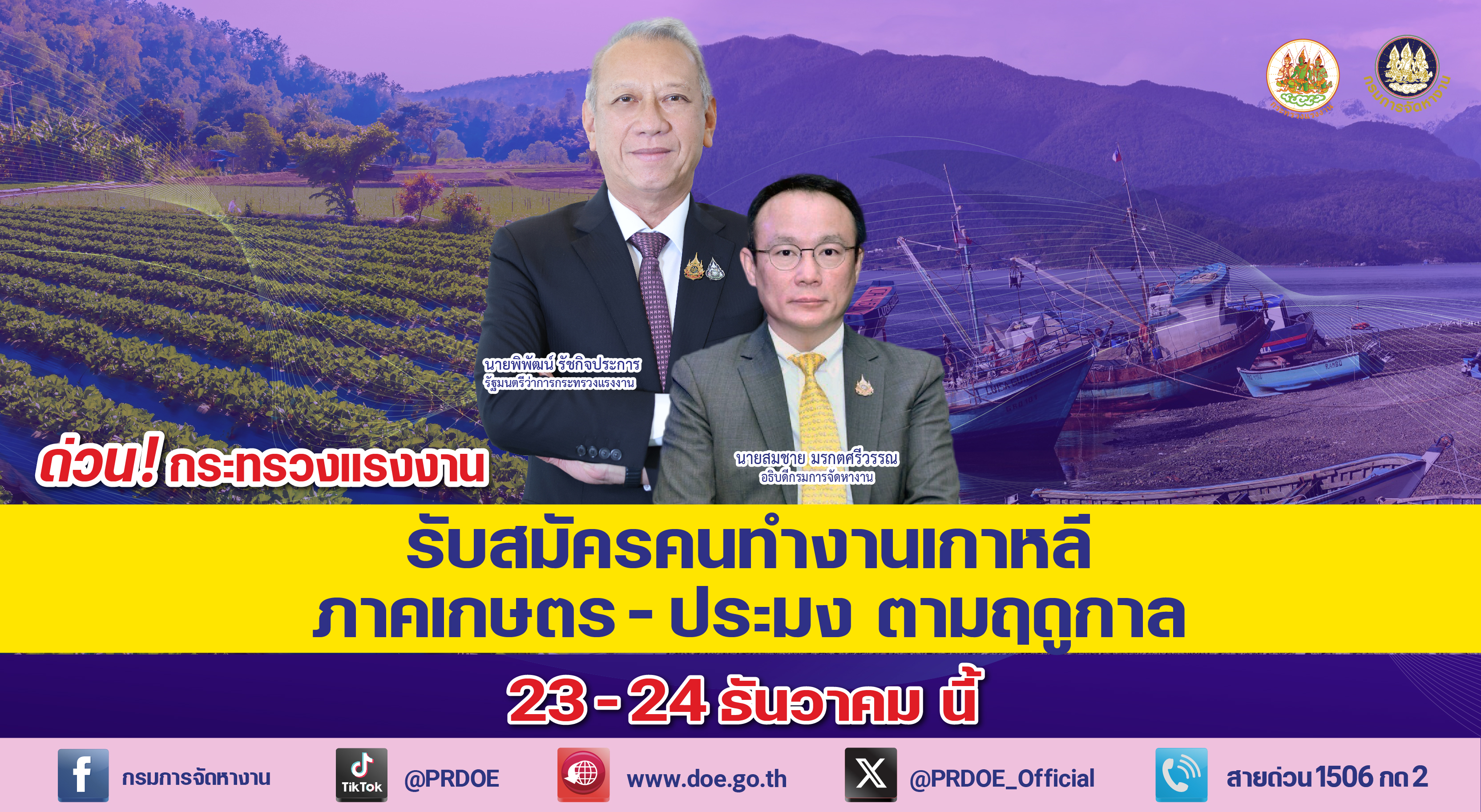 นายพิพัฒน์ รัชกิจประการ รัฐมนตรีว่าการกระทรวงแรงงาน เปิดเผยว่า จากที่ผมได้ไปเยือนสาธารณรัฐเกาหลี ช่วงเดือนมีนาคม 2567 ที่ผ่านมา เพื่อขยายตลาดแรงงานไทยในเกาหลี โดยได้มีการเจรจาเพิ่มโควตาการจัดส่งแรงงานไทย ภายใต้ระบบแรงงานต่างชาติ EPS การขยายการจัดส่งแรงงานไปทำงานยังภาคบริการ และท่องเที่ยว รวมทั้งการขยายการจัดส่งแรงงานไทยไปทำงานภาคเกษตรตามฤดูกาลที่เกาหลีใต้สำเร็จ นั้น กระทรวงแรงงาน โดยกรมการจัดหางาน ได้มีการจัดส่งแรงงานไทยไปทำงานเกาหลีอย่างต่อเนื่อง โดยในปี 2567 (ม.ค. - พ.ย.) ได้ส่งคนหางานไปทำงานเกาหลีใต้แล้ว6,611 คน ล่าสุด อำเภอวันโด จังหวัดชอลลานัม สาธารณรัฐเกาหลี แจ้งความต้องการรับสมัครคนไทยไปทำงานภาคเกษตรและประมงตามฤดูกาลในสาธารณรัฐเกาหลี เป็นครั้งที่ 3 จำนวน 2 ตำแหน่ง 22 อัตรา โดยผู้สนใจสามารถสมัครทางเว็บไซต์ toea.doe.go.th ภายในวันที่ 23-24 ธันวาคม 2567 ตลอด 24 ชั่วโมง