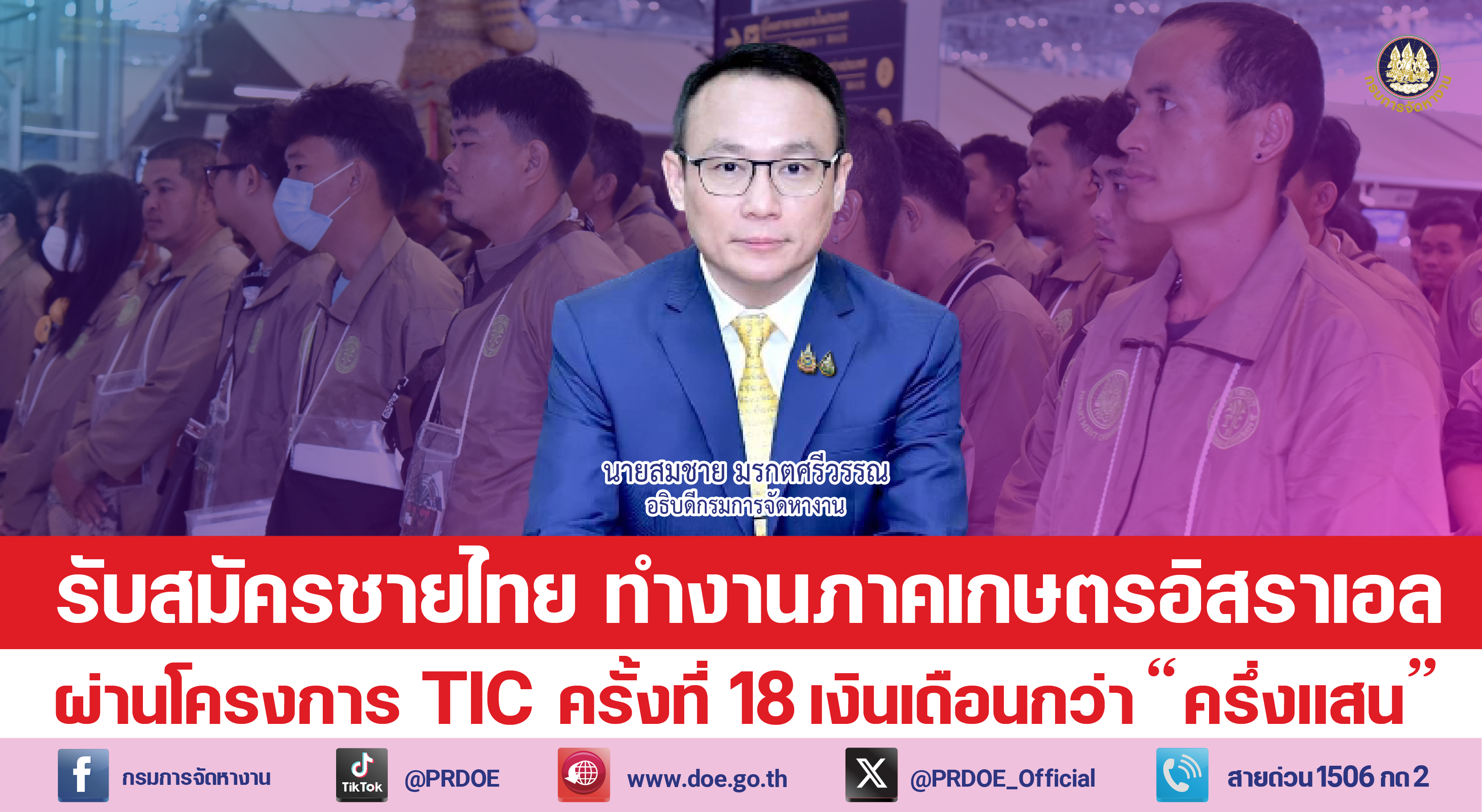 กระทรวงแรงงาน โดยกรมการจัดหางาน เปิดรับสมัครคนหางานเพื่อไปทำงานภาคเกษตรในรัฐอิสราเอล ภายใต้โครงการ “ความร่วมมือไทย – อิสราเอลเพื่อการจัดหางาน” (TIC) ครั้งที่ 18 ทางเว็บไซต์ toea.doe.go.th ระหว่างวันที่ 4 - 8 มกราคม 2568 ตลอด 24 ชั่วโมง