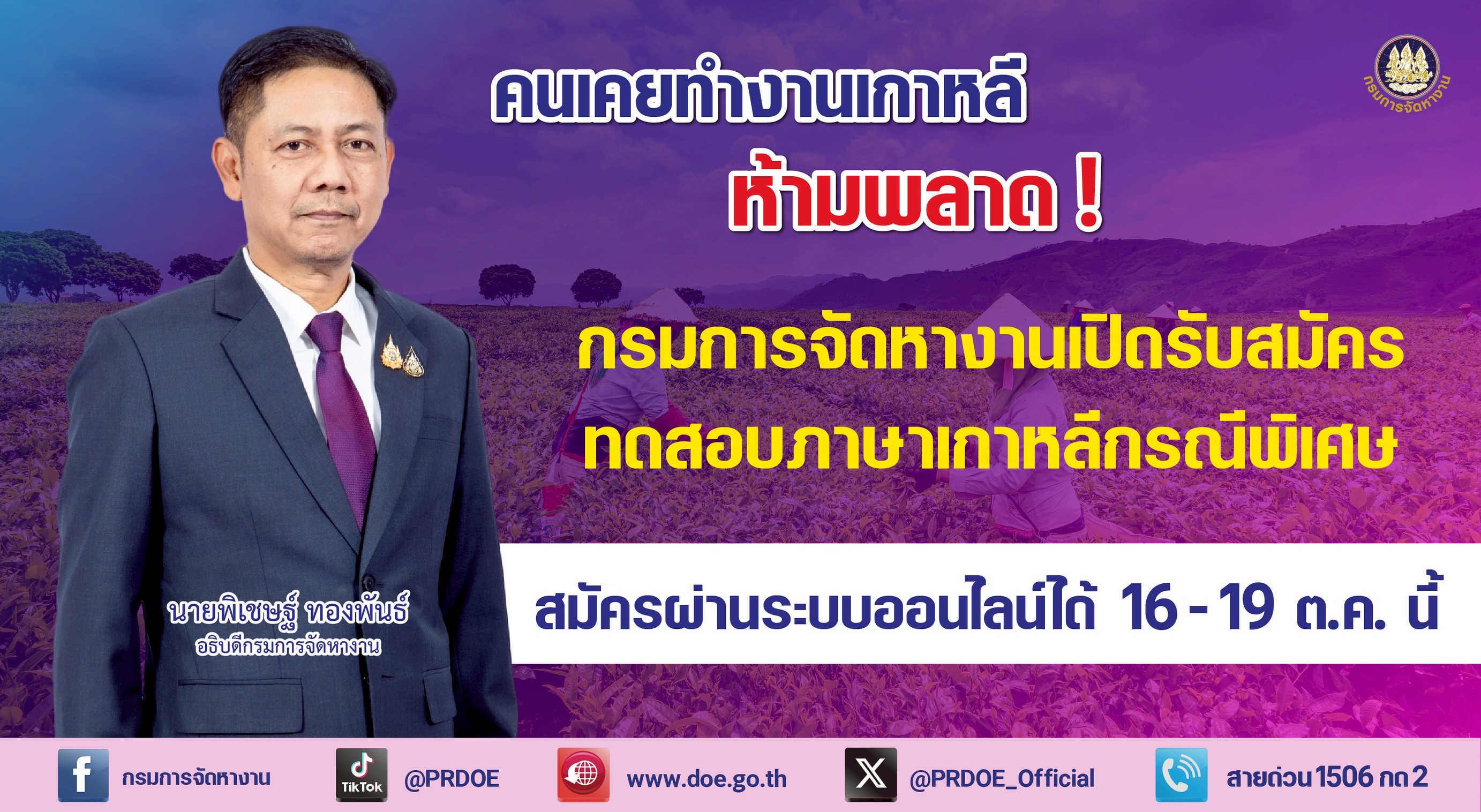 นายพิเชษฐ์ ทองพันธ์ อธิบดีกรมการจัดหางาน เปิดเผยว่า กรมการจัดหางานประกาศรับสมัครทดสอบภาษาเกาหลีกรณีพิเศษ (Special EPS-TOPIK) ครั้งที่ 29 สำหรับคนหางานที่เคยเดินทางไปทำงานในสาธารณรัฐเกาหลีอย่างถูกต้องตามกฎหมาย และเดินทางกลับตามกำหนดระยะเวลาการจ้างงาน โดยเป็นผู้ที่เดินทางกลับประเทศไทยตั้งแต่วันที่ 1 มกราคม 2553 เป็นต้นมา และมีความประสงค์จะเดินทางกลับเข้าไปทำงานในสาธารณรัฐเกาหลีอีกครั้งตามระบบ EPS ผู้สนใจสามารถยื่นใบสมัครได้ที่เว็บไซต์ toea.doe.go.th ได้ตั้งแต่วันที่ 16 - 19 ตุลาคม 2568 ตลอด 24 ชั่วโมง ไม่เว้นวันหยุดราชการ