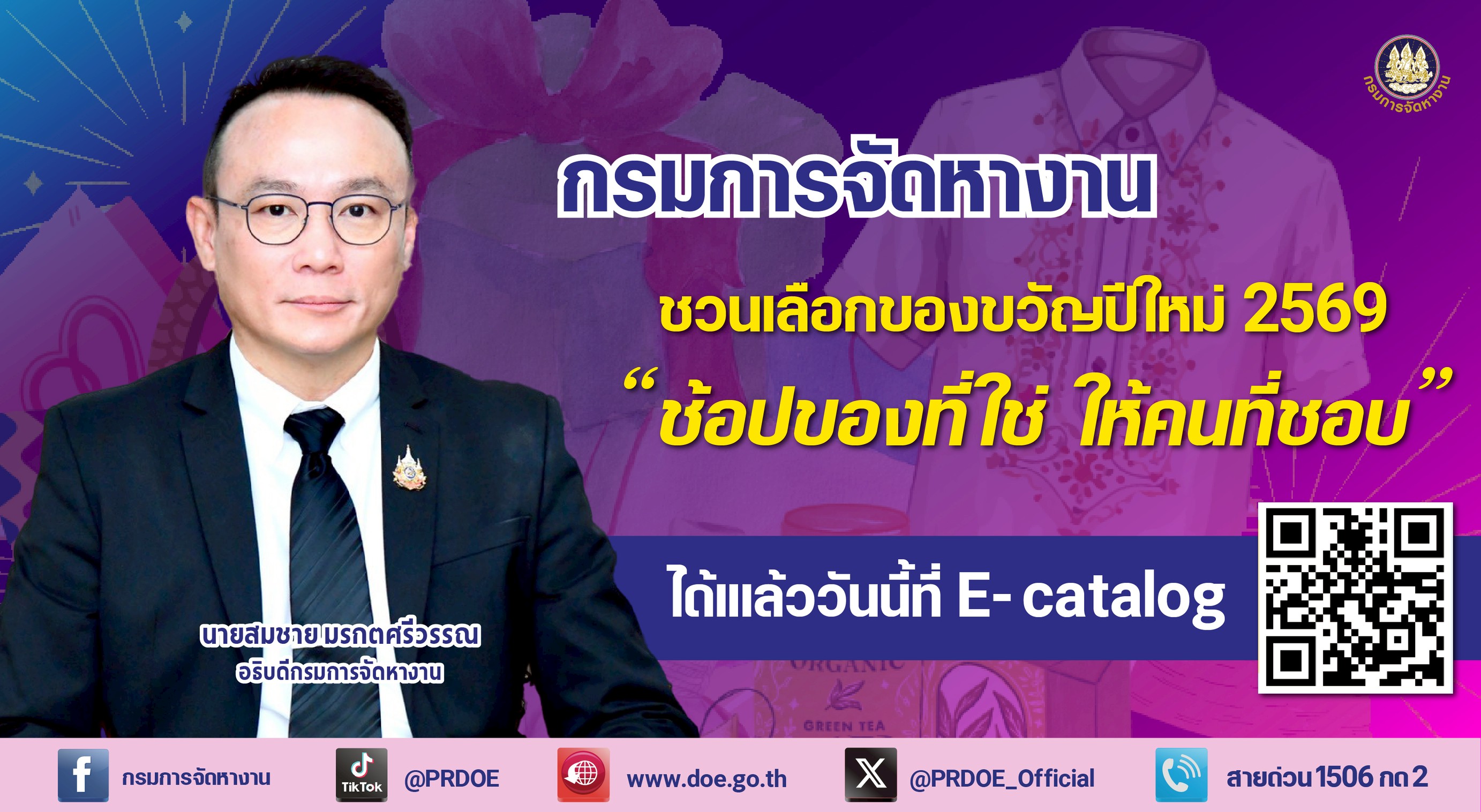 “ผู้ที่สนใจสามารถเลือกชมและสั่งซื้อสินค้าได้อย่างสะดวก ผ่านระบบออนไลน์ E-Catalog ได้ทุกที่ ทุกเวลา ทางเว็บไซต์ doe.go.th/vgnew หรือสแกน QR Code : E-Catalog ซึ่งนอกจากจะได้มอบของขวัญจากภูมิปัญญาชาวบ้านที่มีเอกลักษณ์แล้ว ยังเป็นการร่วมส่งเสริมเศรษฐกิจชุมชน และสร้างขวัญกำลังใจให้แก่กลุ่มผู้รับงานไปทำที่บ้านอีกด้วย” อธิบดีกรมการจัดหางาน กล่าว