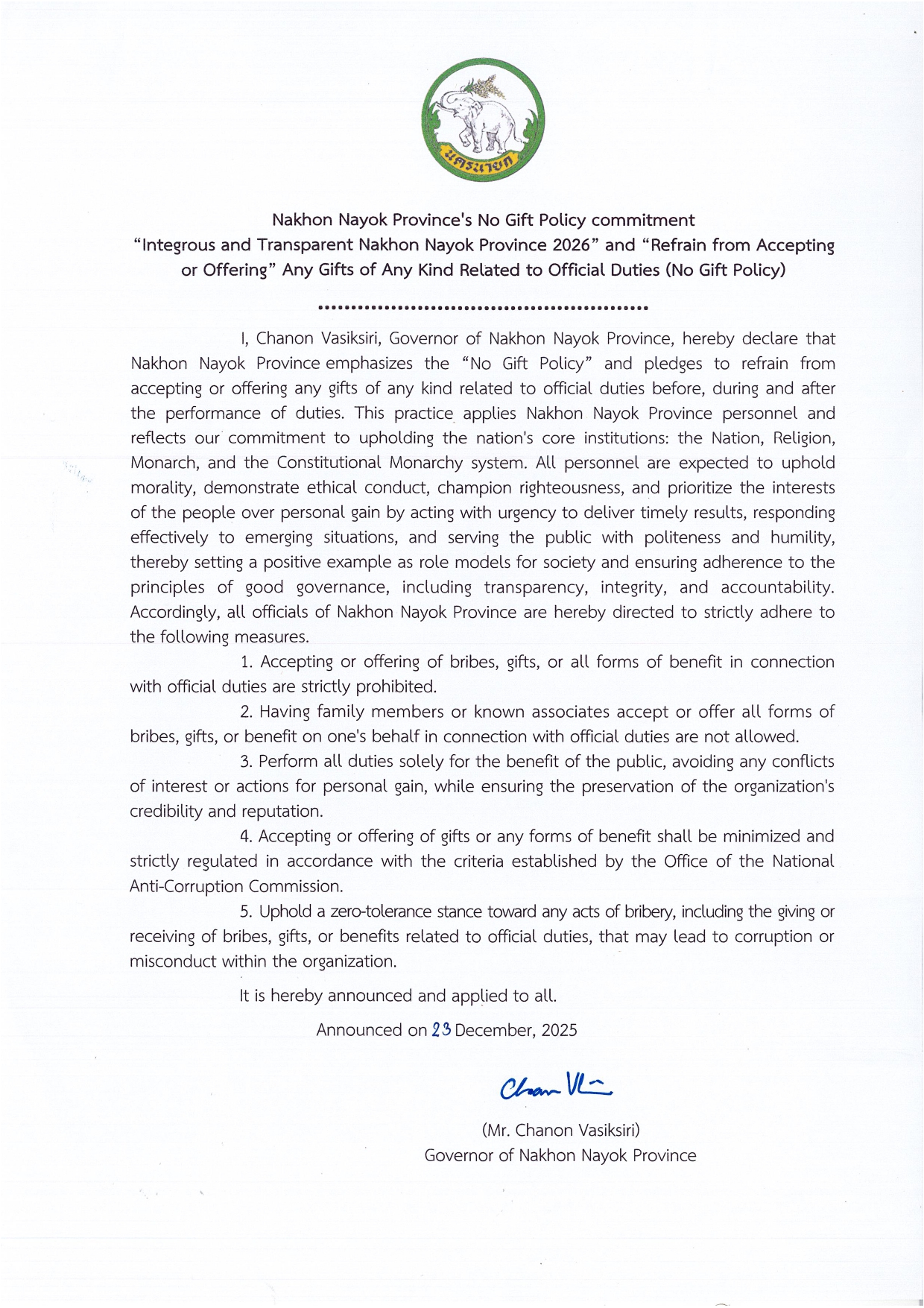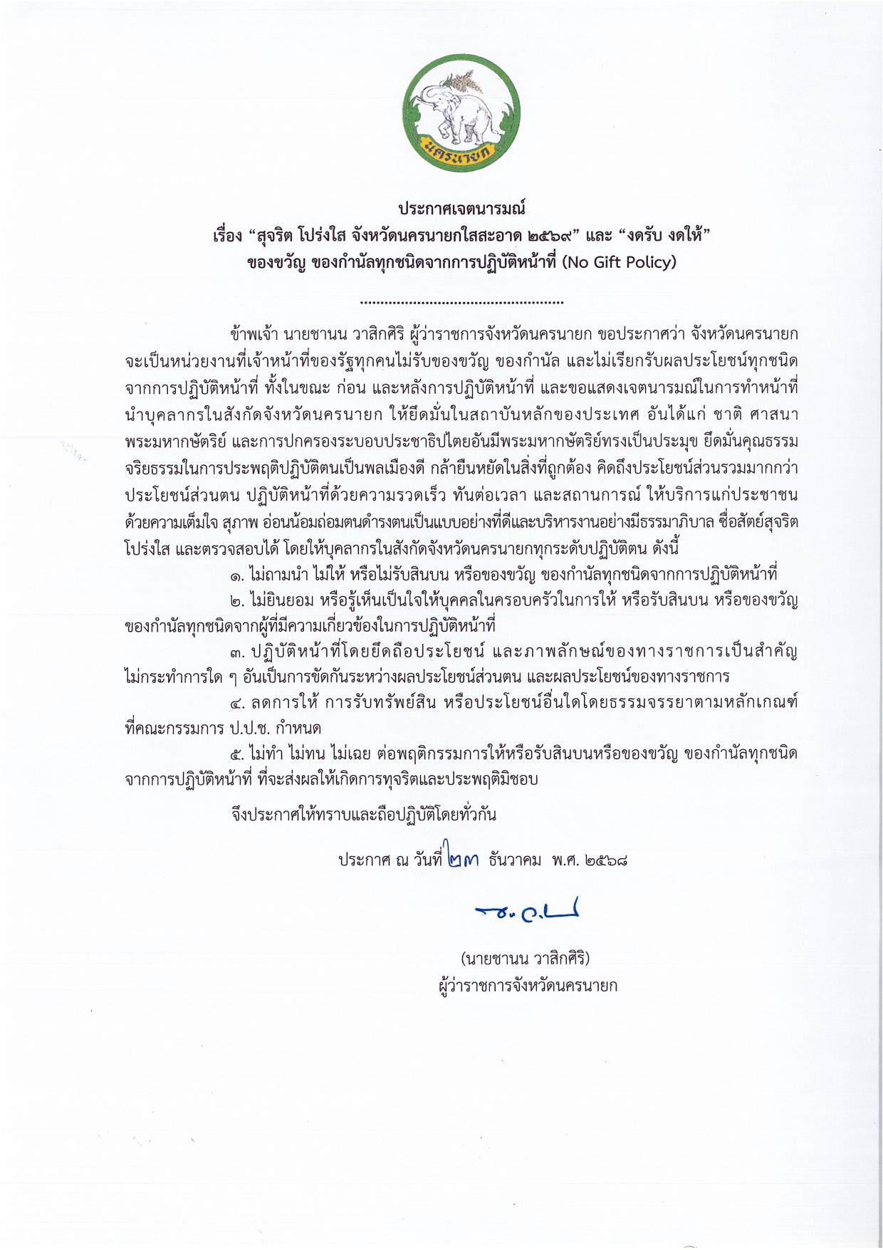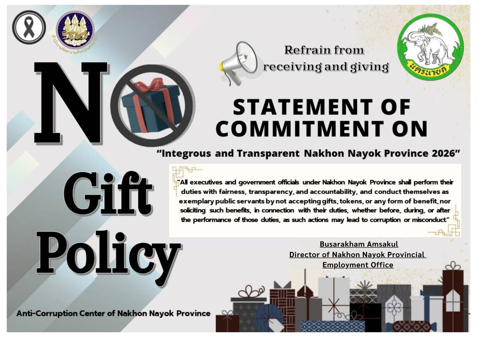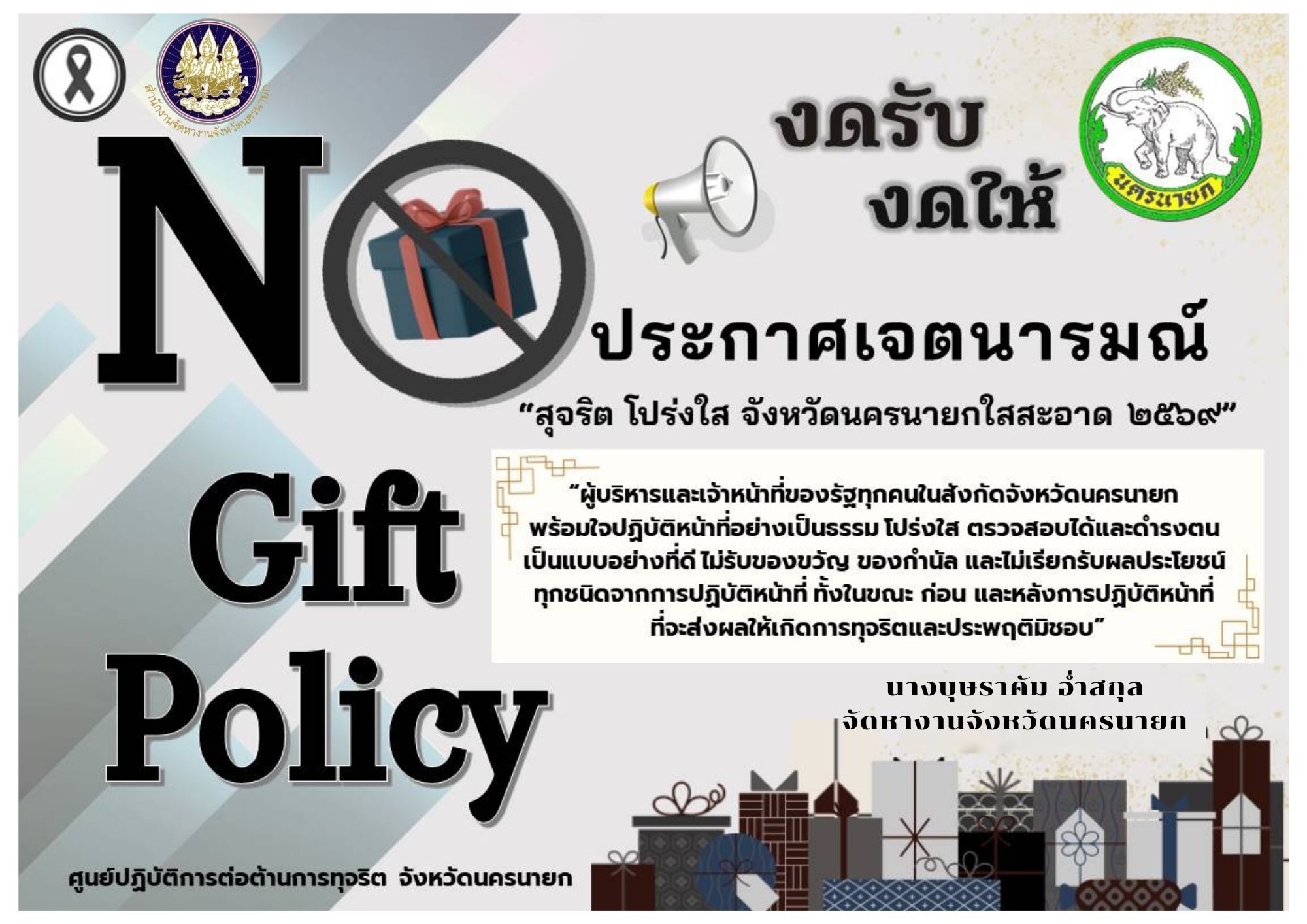 นโยบายไม่รับของขวัญ (no gift policy) ประจำปีงบประมาณ พ.ศ. 2569