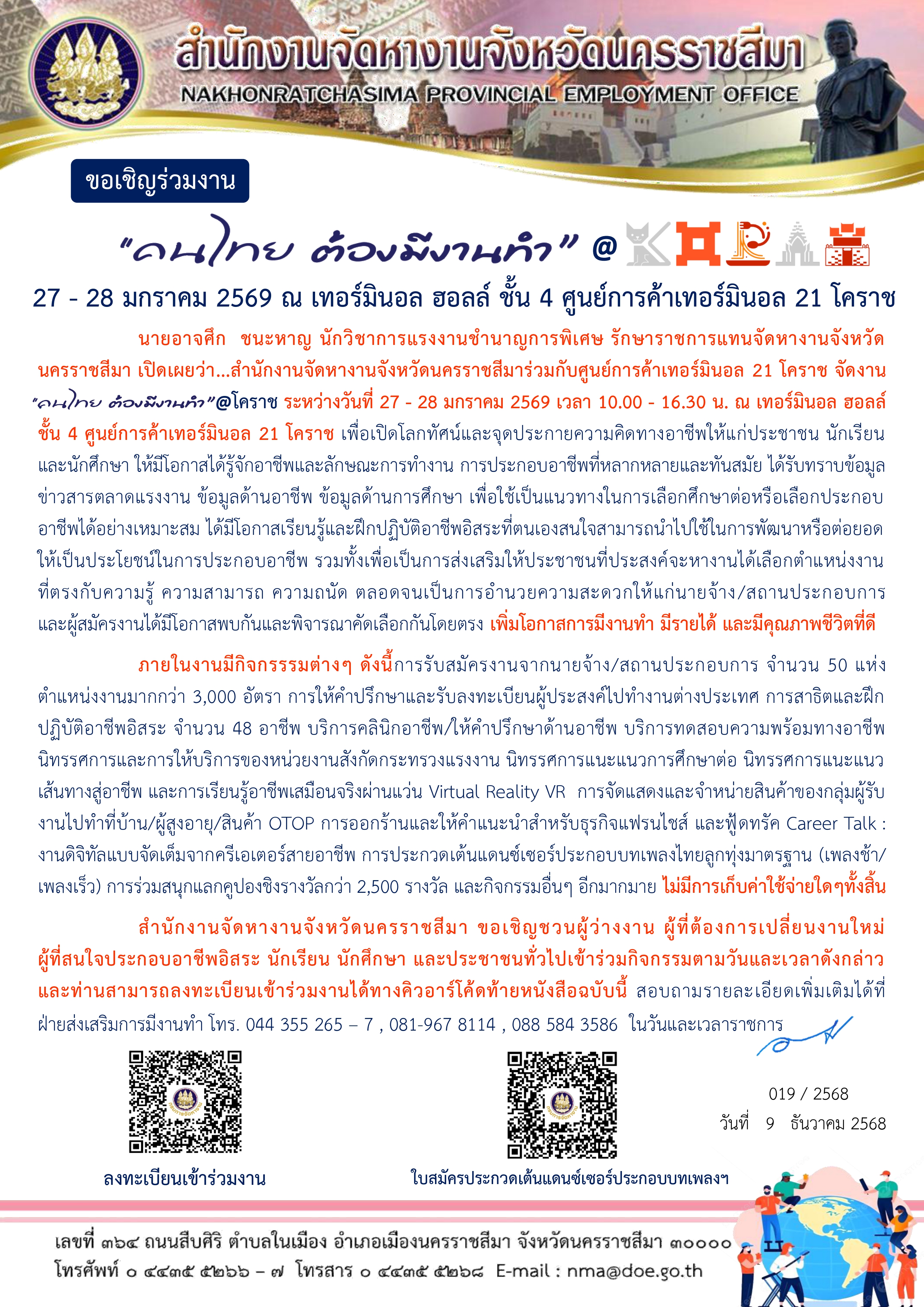 ขอเชิญร่วมงาน คนไทยต้องมีงานทำ @โคราช ณ เทอร์มินอล 21 โคราช วันที่ 27-28 ม.ค.69