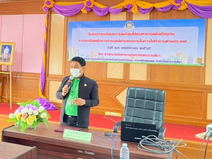 วันที่ 23 พฤศจิกายน 2565 นายเที่ยง ดอกกระโทก จัดหางานจังหวัดนครราชสีมา เป็นประธานพิธีเปิดการอบรม โครงการเตรียมความพร้อมให้คนหางานเพื่อป้องกันการตกเป็นเหยื่อการค้ามนุษย์ด้านแรงงานในการไปทำงานต่างประเทศ ปีงบประมาณ พ.ศ. 2566 โดยมีวัตถุประสงค์เพื่อเผยแพร่ ประชาสัมพันธ์ให้คนหางานที่ประสงค์จะไปทำงานต่างประเทศ ประชาชนทั่วไป มีความรู้ความเข้าใจเกี่ยวกับวิธีการ และขั้นตอนการไปทำงานต่างประเทศโดยถูกต้องตามกฎหมาย เพื่อรู้เท่าทันกลวิธีการหลอกลวงไปทำงานต่างประเทศ อันจะนำไปสู่การตกเป็นเหยื่อการค้ามนุษย์ด้านแรงงาน ณ องค์การบริหารส่วนตำบลห้วยแคน อำเภอห้วยแถลง จังหวัดนครราชสีมา มีผู้สนใจเข้ารับการอบรม จำนวน 40 คน