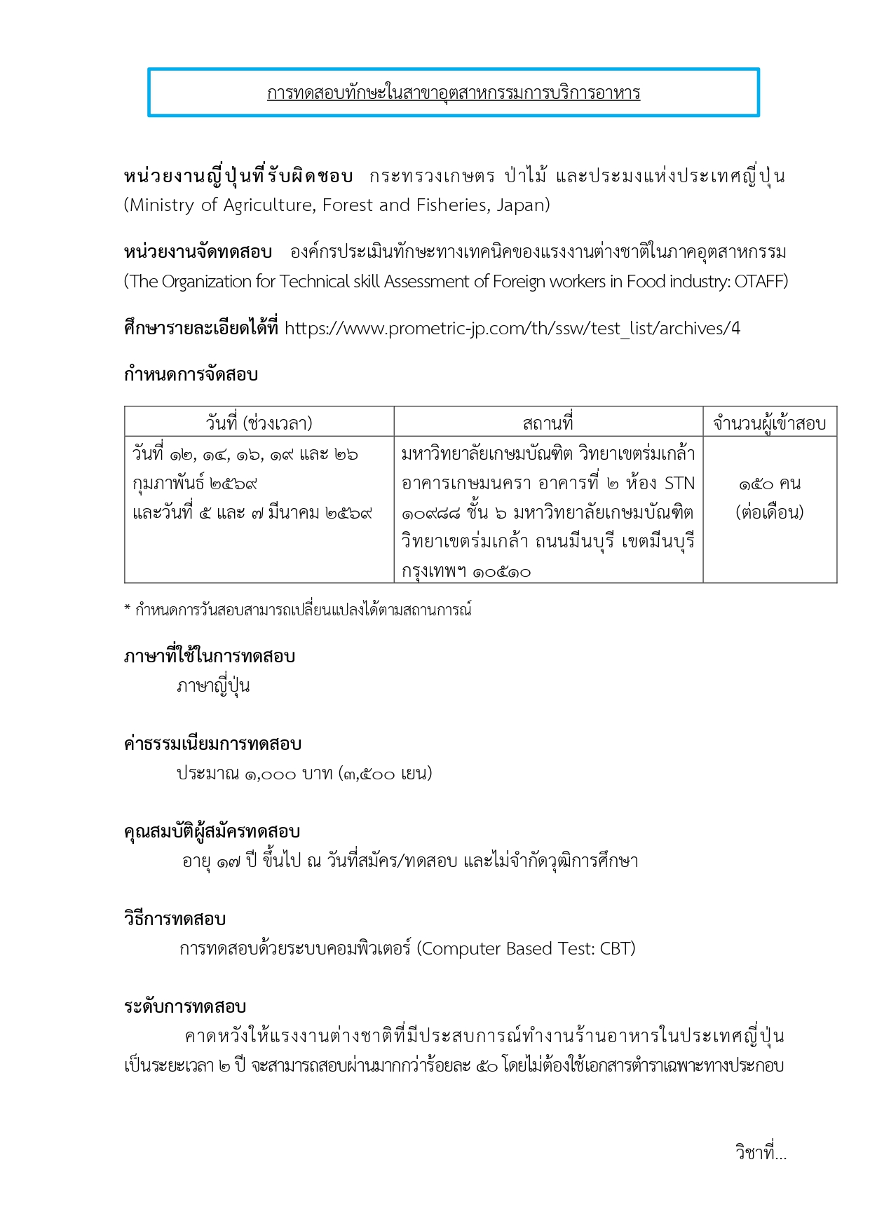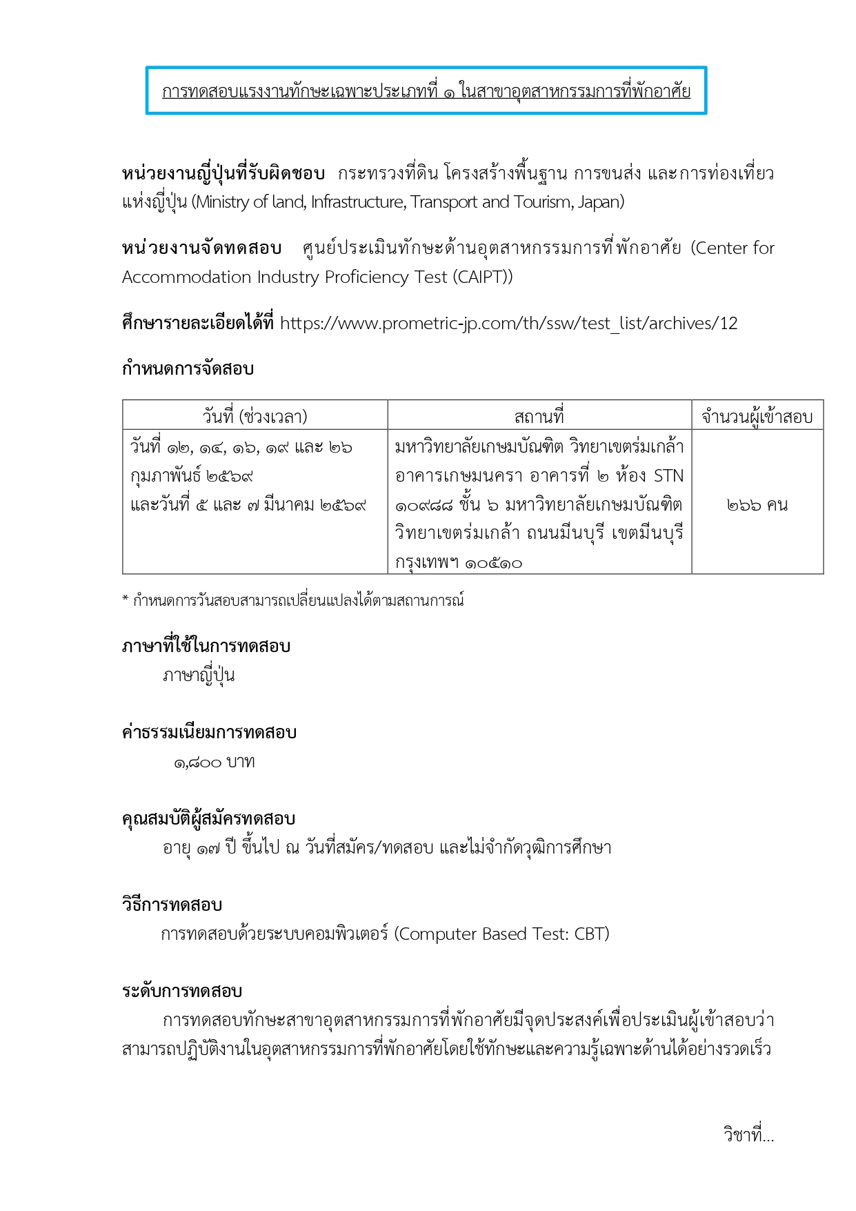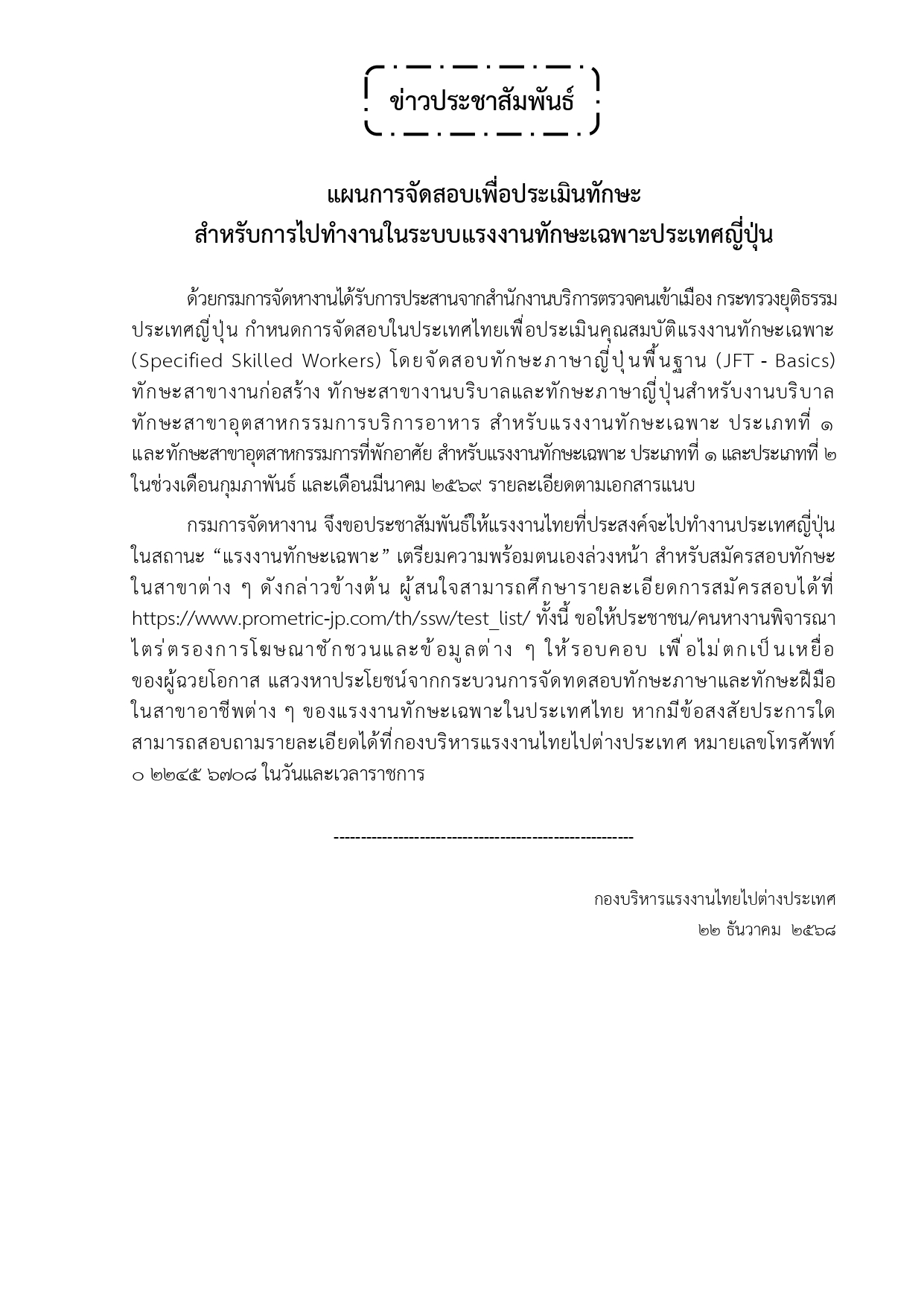 ข่าวประชาสัมพันธ์ แผนการจัดสอบเพื่อประเมินทักษะ สําหรับการไปทํางานในระบบแรงงานทักษะเฉพาะประเทศญี่ปุ่น