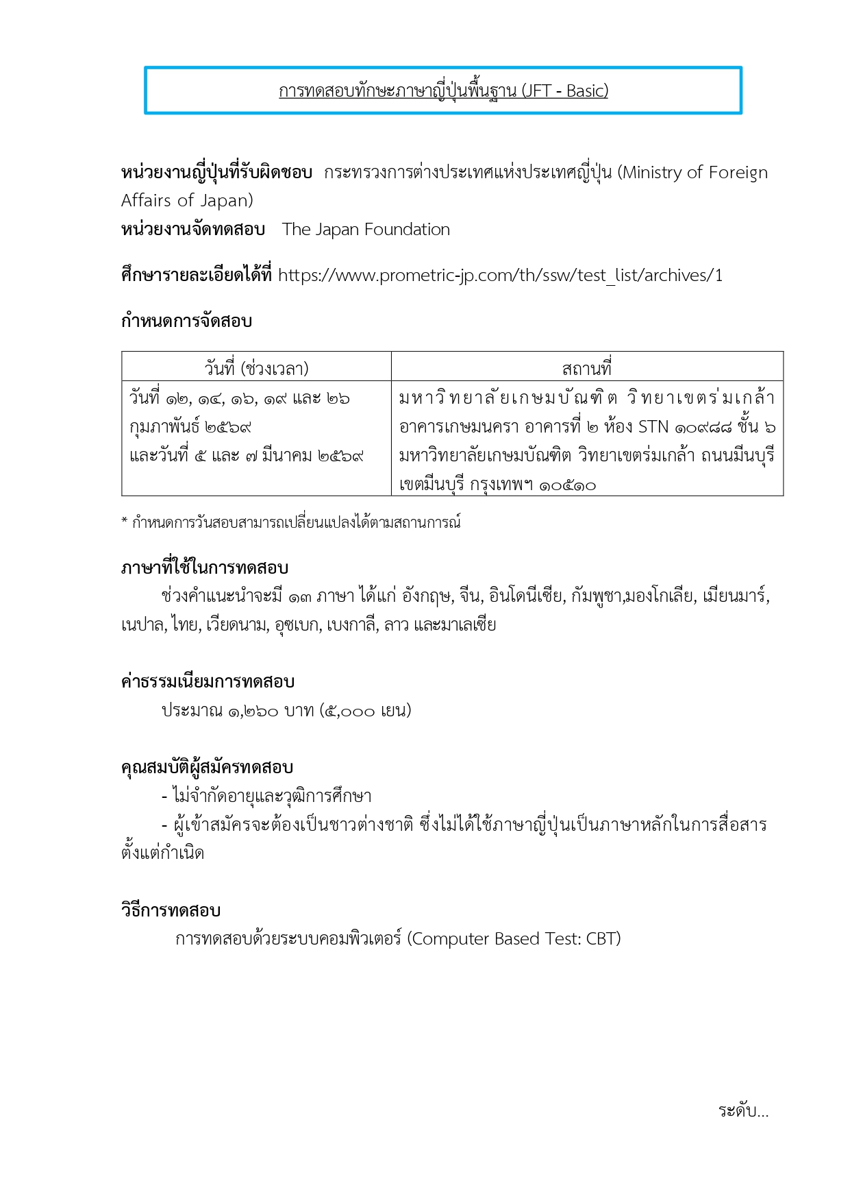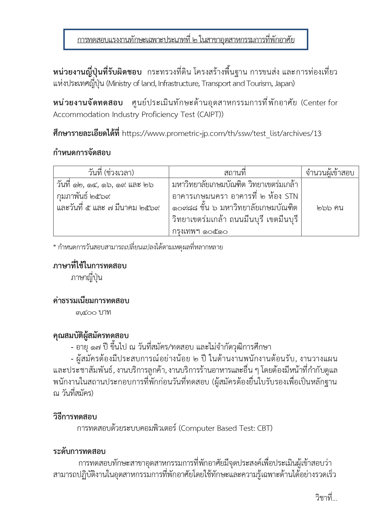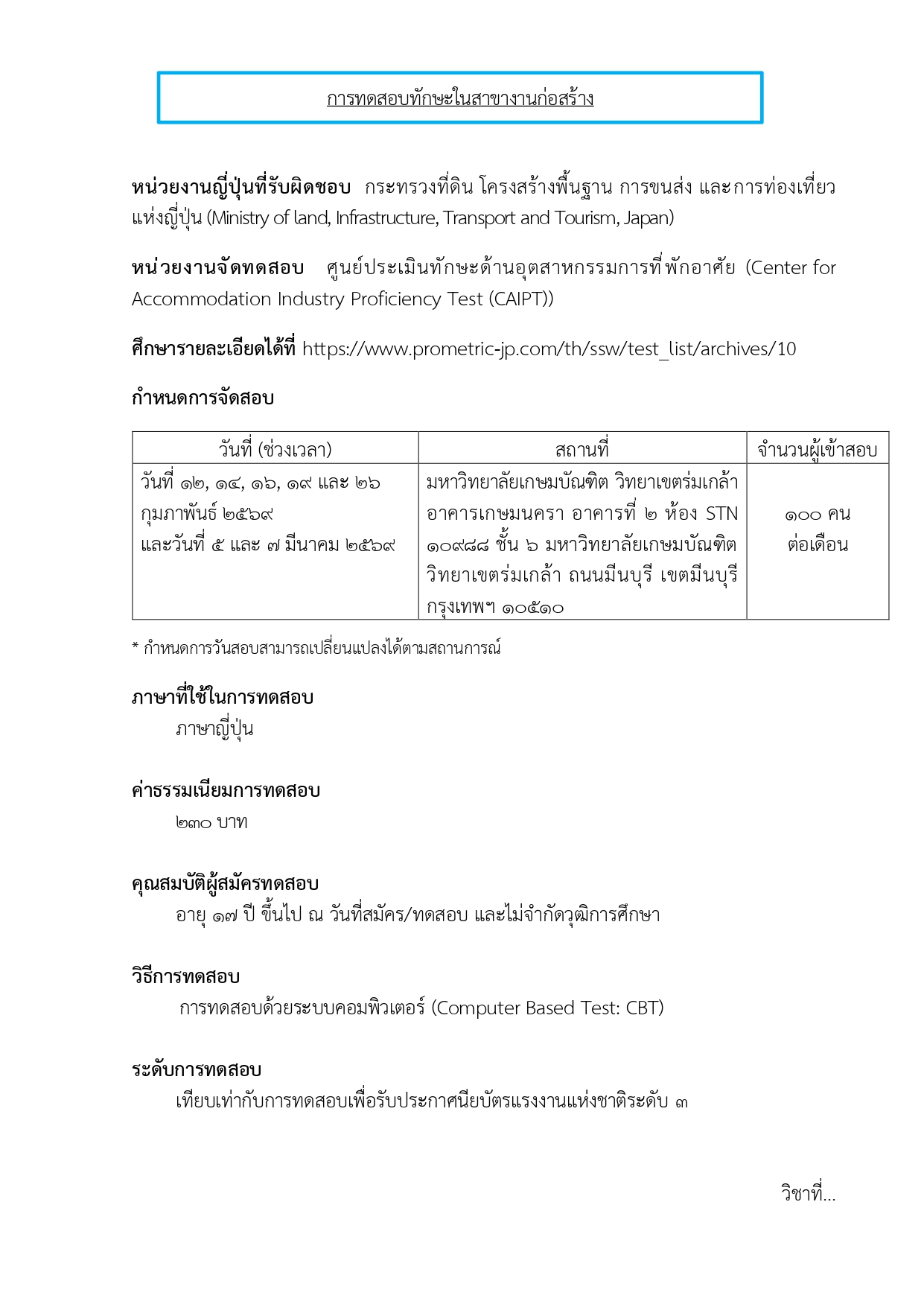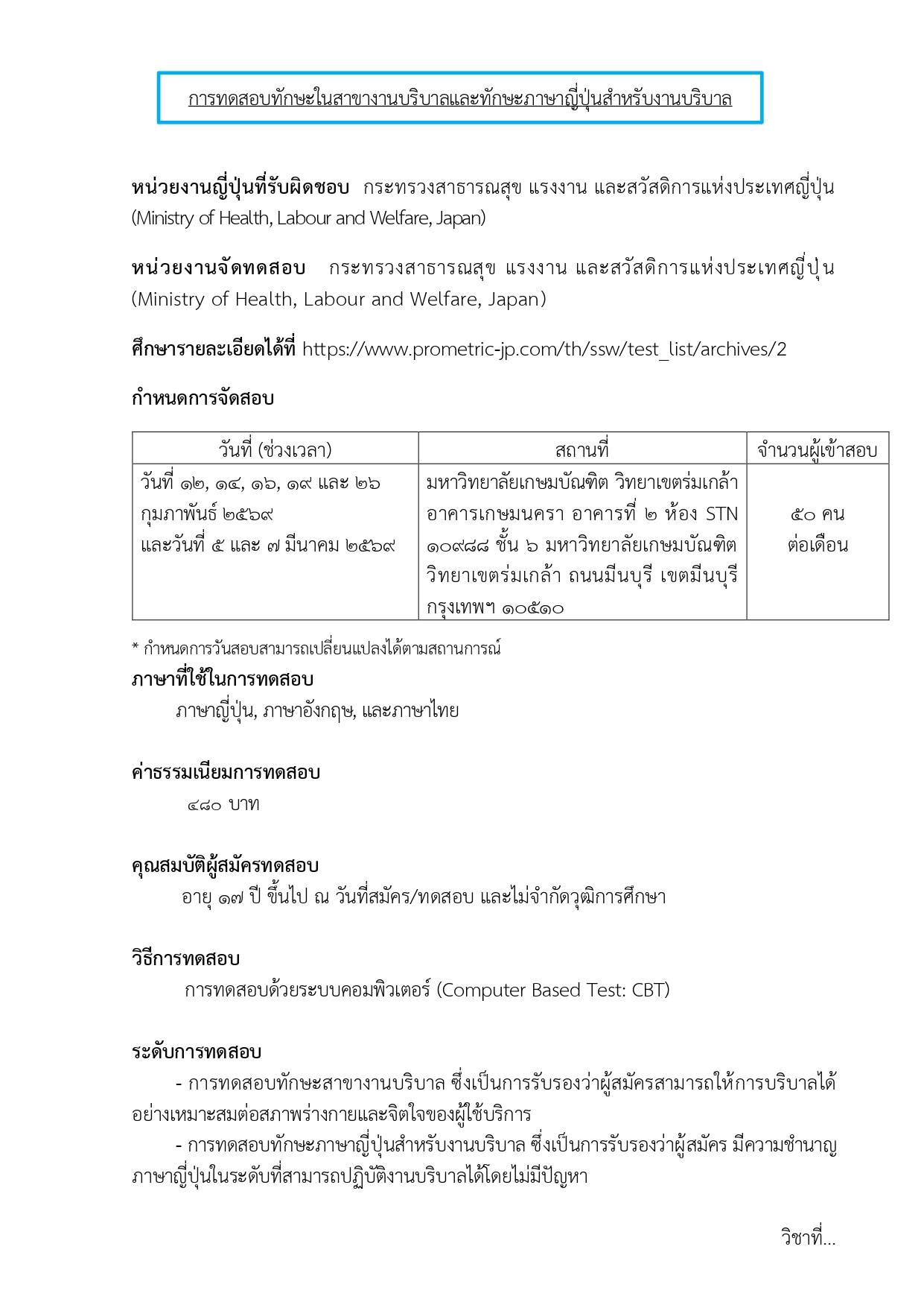 ข่าวประชาสัมพันธ์ แผนการจัดสอบเพื่อประเมินทักษะ สําหรับการไปทํางานในระบบแรงงานทักษะเฉพาะประเทศญี่ปุ่น