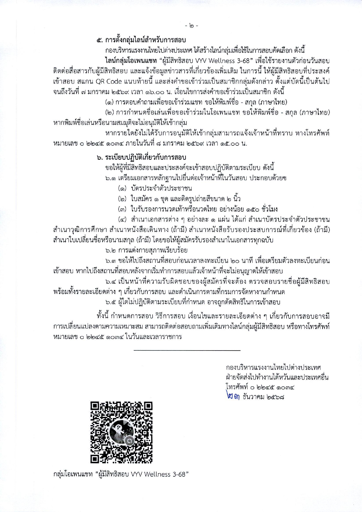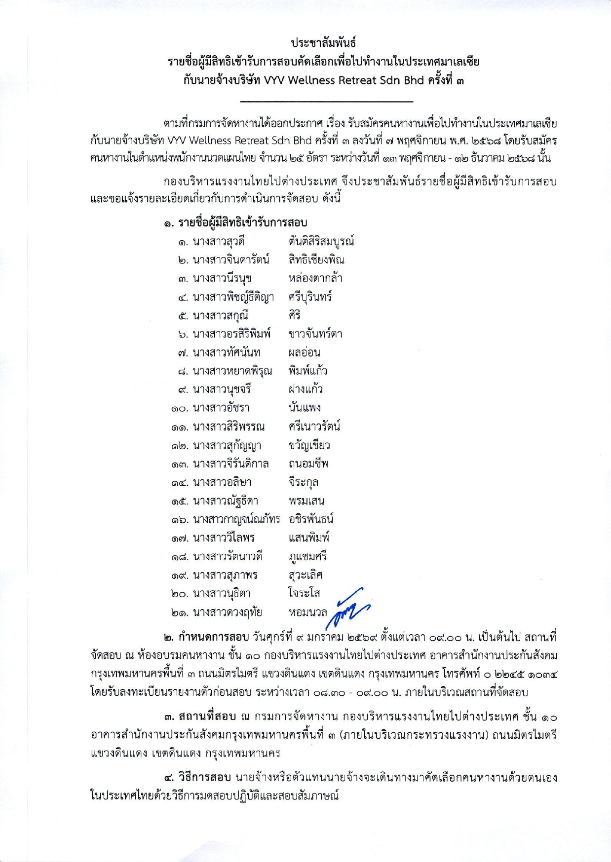 ประชาสัมพันธ์ รายชื่อผู้มีสิทธิเข้ารับการสอบคัดเลือกเพื่อไปทำงานในประเทศมาเลเซีย กับนายจ้างบริษัท VYV Wellness Retreat Sdn Bhd ครั้งที่ 3
