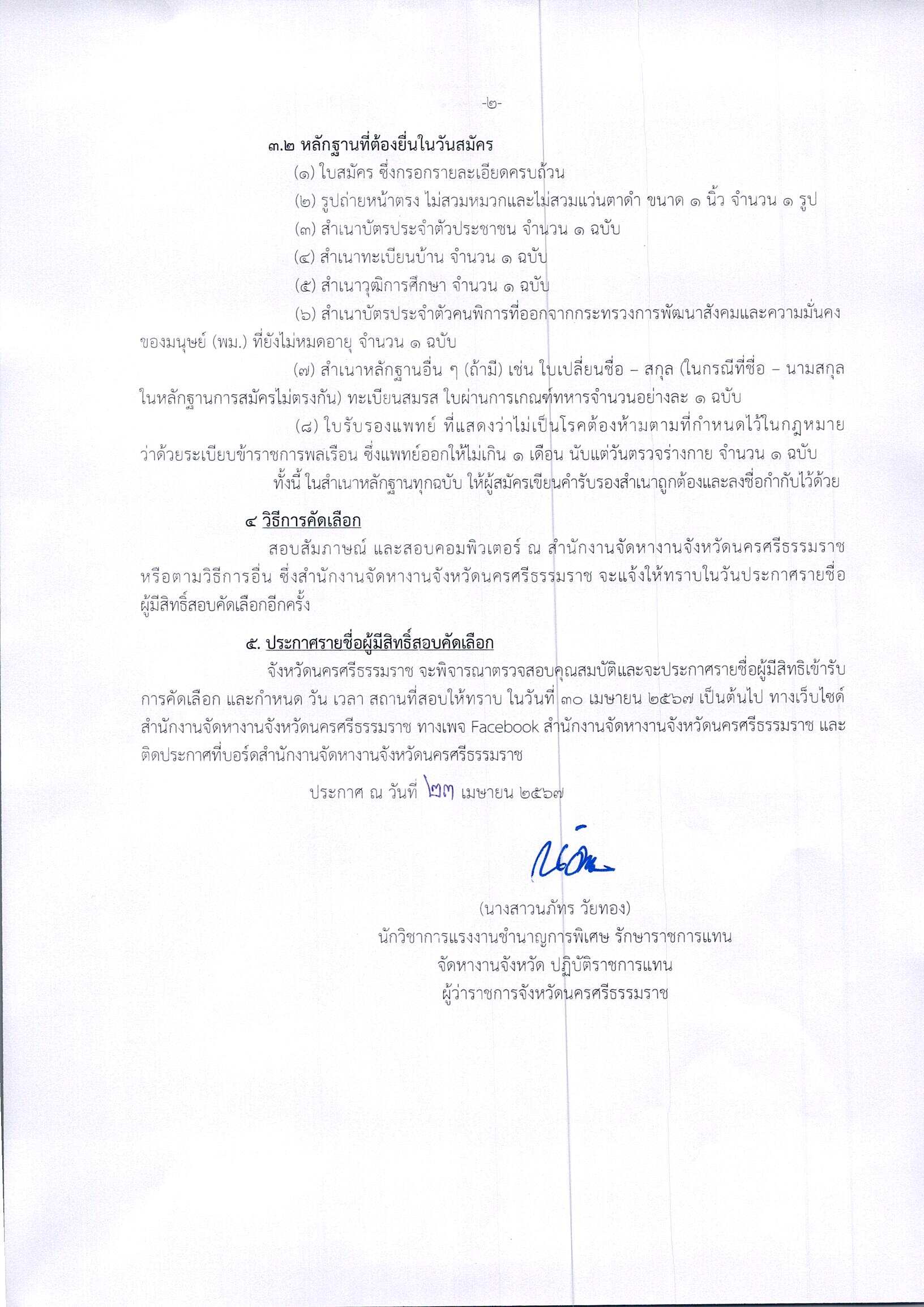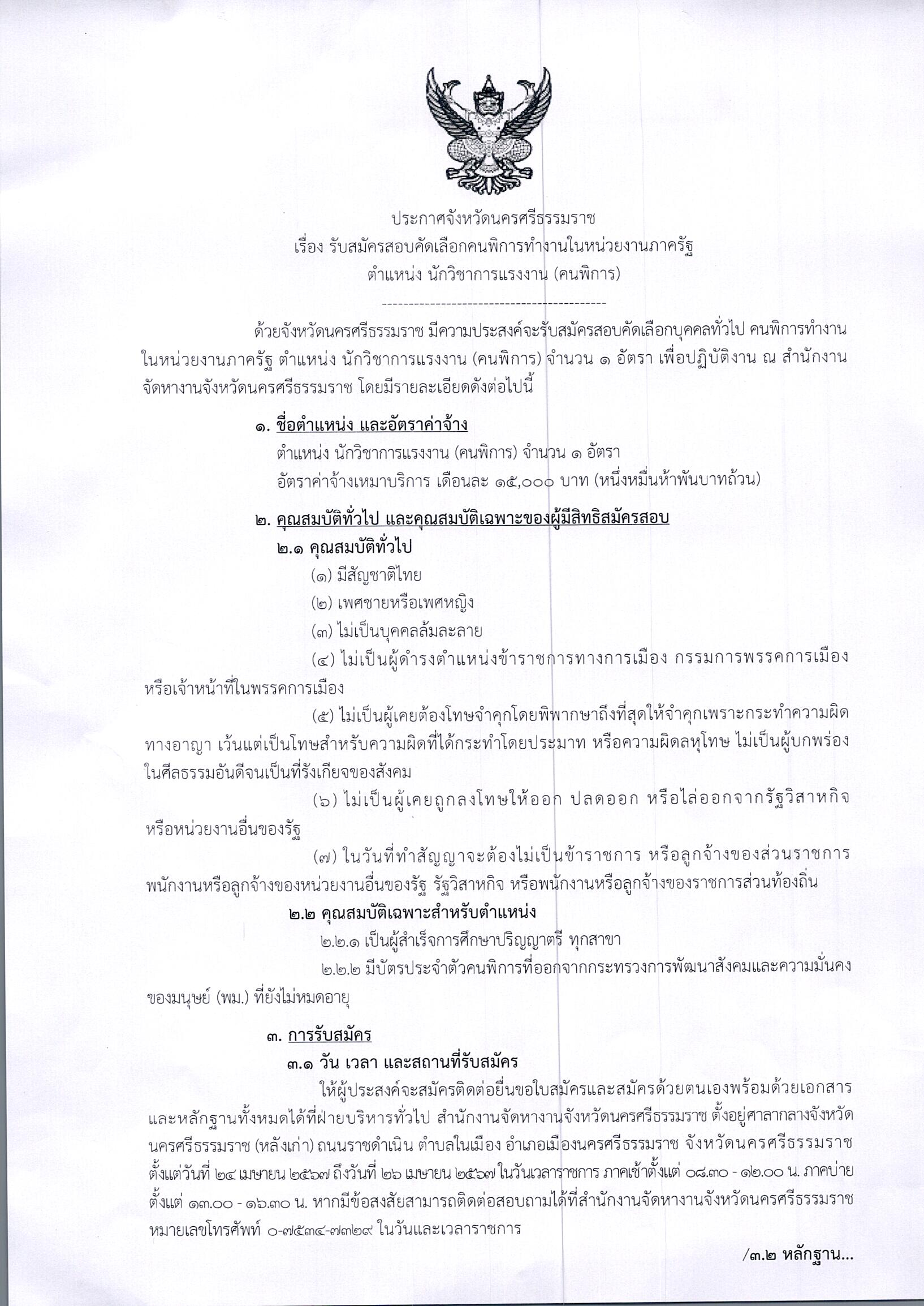 ประกาศจัหวัดนครศรีธรรมราช เรื่อง รับสมัครสอบคัดเลือกคนพิการทำงานในหน่วยงานของภาครัฐ ตำแหน่ง นักวิชาการแรงงาน (คนพิการ)