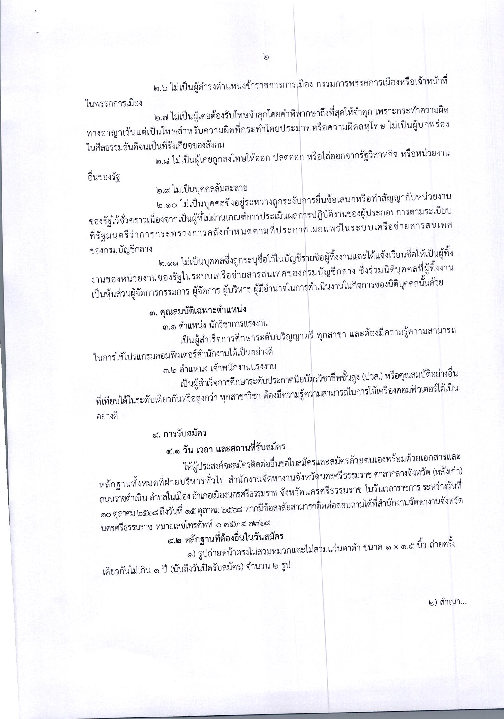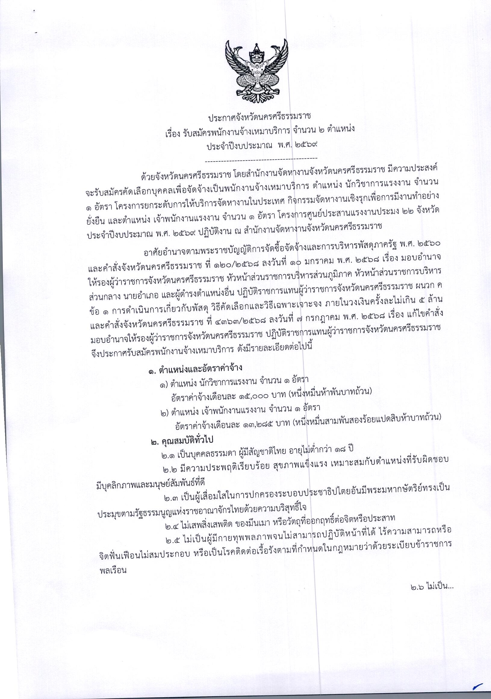 สำนักงานจัดหางานจังหวัดนครศรีธรรมราช ประชาสัมพันธ์รับสมัครพนักงานจ้างเหมาบริการ จำนวน 2 ตำแหน่ง ประจำปีงบประมาณ พ.ศ.2569 ปฏิบัติงาน ณ สำนักงานจัดหางานจังหวัดนครศรีธรรมราช
