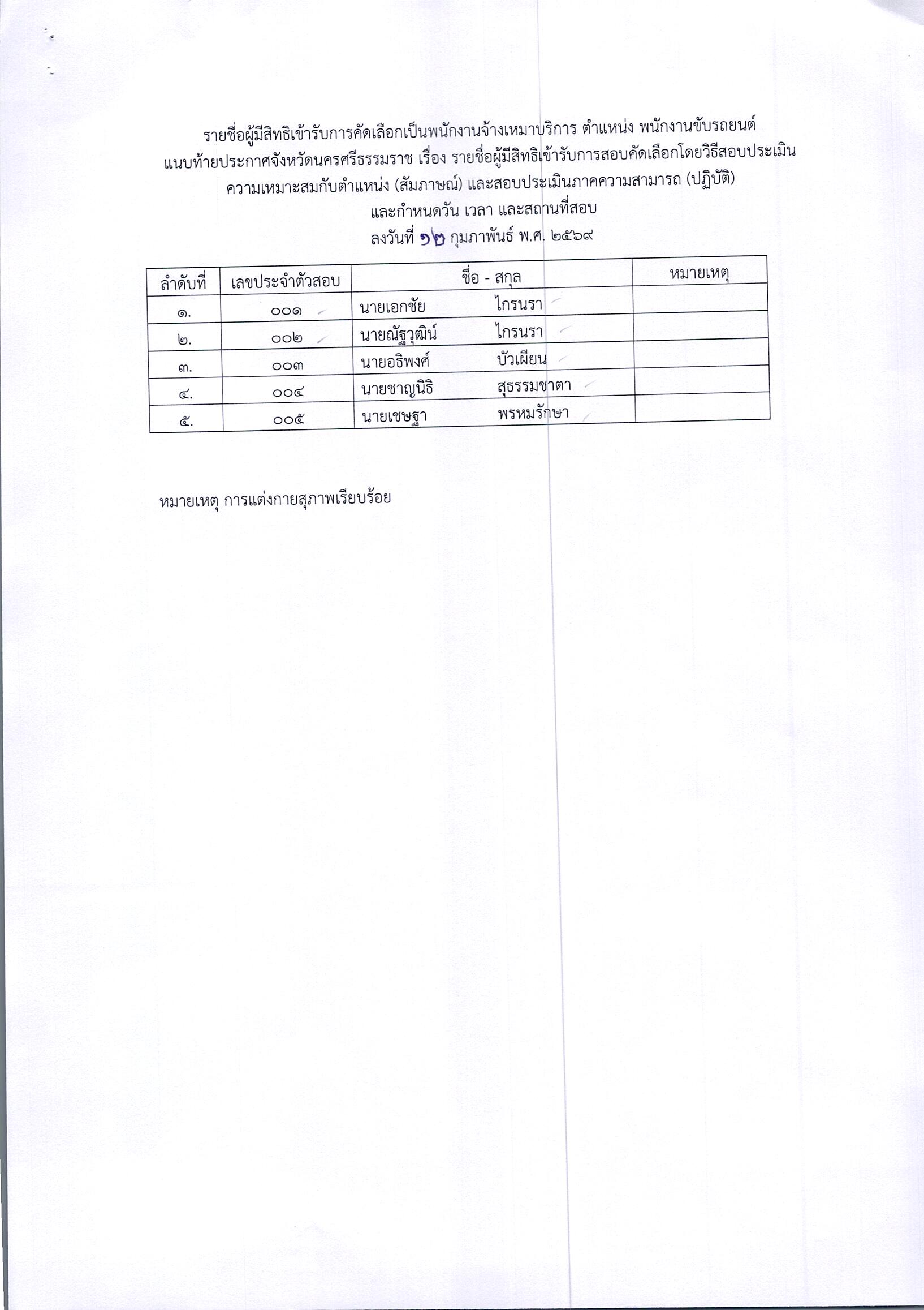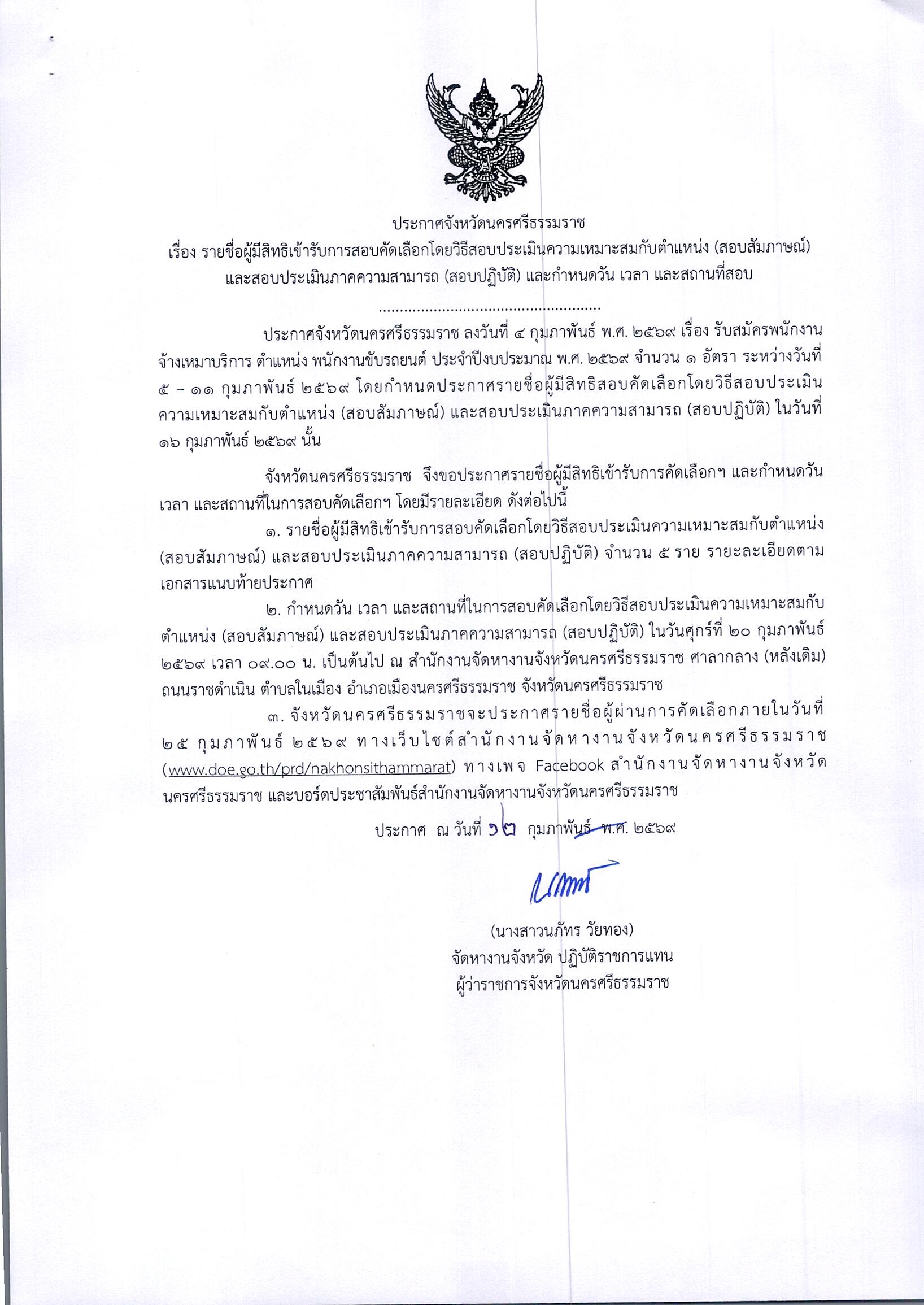 สำนักงานจัดหางานจังหวัดนครศรีธรรมราช ประกาศรายชื่อผู้มีสิทธิเข้ารับการสอบคัดเลือกโดยวิธีสอบประเมินความเหมาะสมกับตำแหน่ง (สอบสัมภาษณ์) และสอบประเมินภาคความสามารถ (สอบปฏิบัติ) และกำหนดเวลา และสถานที่สอบ