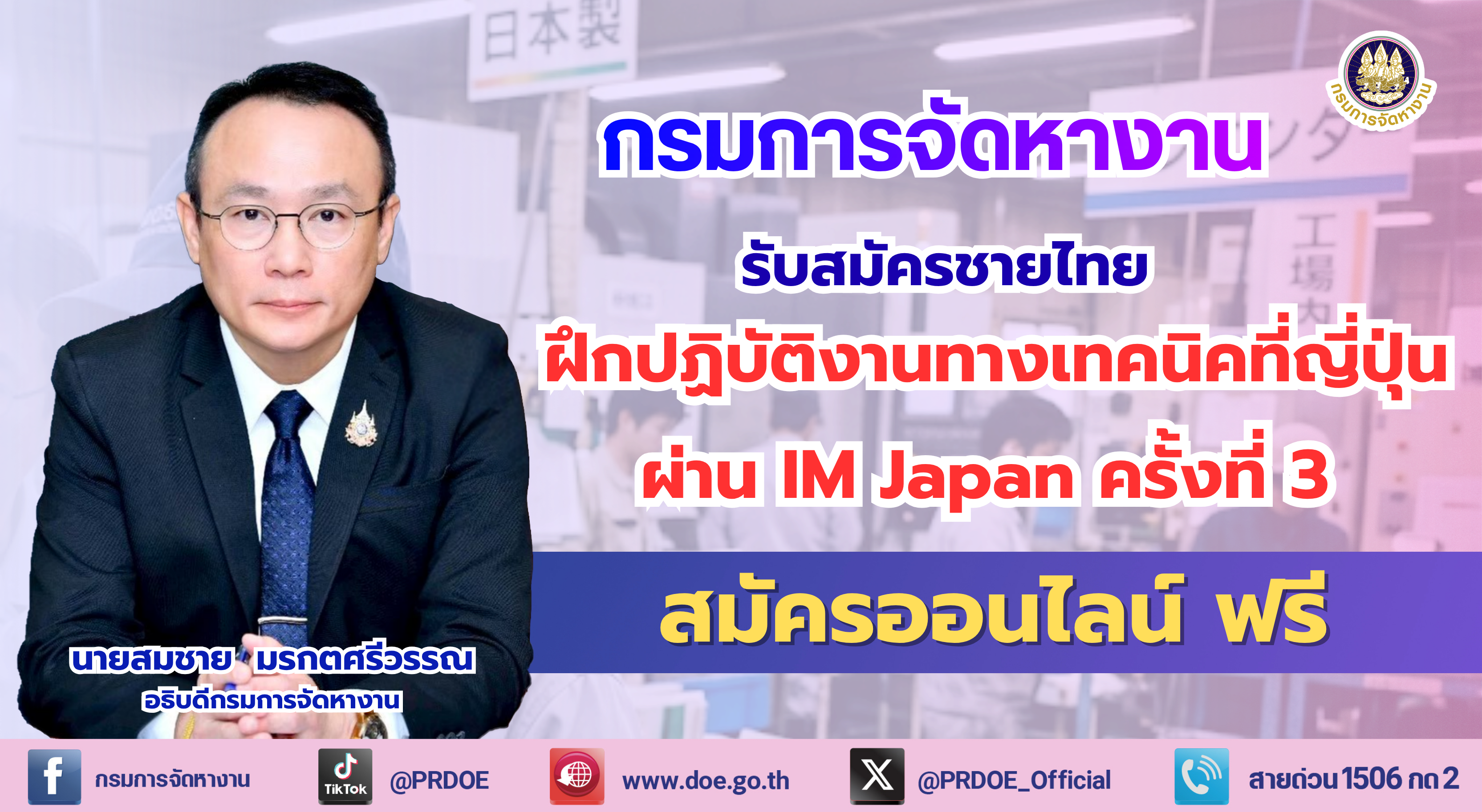 นายสมชาย มรกตศรีวรรณ อธิบดีกรมการจัดหางาน เปิดเผยว่า กรมการจัดหางาน เปิดรับสมัครคัดเลือกผู้ฝึกงานเทคนิคคนไทยไปฝึกงาน ณ ประเทศญี่ปุ่น ผ่านองค์กร IM Japan ประจำปี 2569 ครั้งที่ 3 (เพศชาย) ในประเภทงานอุตสาหกรรมการผลิตและอุตสาหกรรมก่อสร้าง โดยแบ่งการรับสมัครออกเป็น 4 รอบ ได้แก่ รอบที่ 1 วันที่ 1 - 31 พฤษภาคม 2569 รอบที่ 2 วันที่ 1 - 30 มิถุนายน 2569 รอบที่ 3 วันที่ 1 - 31 กรกฎาคม 2569 และรอบที่ 4 วันที่ 1 - 31 สิงหาคม 2569 สมัครได้โดยไม่เสียค่าใช้จ่าย พร้อมสิทธิประโยชน์ อาทิ ตั๋วเครื่องบินไป - กลับฟรี เบี้ยเลี้ยงเดือนแรก 80,000 เยน หรือประมาณ 16,141 บาท ฟรี ค่าที่พัก ค่าน้ำ ค่าไฟ เดือนที่ 2 ถึงเดือนที่ 36 จะได้ค่าจ้างไม่น้อยกว่าอัตราค่าจ้างขั้นต่ำที่กฎหมายญี่ปุ่นกำหนด ประมาณ 170,000 เยนต่อเดือน หรือประมาณ 34,312 บาท เมื่อสำเร็จการฝึกปฏิบัติครบ 3 ปี จะได้รับประกาศนียบัตรรับรองการฝึกงานทางเทคนิค และเงินสนับสนุนการประกอบอาชีพ จำนวน 600,000 เยน หรือประมาณ 121,055 บาท (ขึ้นกับอัตราแลกเปลี่ยน) เพื่อเป็นค่าใช้จ่ายในการประกอบอาชีพเมื่อเดินทางกลับประเทศไทย ผู้ที่สนใจสามารถสมัครสอบได้ที่เว็บไซต์ toea.doe.go.th ตลอด 24 ชั่วโมง และไม่เว้นวันหยุดราชการ